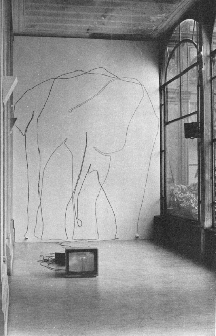 The first video exhibition mounted at Swiss Institute, Space and Memory featured video installations by two young artists, Marie José Burki and Alexander Hahn. Curated by Swiss Institute director Ziba de Weck, the exhibition explored the titular themes in three works and was particularly invested in the ways in which Burki’s studies in literature and the Hahn’s studies in psychology, sociology, linguistics, and computer science informed their productions. In the exhibition’s catalogue, de Weck wrote, “Video art is a time-based art. Moving into time—past, present, and future—engenders endless possibilities of manipulating space—real or fictive—and dealing with countless recollections and memories.” Burki presented two installations centered on the concept that “an elephant never forgets.” Operation Edison (1986) recalls Thomas Edison’s story of electrocuting an elephant to demonstrate electrical power: two electrical cables, one negative and one positive, created an enormous line drawing of an elephant on the wall. On the floor below it was a monitor playing a video of clouds that transformed periodically into an image of an electric bulb. In Untitled (1986), a monitor displaying images of objects moving at various speeds sat on the ground beside a video player and loudspeakers wrapped in the electrical cables that fed the equipment; the resulting object resembled an elephant paw. Hahn’s installation, Urban Memories (1986–87), was composed of three monitors and two players, featuring a tape that moves through architectural structures, hallways, and rooms, which appear and disappear, and then meet, on their recursive trajectories, images of a nuclear war aftermath.