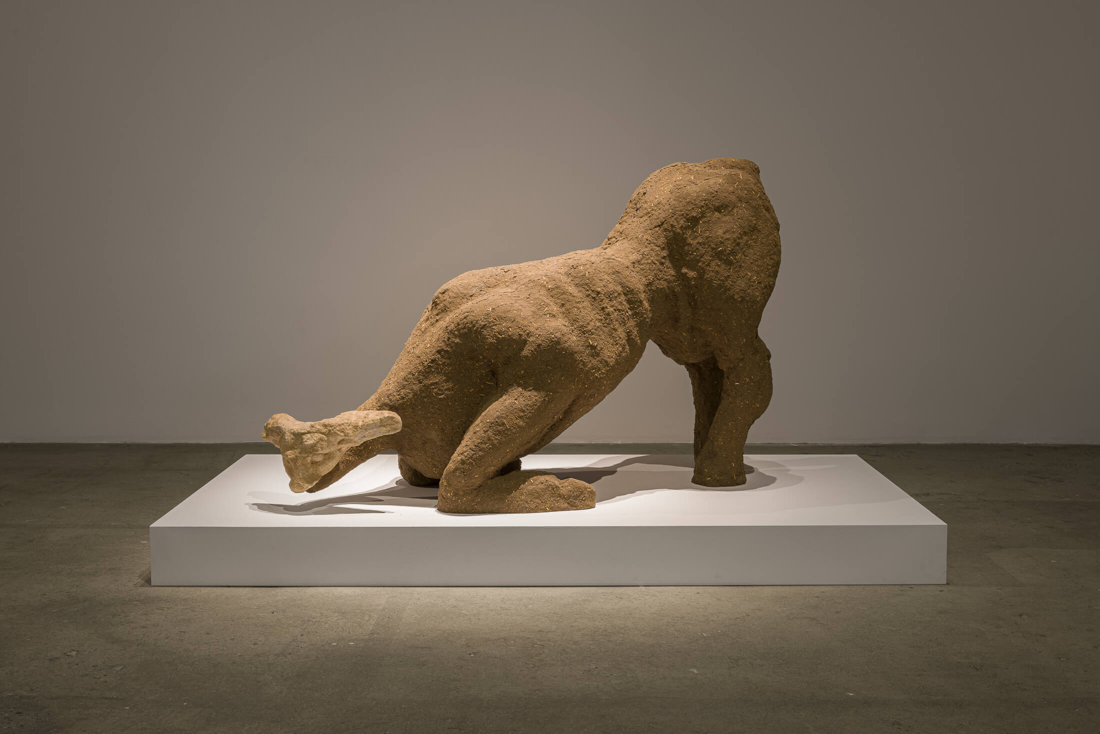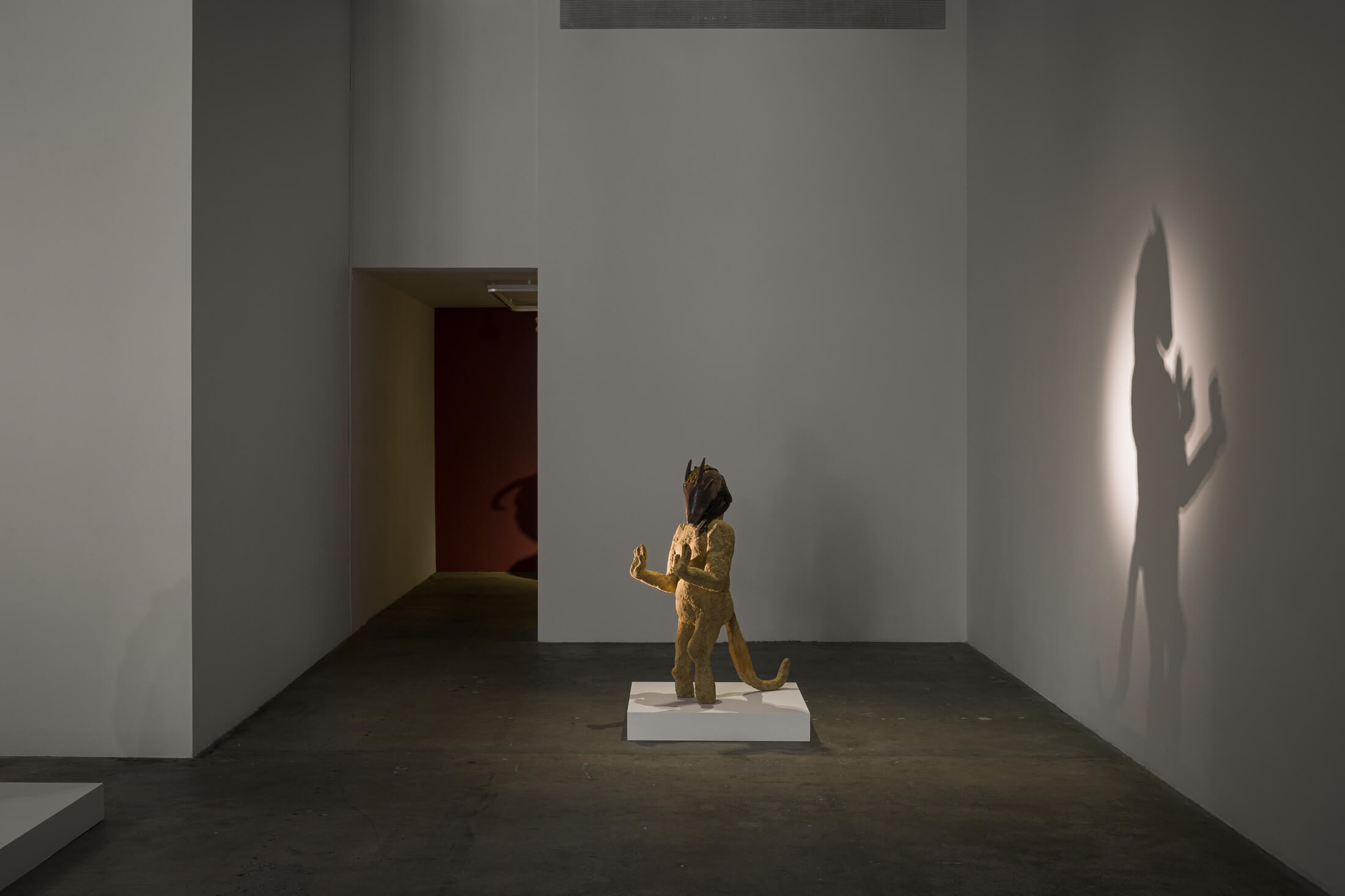 On the first floor of Humble and quiet and soothing as mud, a newly commissioned sculptural installation is fleetingly animated by a choreography of moving lights, retelling the myth of Gilgamesh in a scene surrounding the fabled figure with other characters from the epic poem. In Mesopotamian mythology, Gilgamesh’s rival-turned-companion Enkidu is formed from clay and water to help the semi-mythic king of Uruk on his ventures to achieve immortality. The bodies of Cherri’s sculptures are composed of mud, with masks and fragments of found objects serving as their faces. Cherri buys these sculptural fragments in auctions, where prices fluctuate with changing desires for the objects on sale, mirroring their economic value as cultural artifacts and their political potency in recent discussions of reparations. These objects, which are often forged and then smuggled abroad, are less a question of cultural authenticity for Cherri than about the perpetuation of a lived tradition – an unfixing of these objects from the grips of archaeological time. Yet mud is the material that best preserves archeological finds. What memories might be held by its shifting topographies?