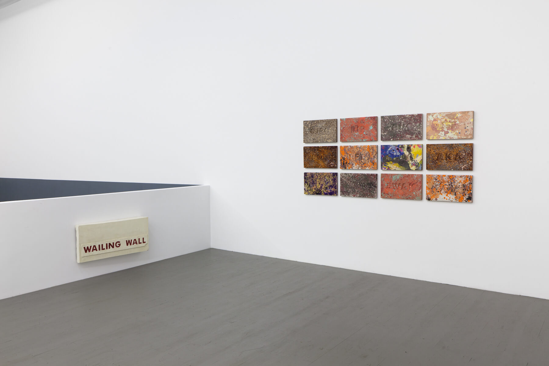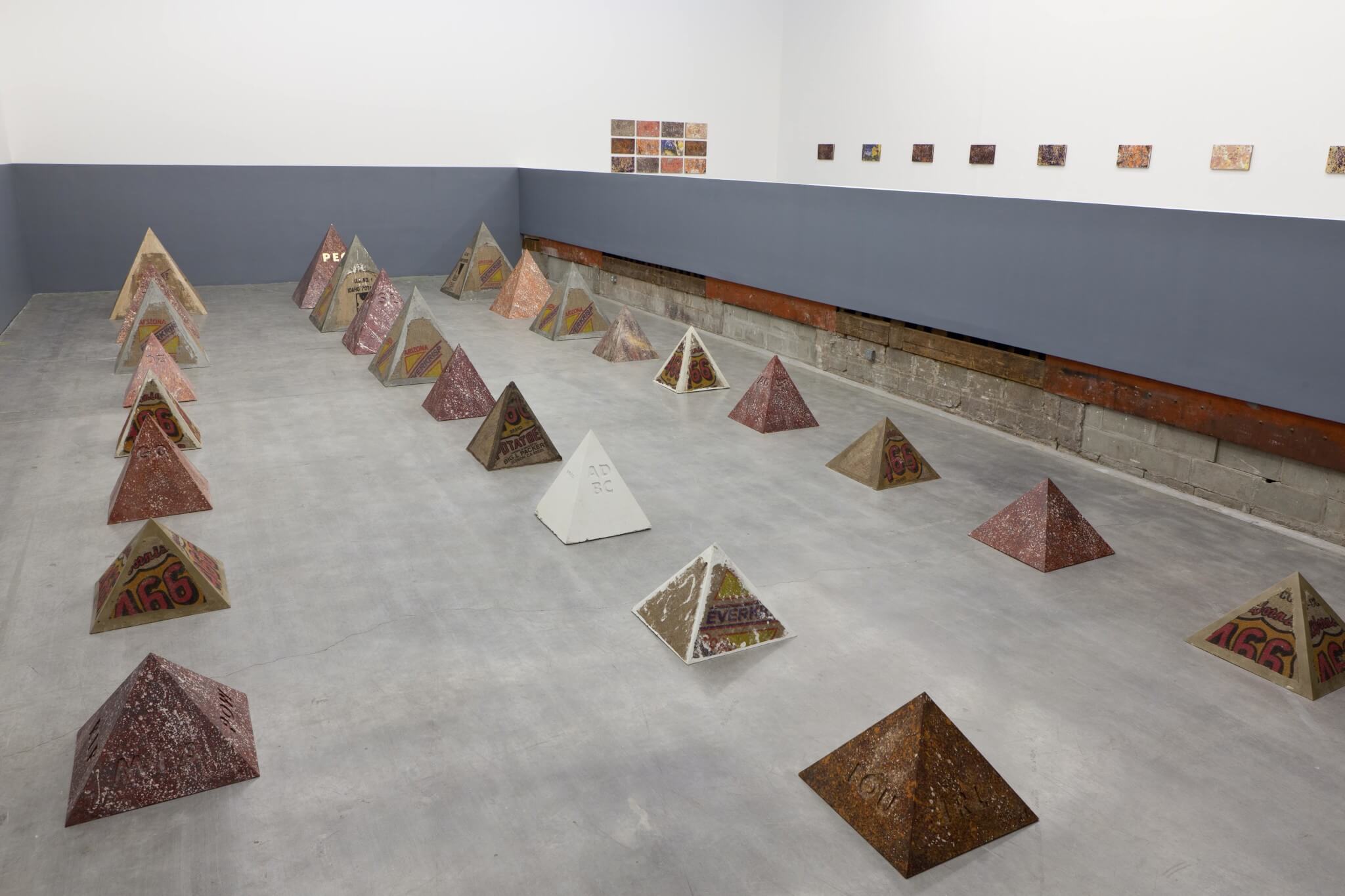 Behind an obfuscating wall in Swiss Institute's main gallery, O'Neill's site-specific installation emerges: nine rows of hydrocal and burlap pyramids rise up several feet from the gallery floor. The pyramids, referencing scenes from the Holy Land video, are emblazoned with symbols referencing tweets, slang, and text-messages, shorthand that is recognizable yet cryptic. Language and position are combined, mummifying the currents of time.