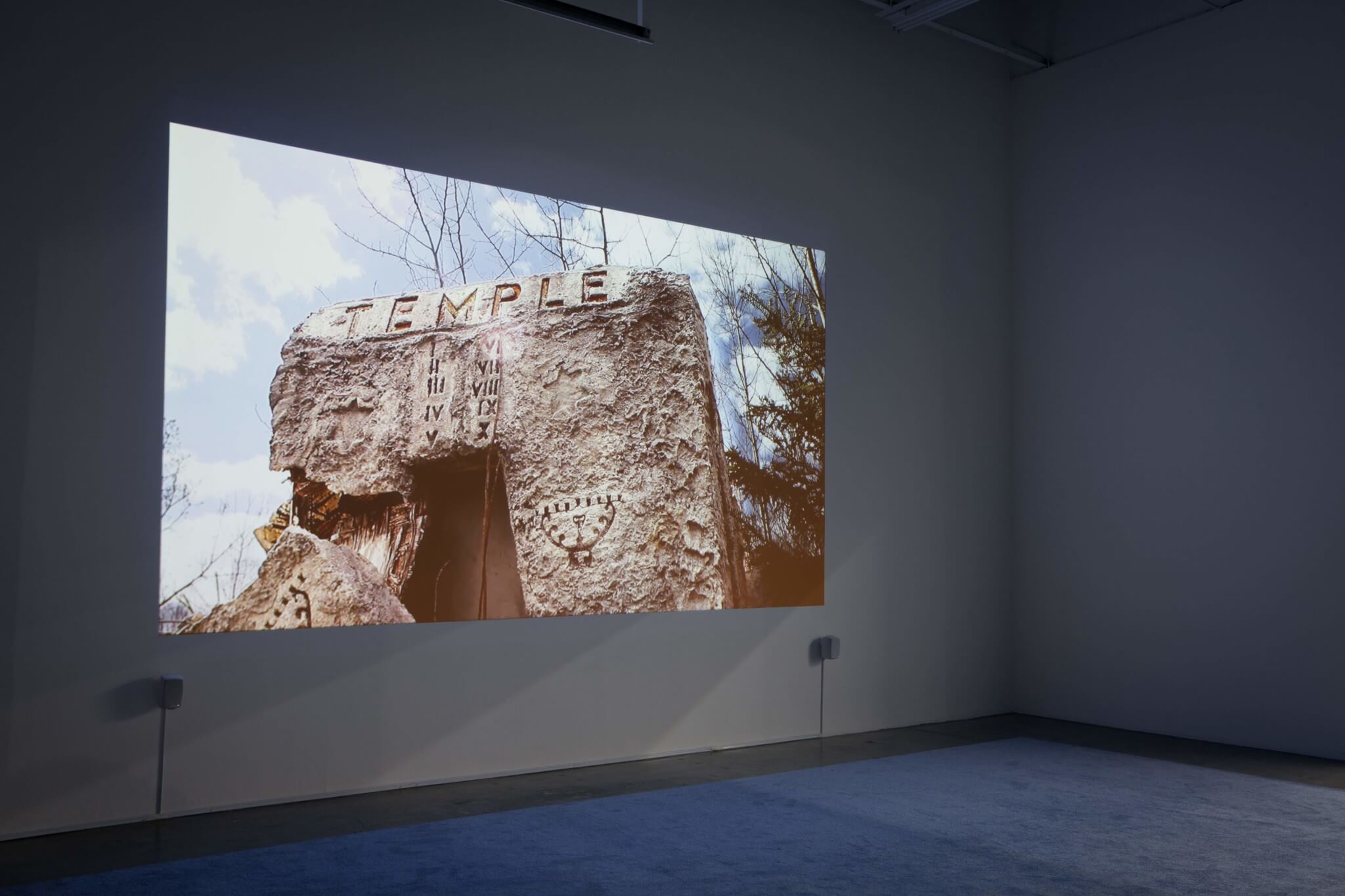 The exhibition's title, HLUSA, is an initialism referencing Holy Land USA, an abandoned 18-acre theme park in Waterbury, Connecticut. The attraction is featured in a large-scale video projection in Swiss Institute's lobby. Visitors to the exhibition can view O’Neill’s footage of the now-decaying Biblical wonderland from a raised platform that is normally used as the gallery's office. The camera lingers over Egyptian and Israelite inspired architecture, constructed from cinderblocks and discards. Glossy white paint, a hand painted signage, and white curtains on Swiss Institute's exterior usher visitors into this video-viewing "chapel."