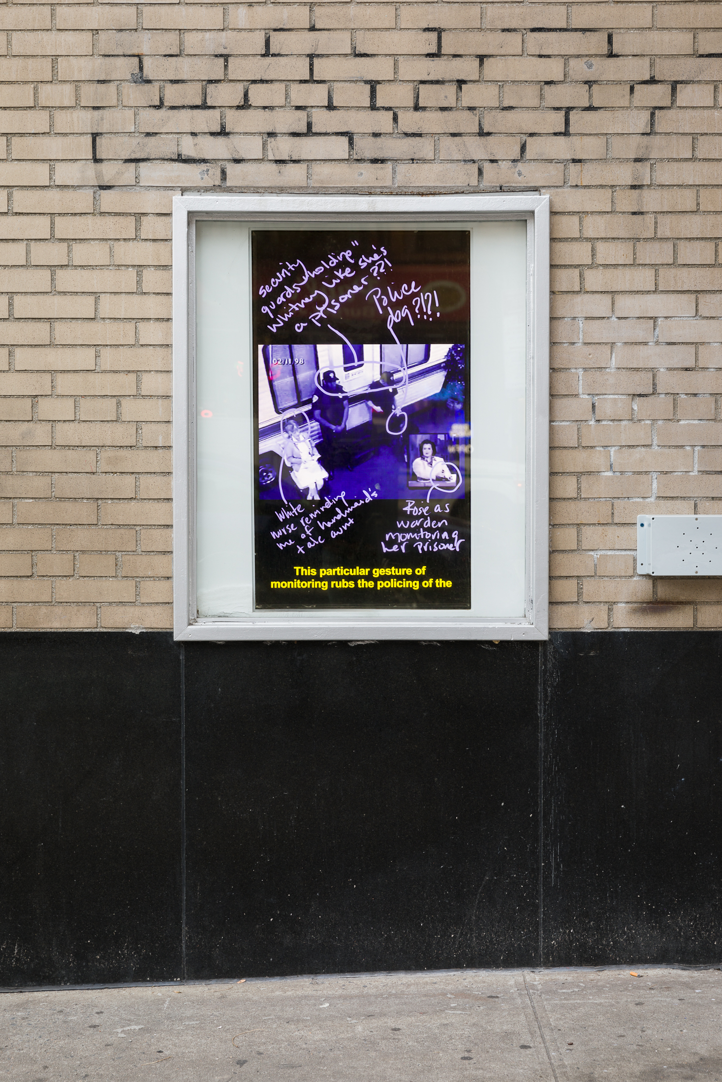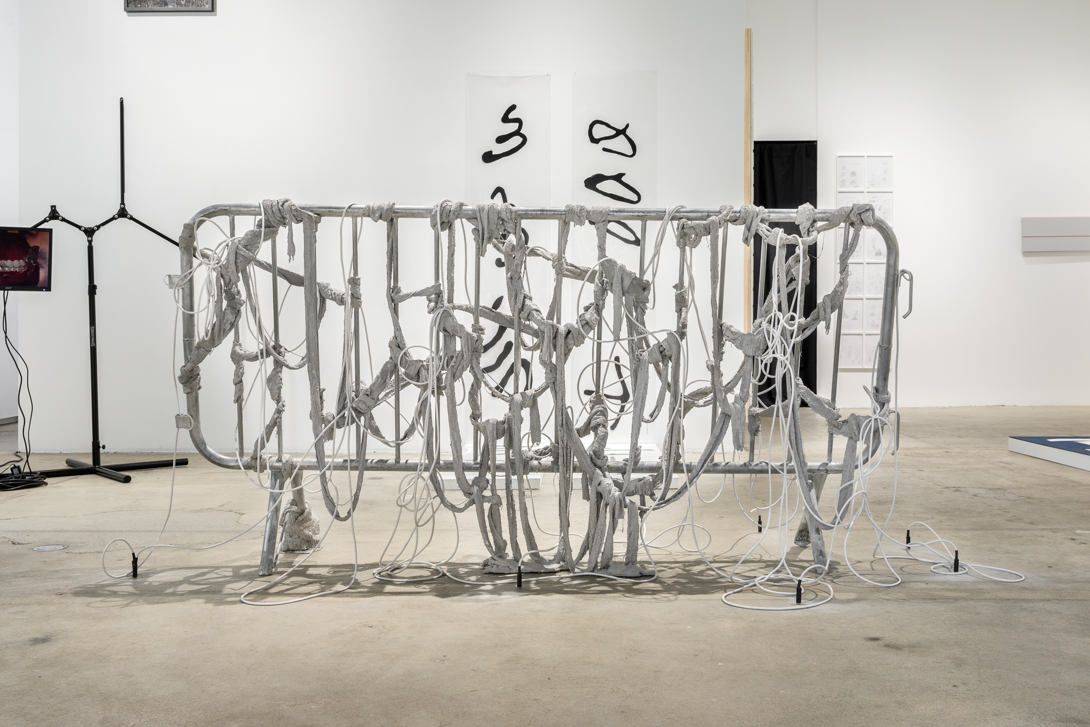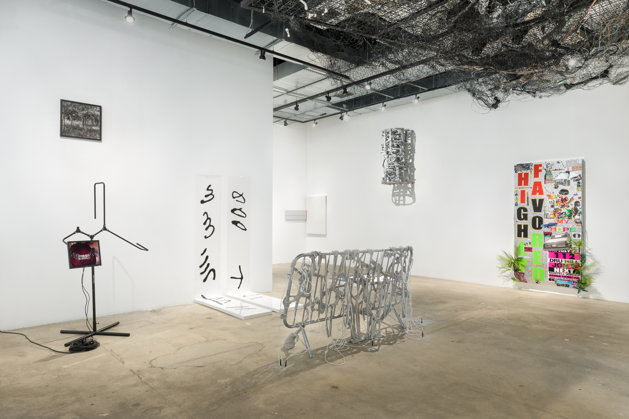 Spilling onto the sidewalk, a newly commissioned video by E. Jane features the artist orally annotating a segment from a 1998 episode of The Rosie O’Donnell Show in which Whitney Houston is surveilled by the show’s production team. Voices continue to circulate in the gallery in registers both human and synthetic. In a video by Carolyn Lazard, a protagonist recounts a disquieting memory, while a desktop monitor in Sondra Perry’s Title TK 5 regurgitates legalese. The cumulative power of mark-making can be felt in contributions by Steffani Jemison, Patricia Satterwhite and Lauren Halsey, orienting archival impulses towards possible futures. A small sculpture by Cudelice Brazelton IV emits the ambient sounds of a river and construction site set thousands of miles apart, while, nearby, three sculptures by Lydia Ourahmane absorb and transmit the sounds of the gallery. Laid on the floor and situated in a corner, respective works by Jessica Vaughn and Jennie C. Jones invite considerations of silence, using surfaces and peripheries to acknowledge voids. Photographs by Carrie Mae Weems and drawings by Christine Sun Kim reveal the chasms left by acts of translation and question what might grow in these gaps. Industrial frameworks are integrated into sculptures by Abigail DeVille and Nikita Gale; within them, materials weave, hang and envelop, illustrating sound as a means of circumvention. In response to the installation, Smith has produced Duets, a booklet containing seven newly commissioned texts by Sampada Aranke, Atheel Elmalik, Amarie Gipson, Hanna Girma, Yelena Keller, Keli Safia Maksud and Rachell Morillo, as well as an introduction by Smith.