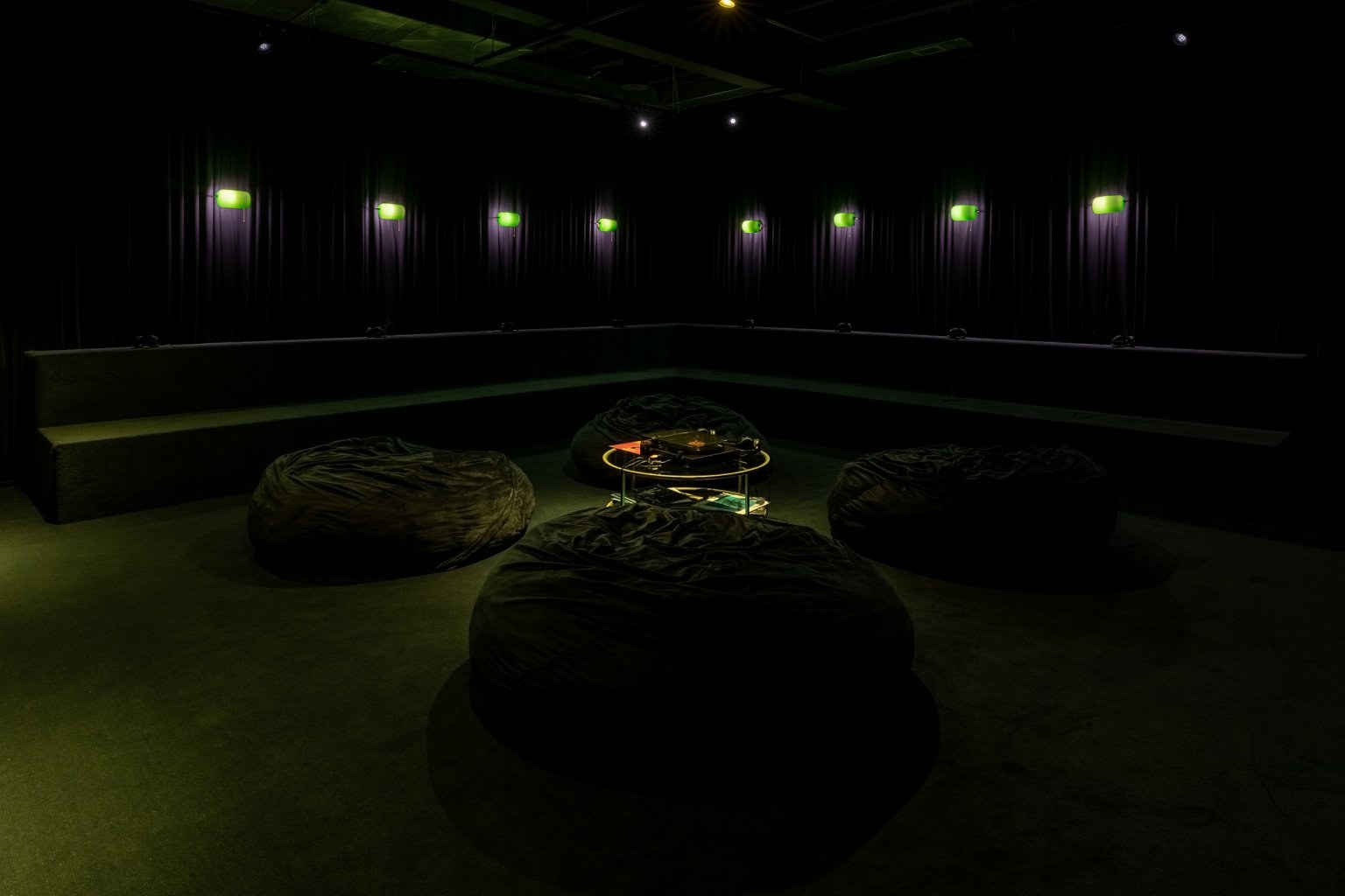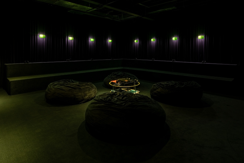 The second floor of SI is a room for listening and a venue for monthly live performances of the exhibition’s score. Conceived by Smith, composer Tariq Al-Sabir, and vocalist and artist Freddie June, the triadic composition functions as another text, a B-side to the exhibition’s forthcoming catalogue, that draws from principles of improvisation and looping to create capaciousness. Its three segments, “The Storm,” “The Belly,” and “The Reemergence,” consist of a freedom song written by Freddie June that is continuously stretched and reshaped. The score looks to the essence of wailing, shouting, screaming, inhaling and exhaling, “those things we do with the breath,” writes Smith, that make the unspeakable corporeal, that make life rather than noise. Playlists and recordings made by artists in the exhibition are embedded in risers, and a record player prepared for two listeners plays host to a collection of vinyl selected by Smith. Saturated in sound, the exhibition itself becomes an architecture in which noises bleed and stories are told.