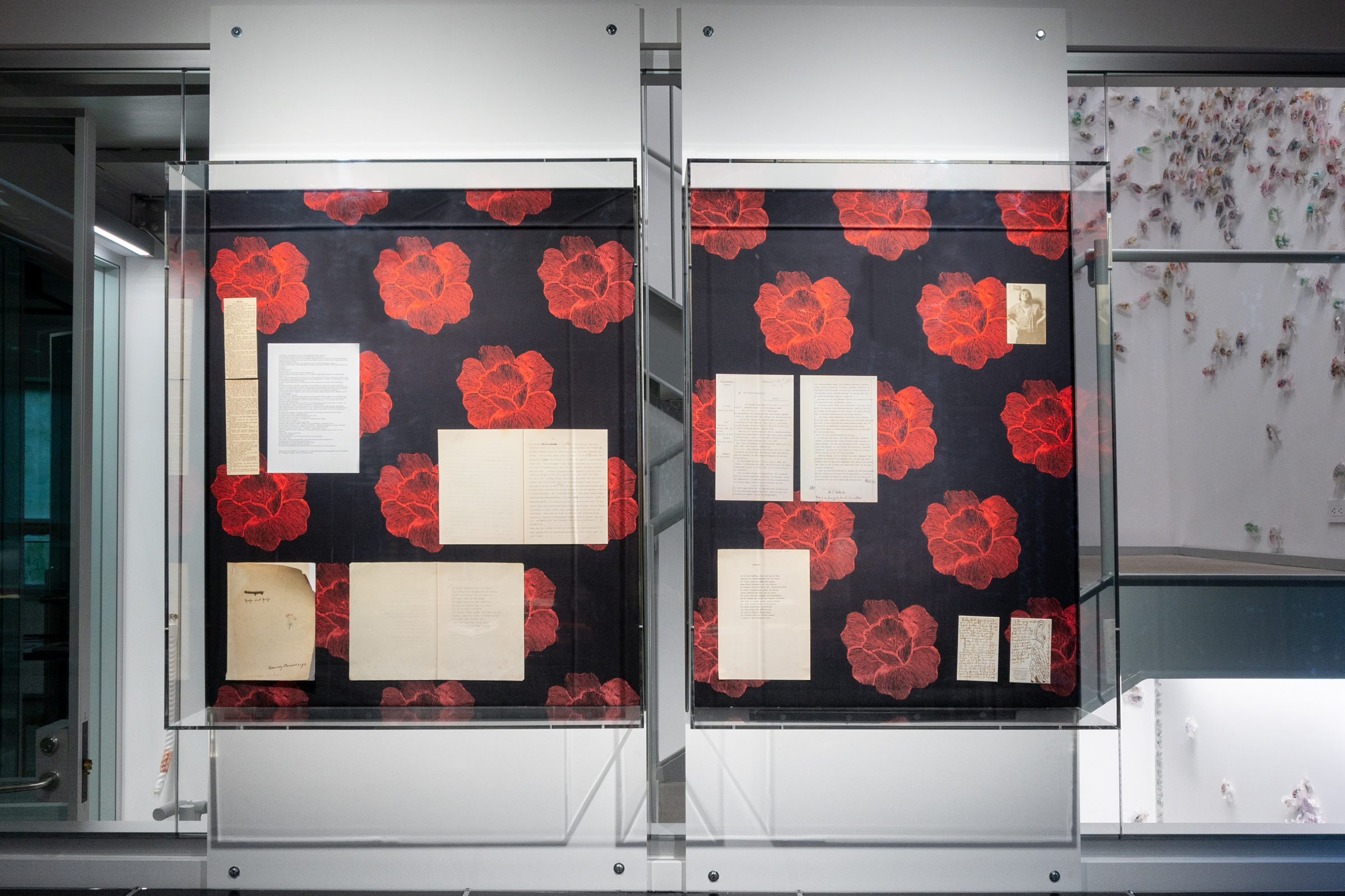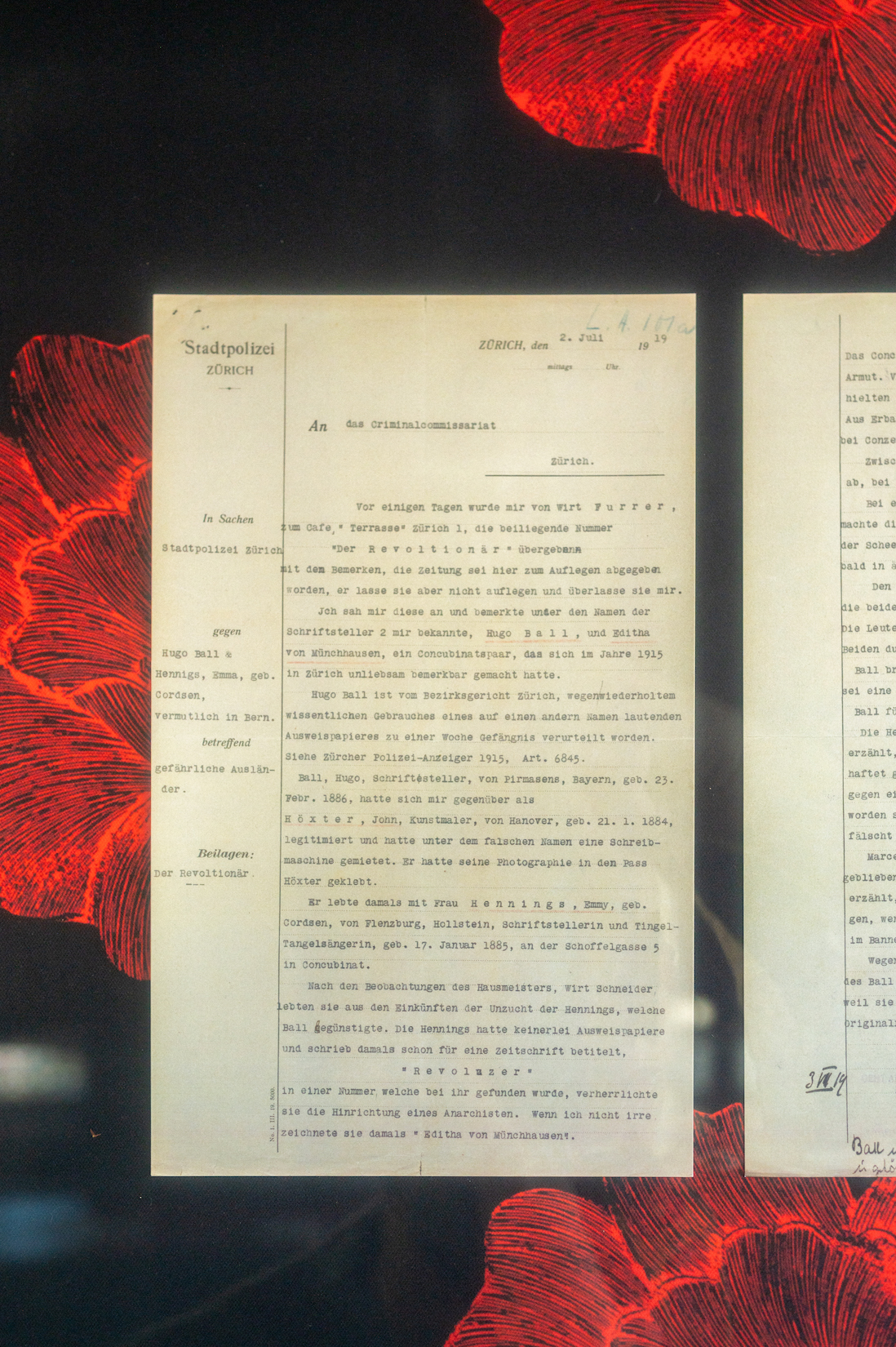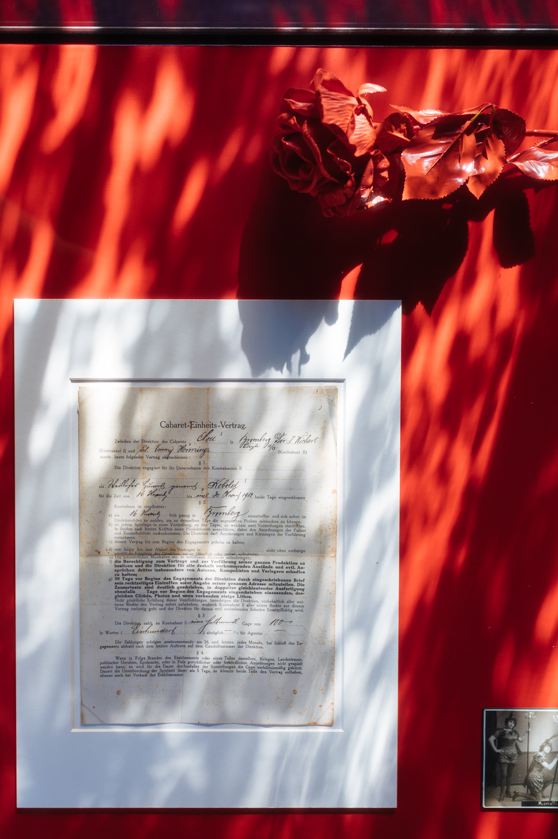 Hennings’s archive is here drawn into an associative dialogue with the work of Sitara Abuzar Ghaznawi, who has created vitrines, showcases and other presentation devices. Situating Hennings’s work within the materiality of cabaret performance, Ghaznawi employs plastic roses, red PVC and lace fabrics that evoke aesthetics of fetishism and sex. In drawing attention to the power of framing and display to shape narrative, histories and knowledge production, Ghaznawi highlights the inherent questions of value at stake in preservation and memorial.