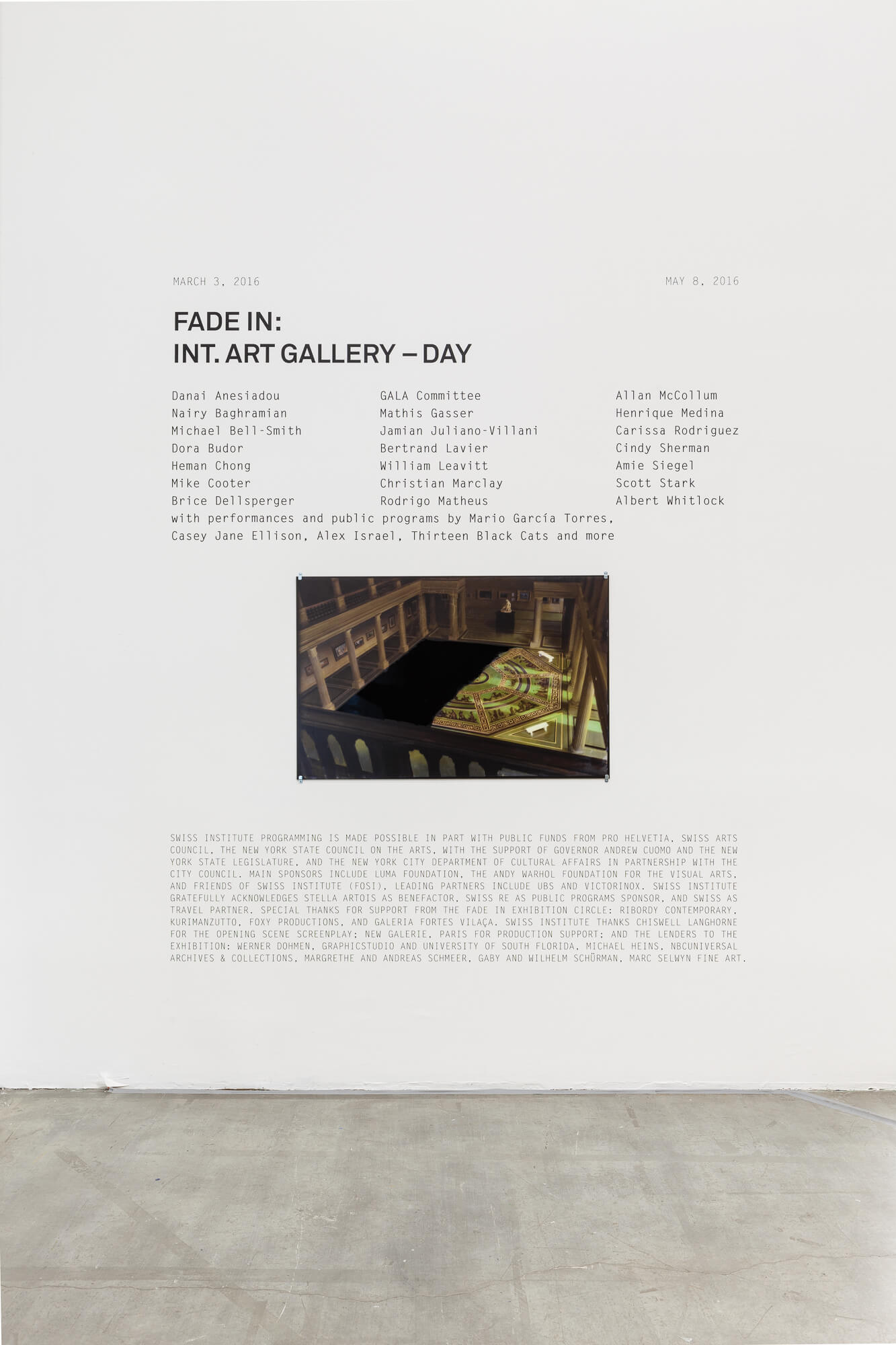 SWISS INSTITUTE PROGRAMMING IS MADE POSSIBLE IN PART WITH PUBLIC FUNDS FROM PRO HELVETIA, SWISS ARTS COUNCIL, THE NEW YORK STATE COUNCIL ON THE ARTS, WITH THE SUPPORT OF GOVERNOR ANDREW CUOMO AND THE NEW YORK STATE LEGISLATURE, AND THE NEW YORK CITY DEPARTMENT OF CULTURAL AFFAIRS IN PARTNERSHIP WITH THE CITY COUNCIL. MAIN SPONSORS INCLUDE LUMA FOUNDATION, THE ANDY WARHOL FOUNDATION FOR THE VISUAL ARTS, AND FRIENDS OF SWISS INSTITUTE (FOSI), LEADING PARTNERS INCLUDE UBS AND VICTORINOX. SWISS INSTITUTE GRATEFULLY ACKNOWLEDGES STELLA ARTOIS AS BENEFACTOR, SWISS RE AS PUBLIC PROGRAMS SPONSOR, AND SWISS AS TRAVEL PARTNER. SPECIAL THANKS FOR SUPPORT FROM THE FADE IN EXHIBITION CIRCLE: RIBORDY CONTEMPORARY, KURIMANZUTTO, GALERIA FORTES VILAÇA, AND FOXY PRODUCTIONS. SWISS INSTITUTE THANKS CHISWELL LANGHORNE FOR THE OPENING SCENE SCREENPLAY; NEW GALERIE, PARIS FOR PRODUCTION SUPPORT; AND THE LENDERS TO THE EXHIBITION: WERNER DOHMEN, GRAPHICSTUDIO AND UNIVERSITY OF SOUTH FLORIDA, MICHAEL HEINS, NBCUNIVERSAL ARCHIVES & COLLECTIONS, MARGRETHE AND ANDREAS SCHMEER, GABY AND WILHELM SCHÜRMAN, MARC SELWYN FINE ART.