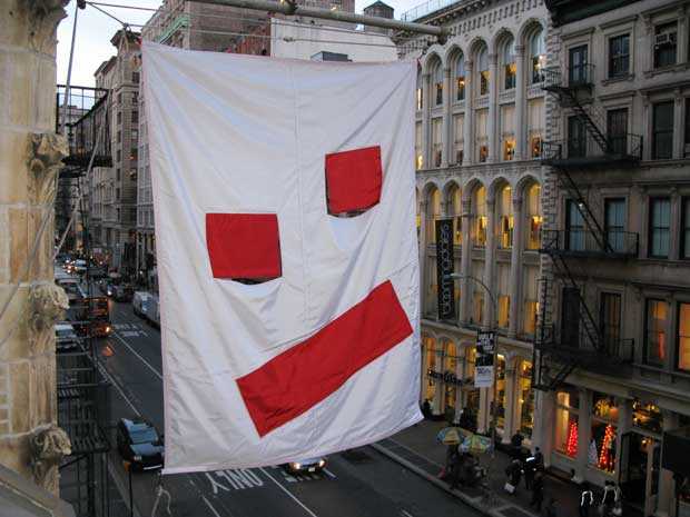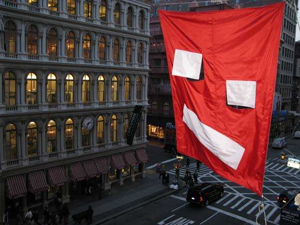 After the successful appropriations of Olaf Breuning and Olivier Mosset, the Swiss Institute commissioned Peter Regli to re-design its Swiss flag. Regli's work often explores the interactions between institutions and public situations. For the SI, he remixes the red and white of the Swiss flag into a two faceted design; in effect, the Swiss cross is shattered into pieces like a puzzle. While waving in the wind, this face may either grin or frown at you. www.realityhacking.com