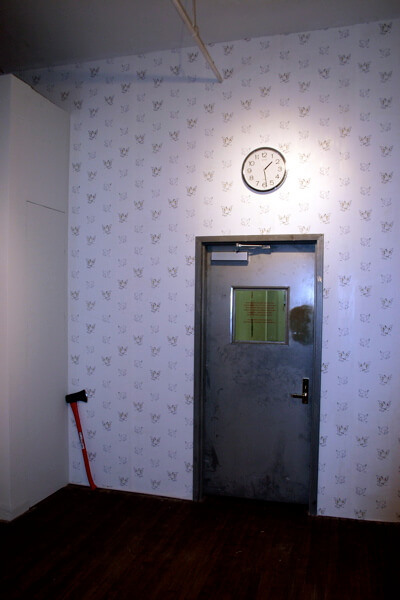 Fia Backström, Politisch Engagierte Kunst, wallpaper, fire axe with Jens Haaning, Baghdad clock