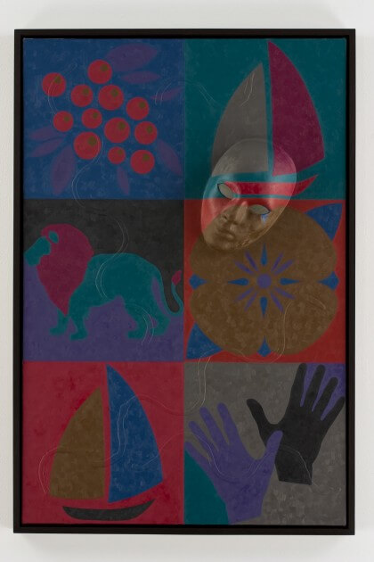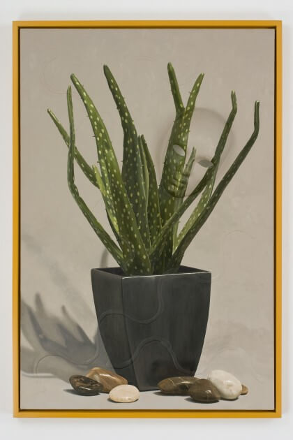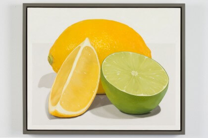 Smith's paintings are derived from his caricature of the decorative and the commonplace. The contents of the works--a houseplant, a beach towel, and a lemon-lime, for example-are deliberately spare as to make visible the mechanics of their making. Through a process of framing, outlining, flattening and layering, the artist re-appropriates mass produced design to provoke a formal examination of surface.