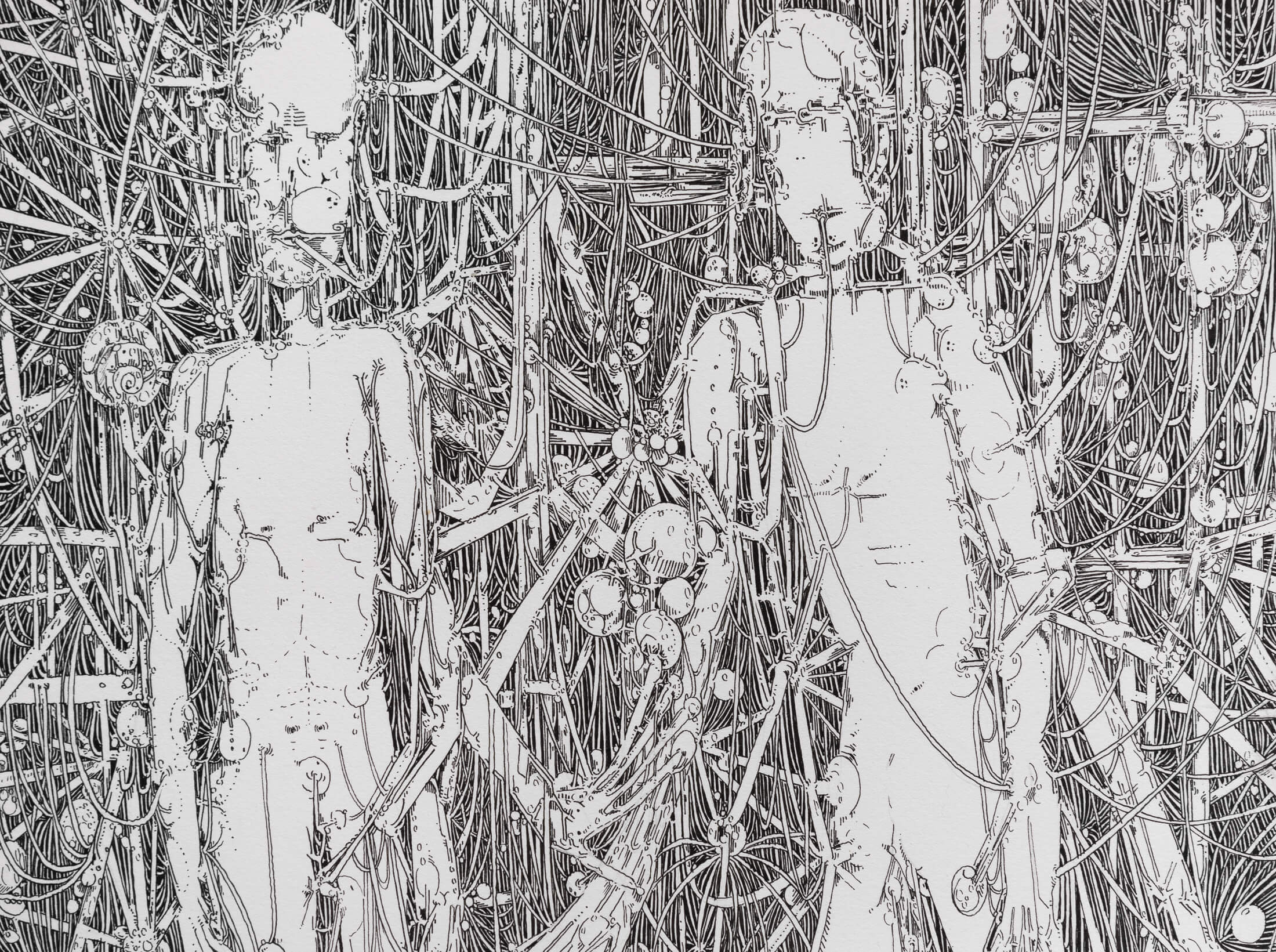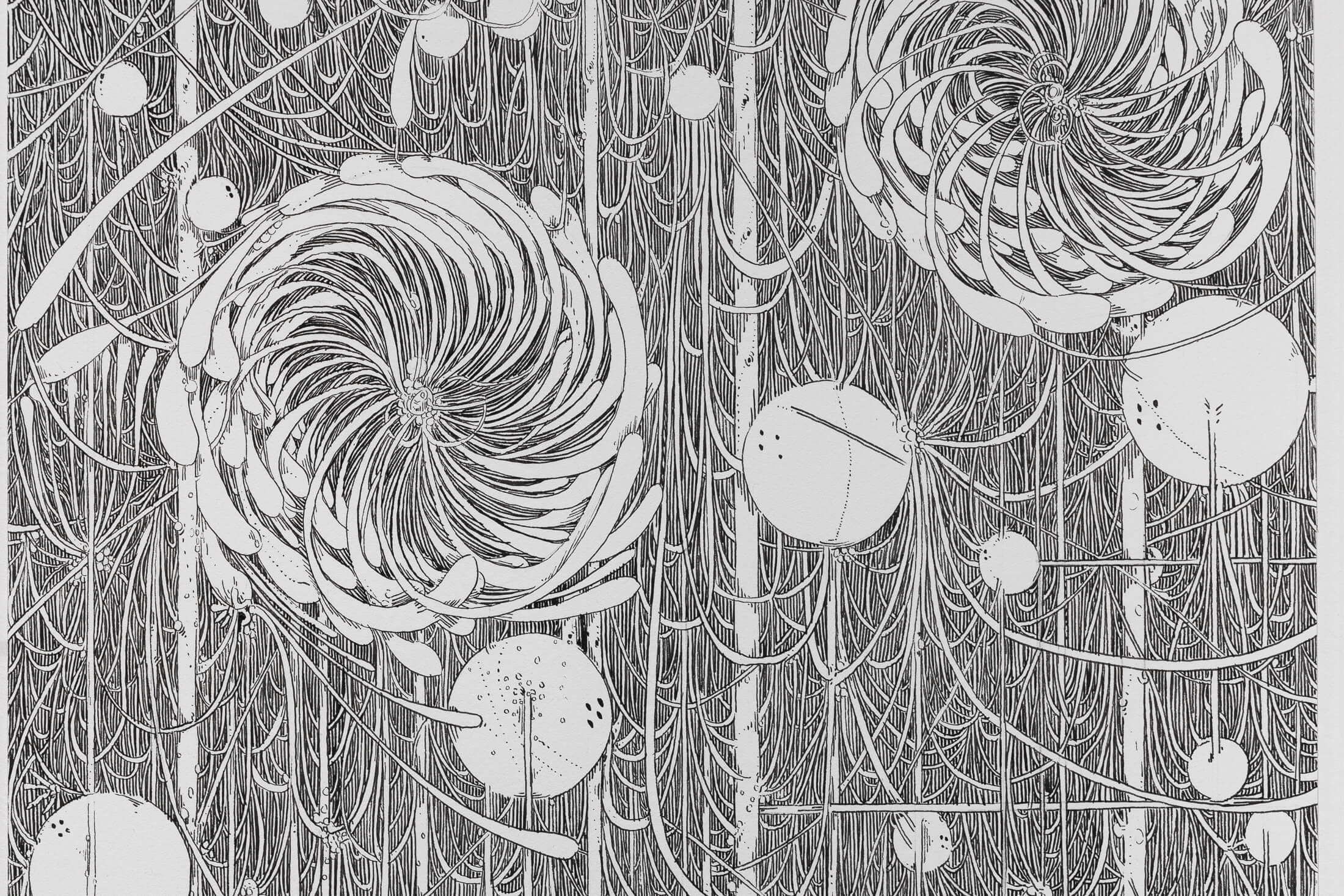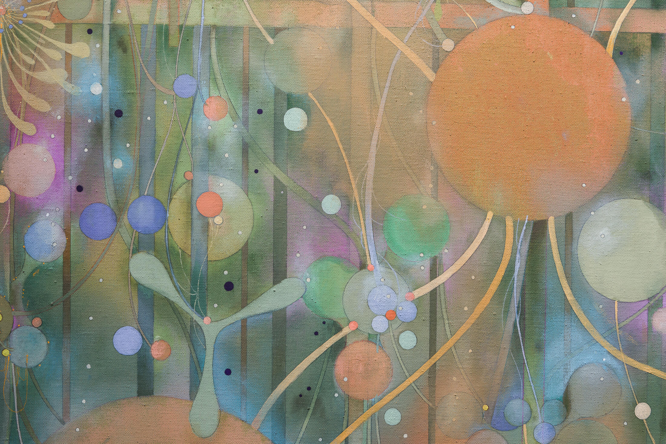 The exhibition invites visitors to linger and gaze into its kaleidoscopic networks, each of which possesses a harmony that suggests dreamy inertia. People rarely appear in Dénervaud’s work and when they do, they are usually suspended within the apparatus depicted. In Ozoned Station, each painting presents an opportunity to be subsumed by unfamiliar cycles of growth.