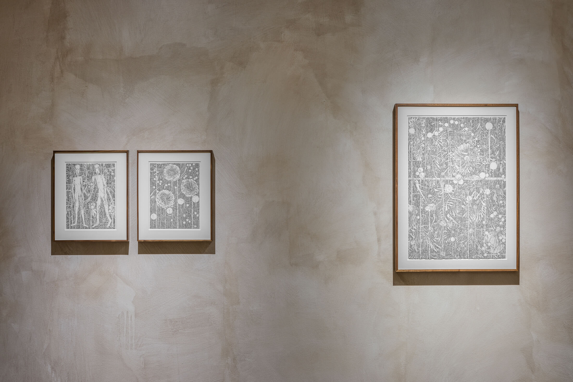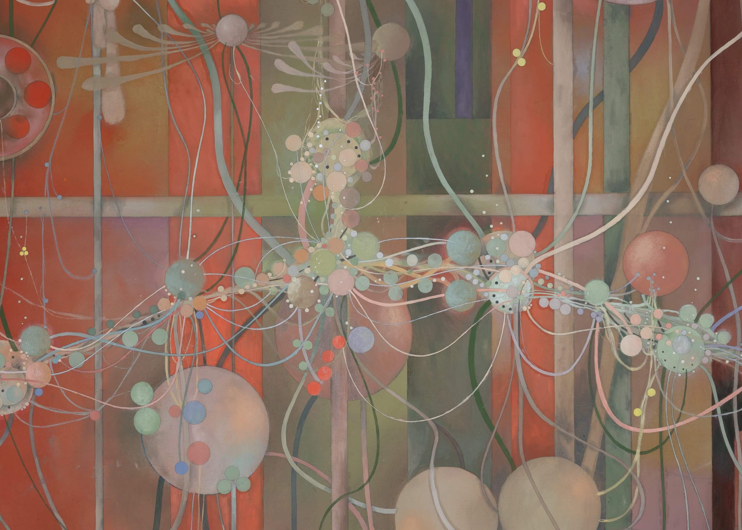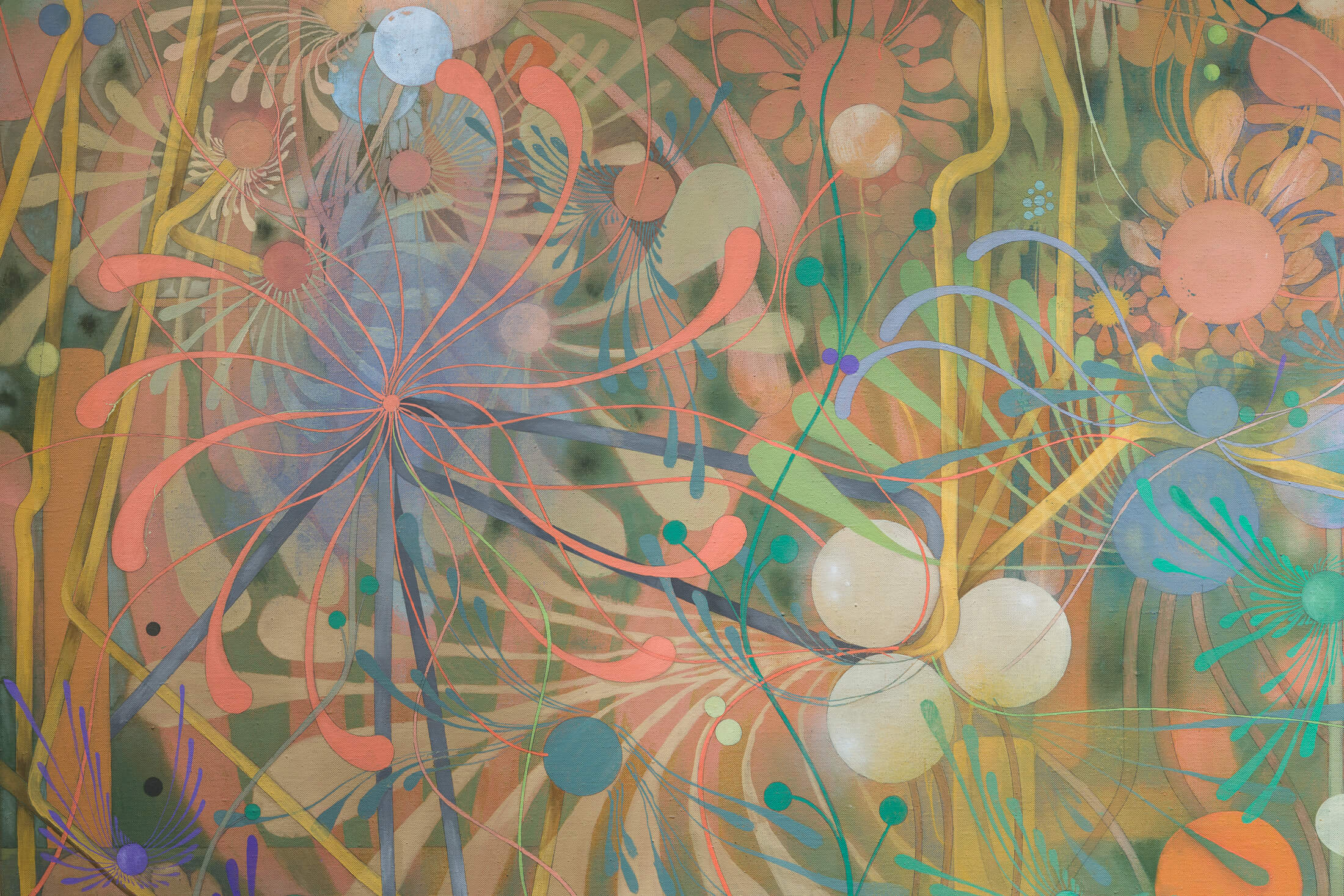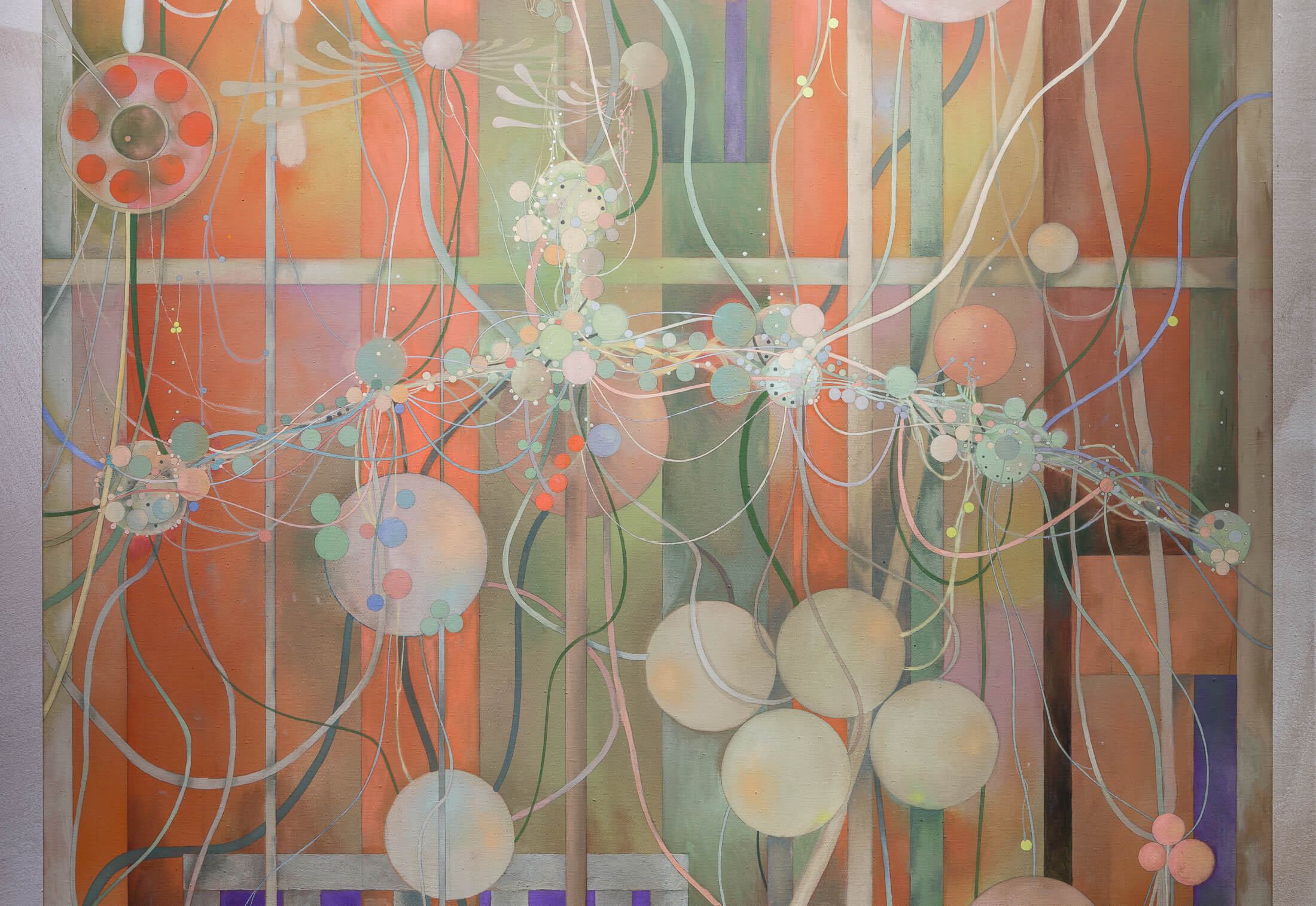 The exhibition invites visitors to linger and gaze into its kaleidoscopic networks, each of which possesses a harmony that suggests dreamy inertia. People rarely appear in Dénervaud’s work and when they do, they are usually suspended within the apparatus depicted. In Ozoned Station, each painting presents an opportunity to be subsumed by unfamiliar cycles of growth.
