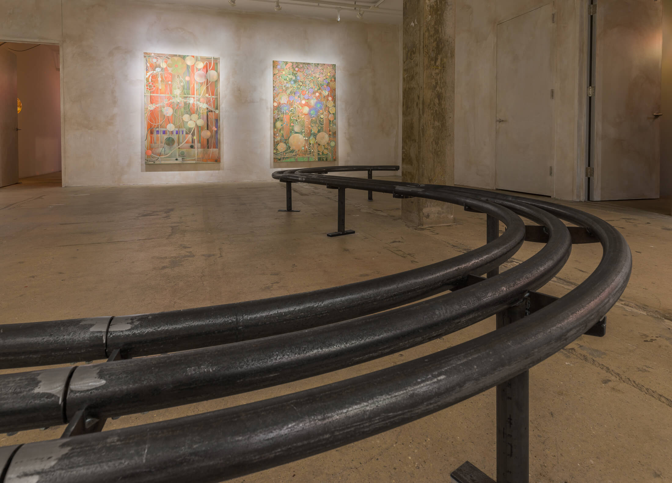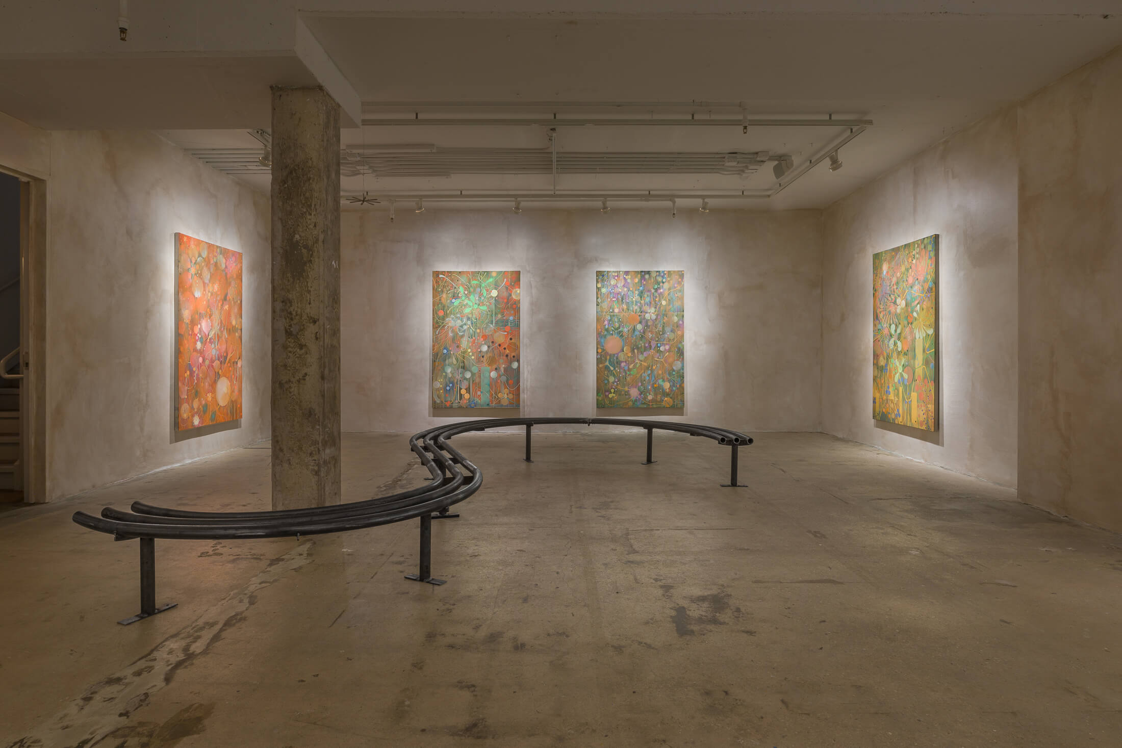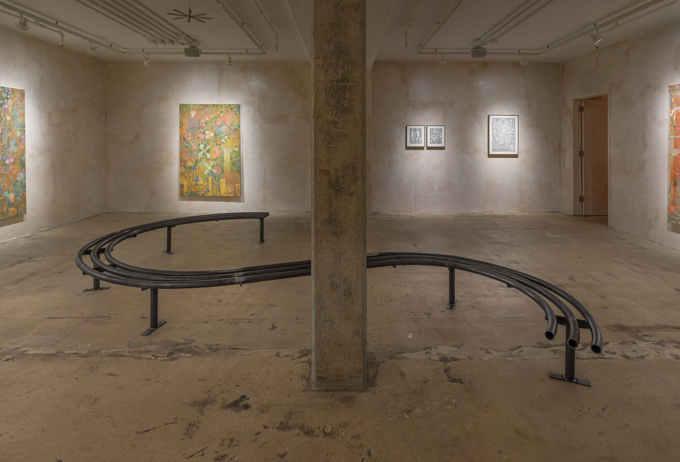 A residue coats the walls of the gallery. Evocative of the sticky dust that accumulates in an urban tunnel or on subway platforms, this patina is made by mixing paint with umber, a natural pigment whose artistic uses date to Neolithic cave painting, which is today burnt in coal-fired power plants to produce electricity. In the adjacent hallway and stairwell, hand-blown glass lanterns, like extracted organs or abandoned planets, hang loose from the ceiling and glow.