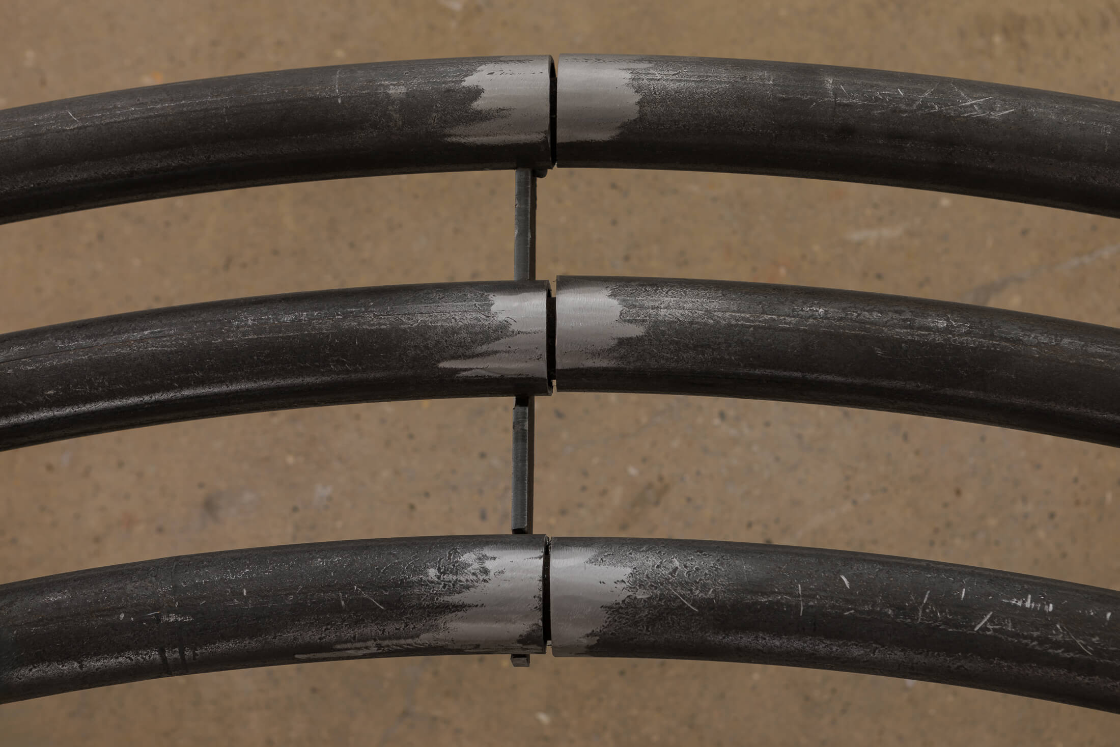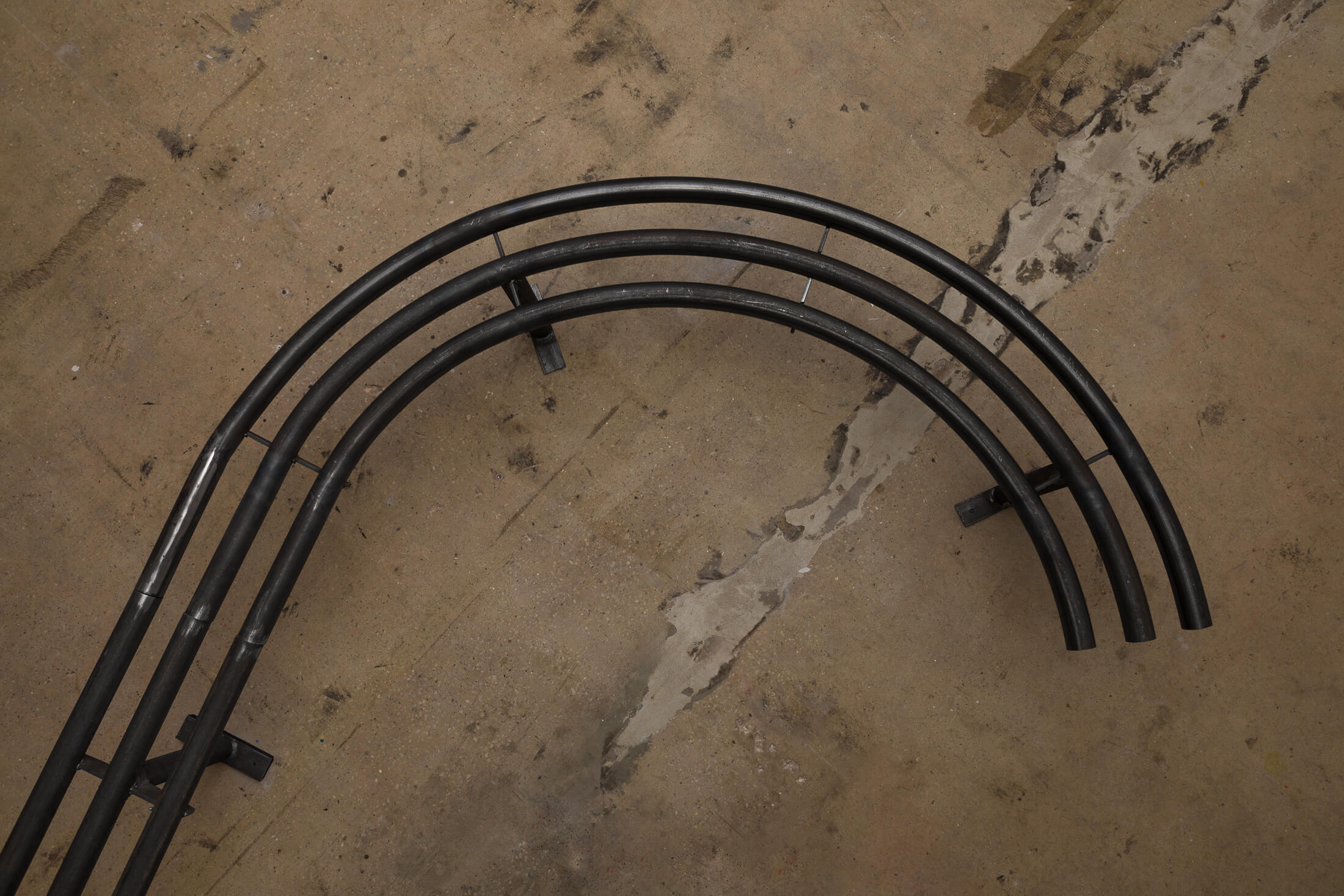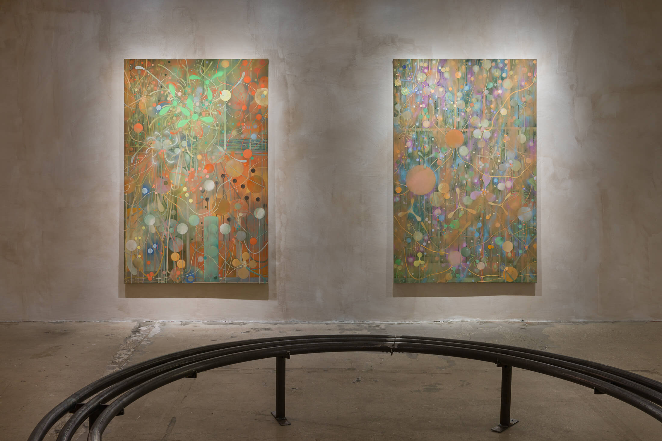 A residue coats the walls of the gallery. Evocative of the sticky dust that accumulates in an urban tunnel or on subway platforms, this patina is made by mixing paint with umber, a natural pigment whose artistic uses date to Neolithic cave painting, which is today burnt in coal-fired power plants to produce electricity. In the adjacent hallway and stairwell, hand-blown glass lanterns, like extracted organs or abandoned planets, hang loose from the ceiling and glow.