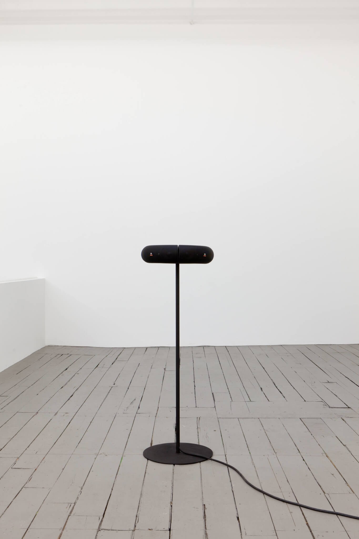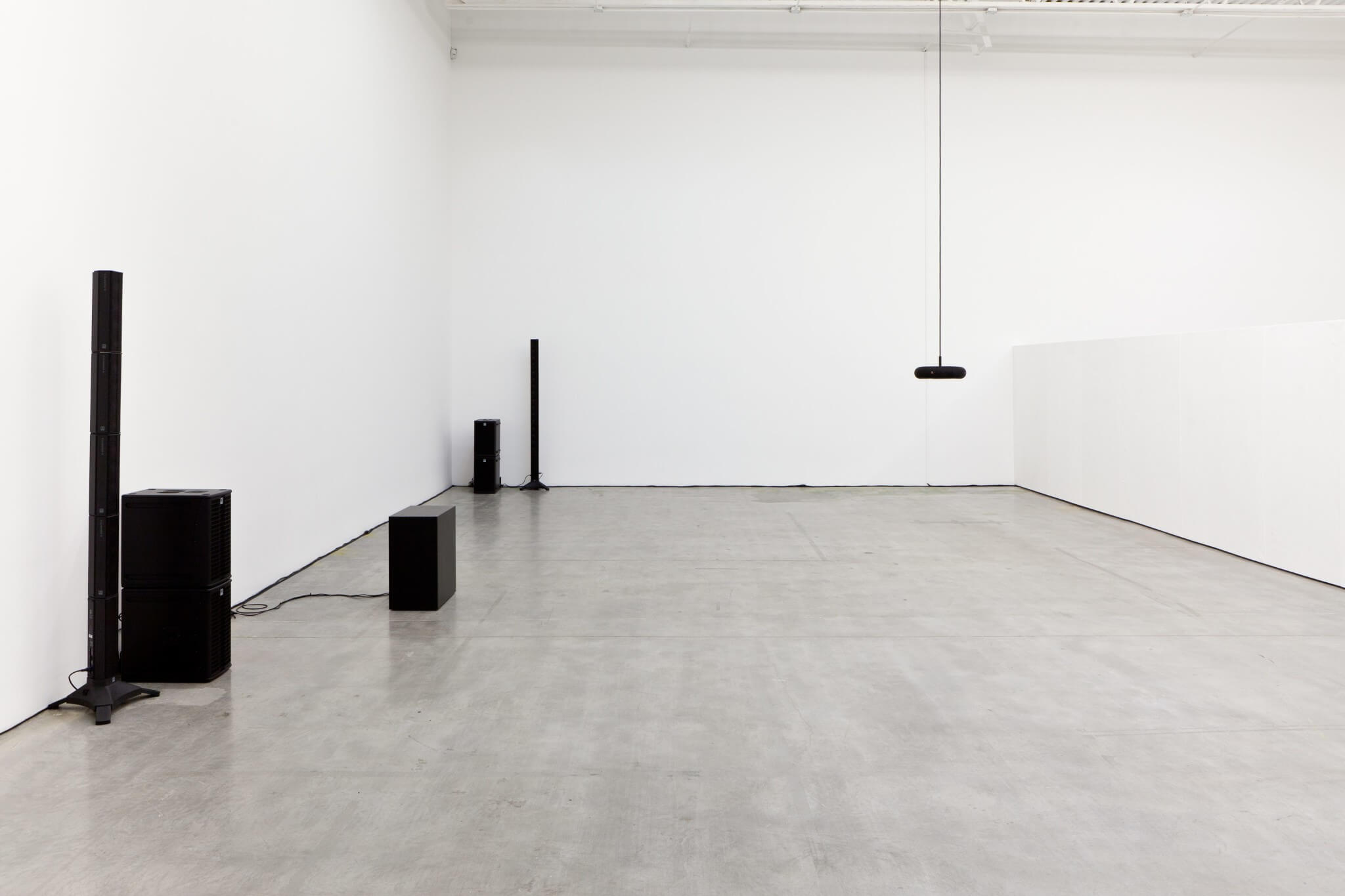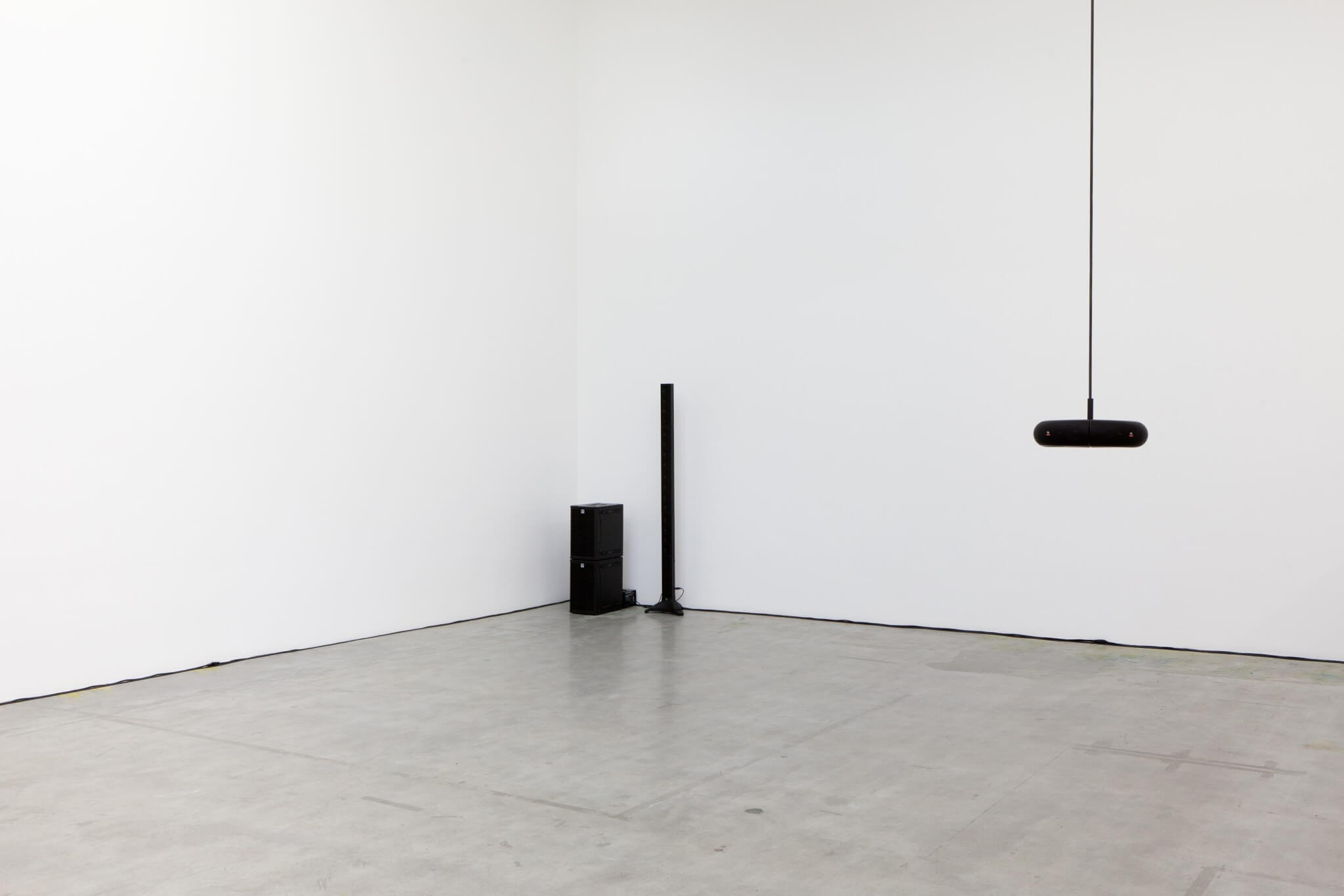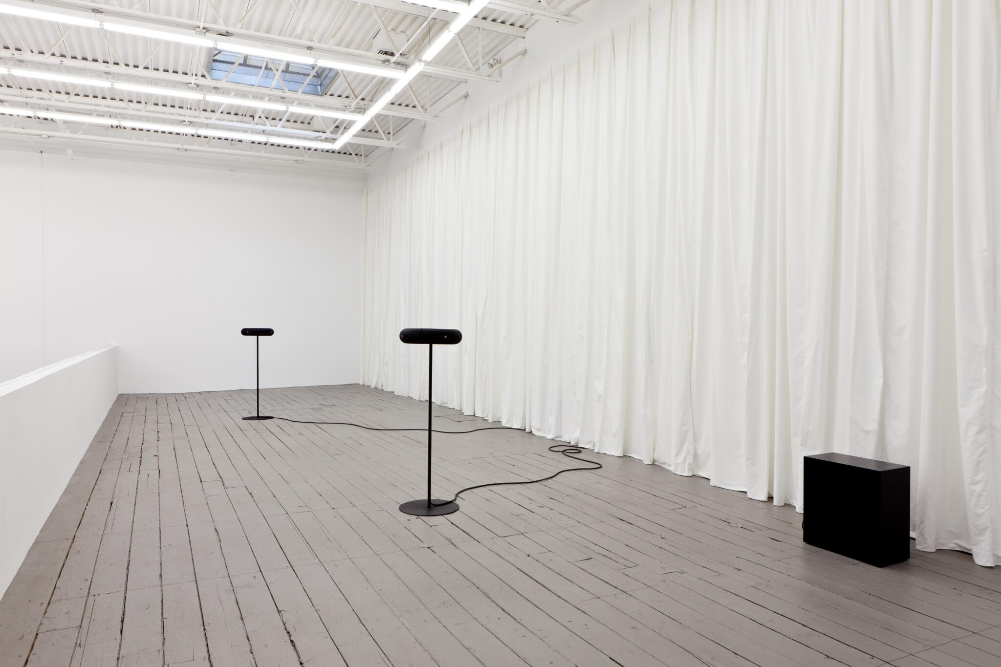 For her exhibition, Weinberger has composed a series of electronic loops mixed in a constant cadence that recalls the rhythmic pulse of a beating heart (80-140 beats per minute). While minimal, the various tracks resound in a warm, constant and reassuring tempo that is soft, drawn out, and ambient. The loops are installed via a series of multi-directional speakers, each emitting sound. Long white curtains adorn the walls.