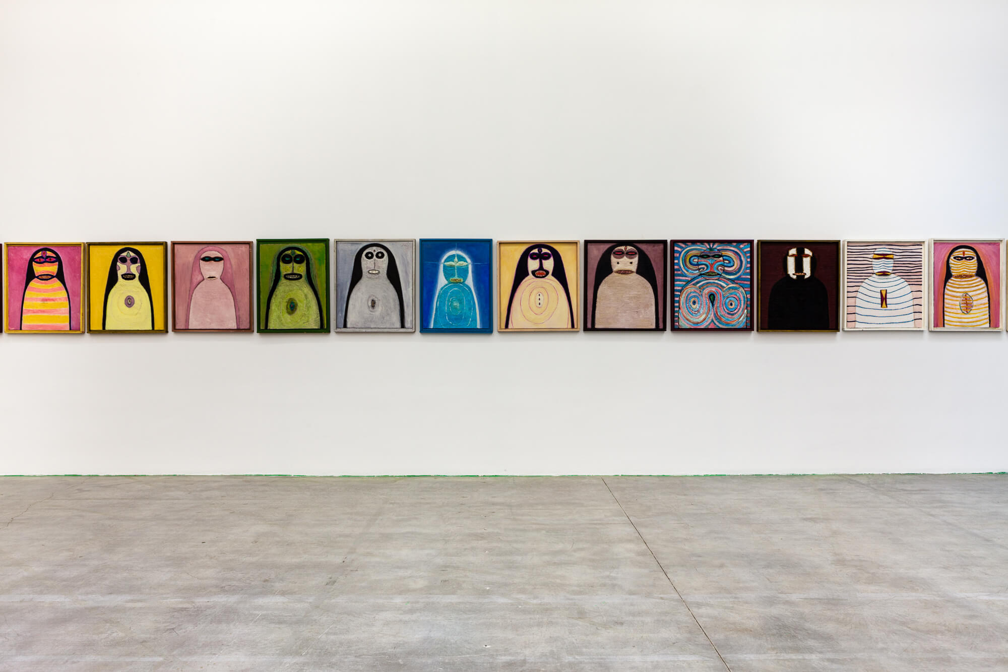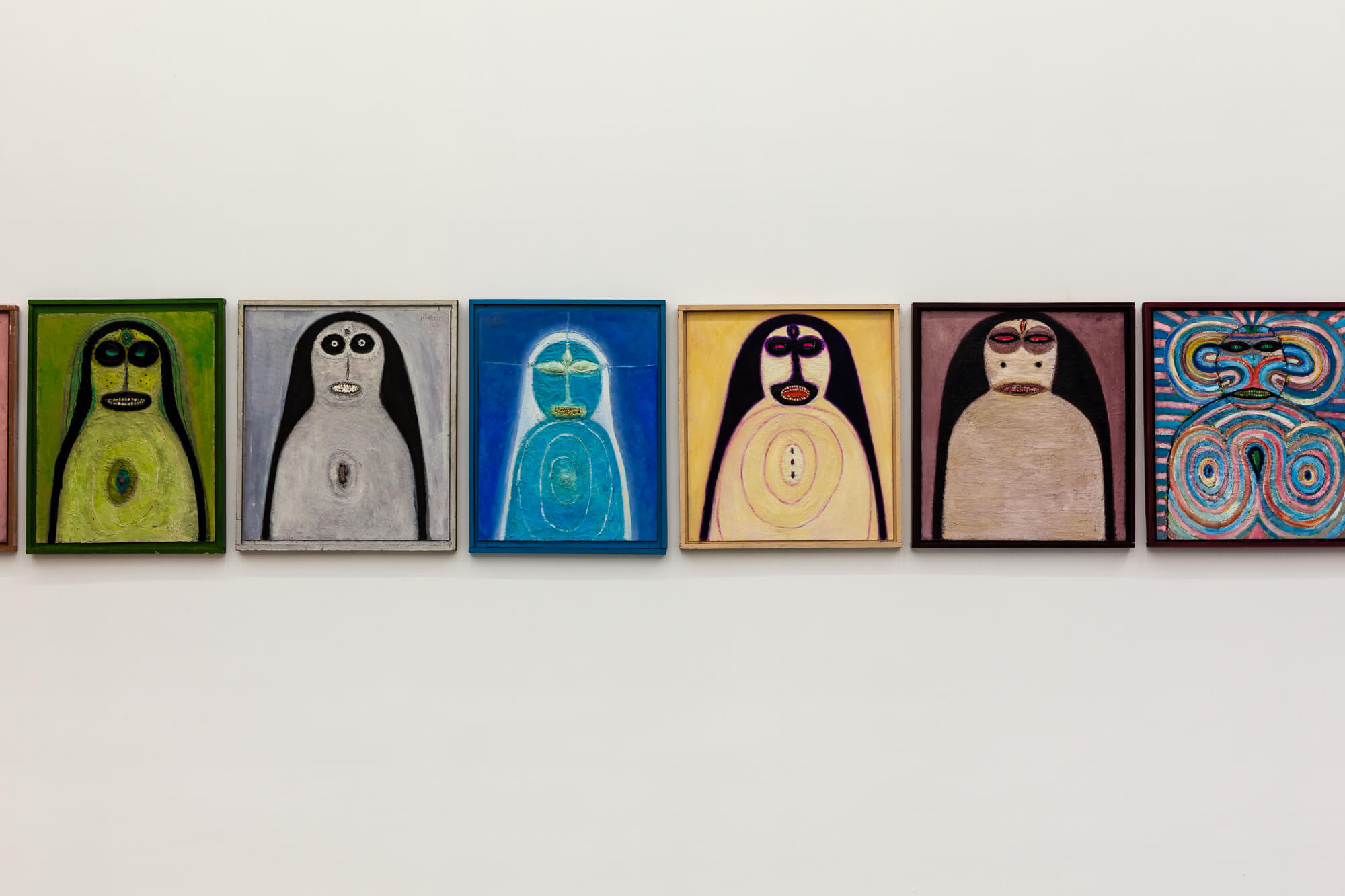 From the late 1960s to the mid 1980s, Schärer painted over 100 paintings entitled Madonna, each featuring the head and body of an isolated figure, often with a framing silhouette around the head and shoulders suggesting long hair, a veil or a cloak. Painted with thick layers of oil paint, and incorporating objects such as stones, hair, shells and keys, the Madonnas are both menacing and mesmerizing – typified by unnerving gazes and prominent, tooth-filled mouths that grimace and gape.