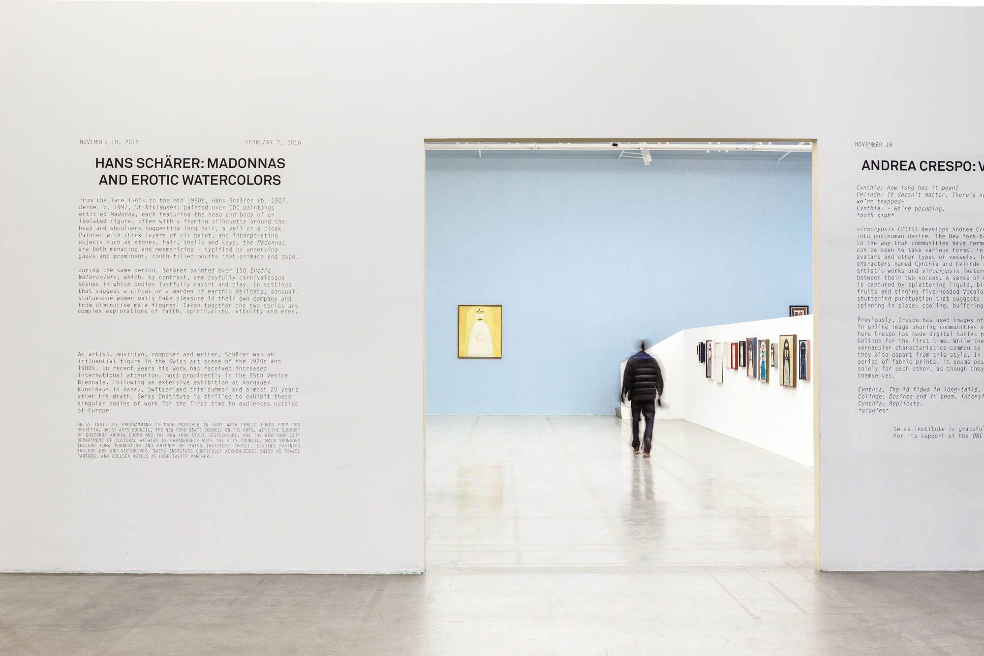 Hans Schärer: Madonnas and Erotic Watercolors was organized in collaboration with the Aargauer Kunsthaus. Swiss Institute thanks Marion Schärer, Max Christian Graeff, Madeleine Schuppli, Nicole Rampa, and the lenders to the exhibition: Arguer Kunsthaus, Aarau; Collection de l’Art Brut, Lausanne; Fonds cantonal d’art contemporain, Geneva; Kunsthaus Zug, Zug; Kunstsammlung Kanton Luzern, Lucerne; The Museum of Everything, London; Museum of Porn in Art, Zurich; BSI Art Collection, Switzerland; Collection ALH, Genf; Charles de Montaigu; Beat Furrer; Bertrams Collection; Galerie Anton Meier, Geneva; Gertrud Haldemann-Schärer; Ugo Rondinone; Agnes Wigger Sigrist and Kurt Sigrist; Collection Tanner, Teufen; Anton Zwyssig and private collections..