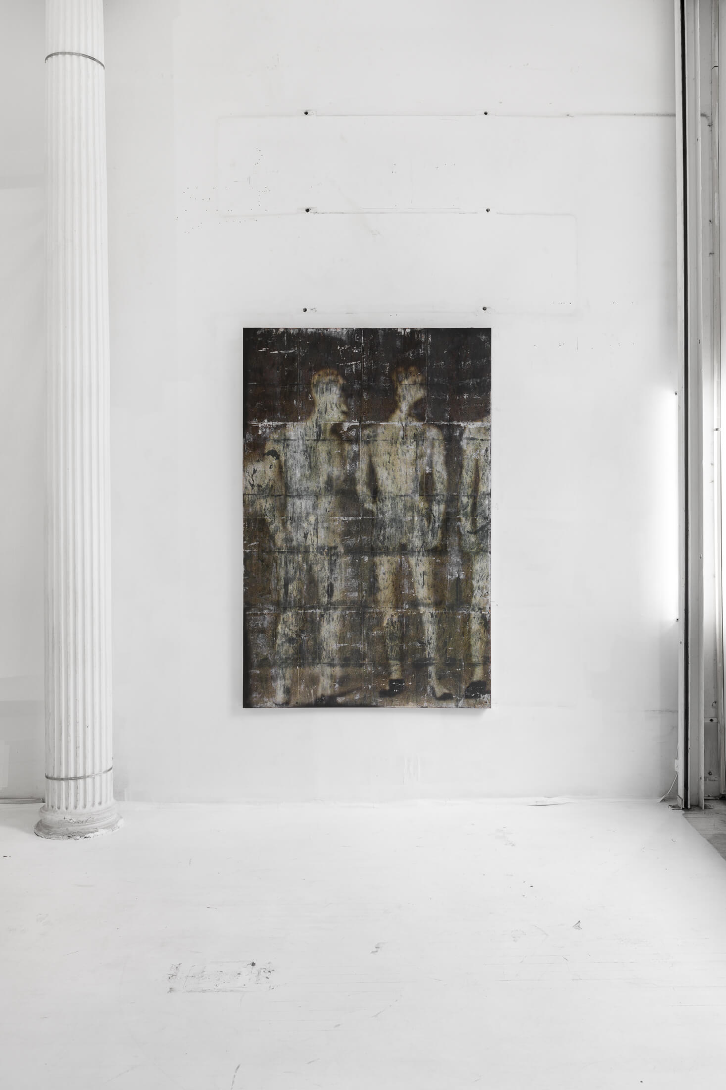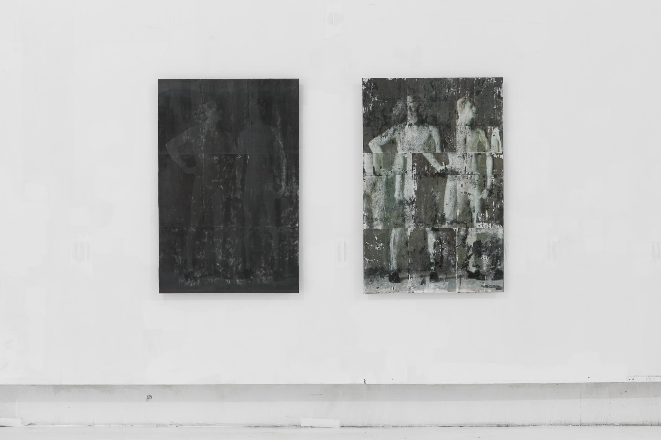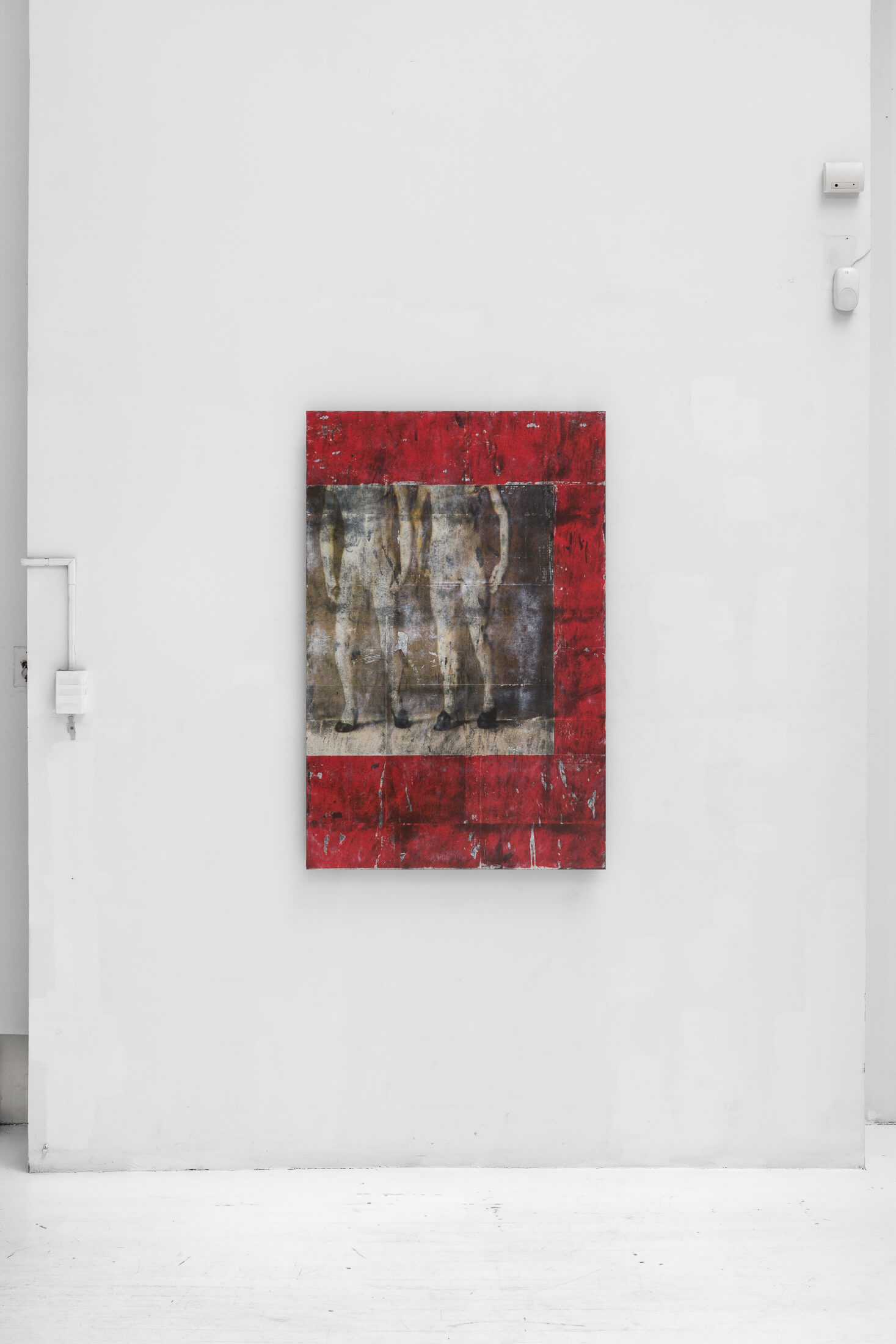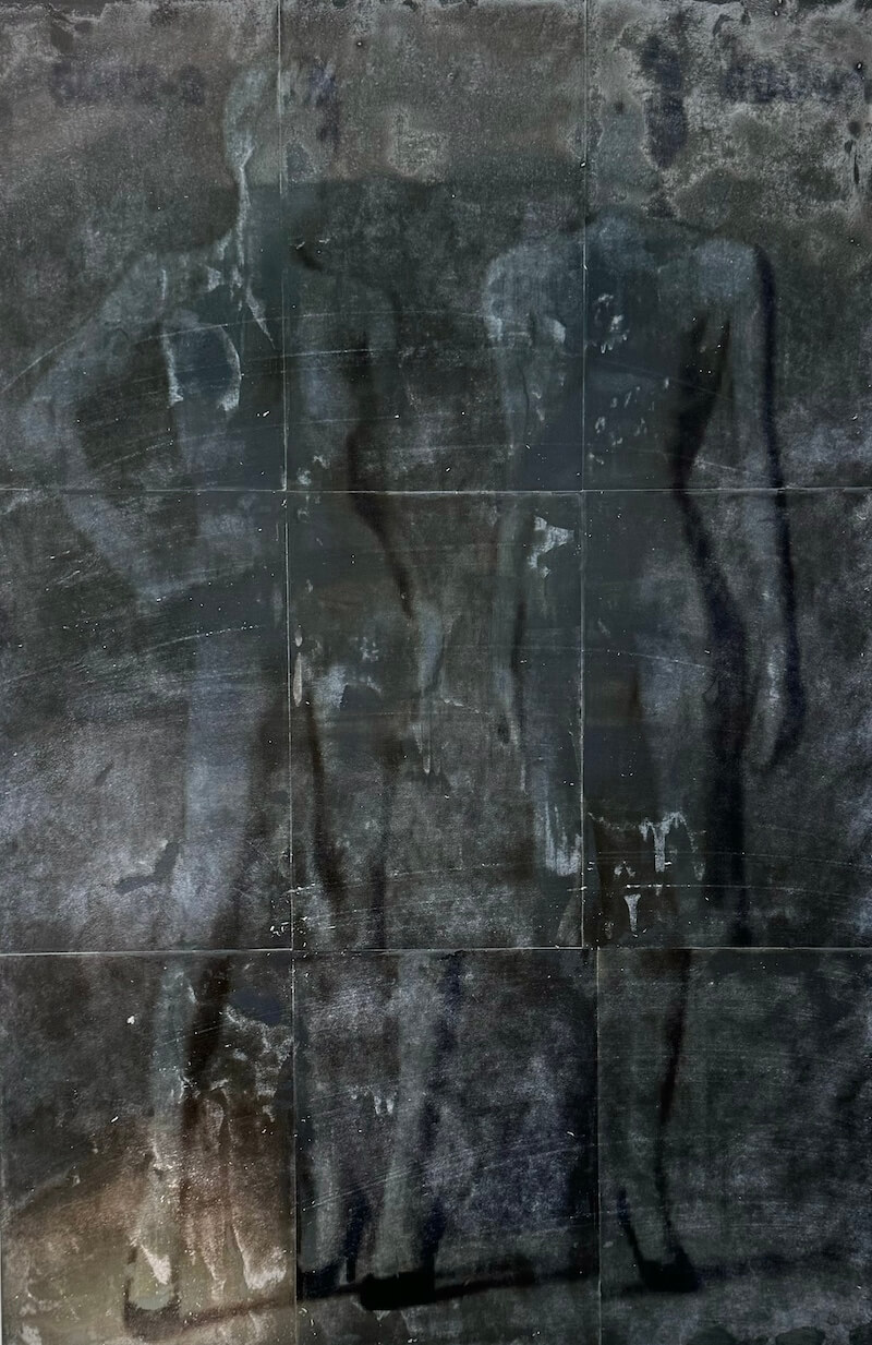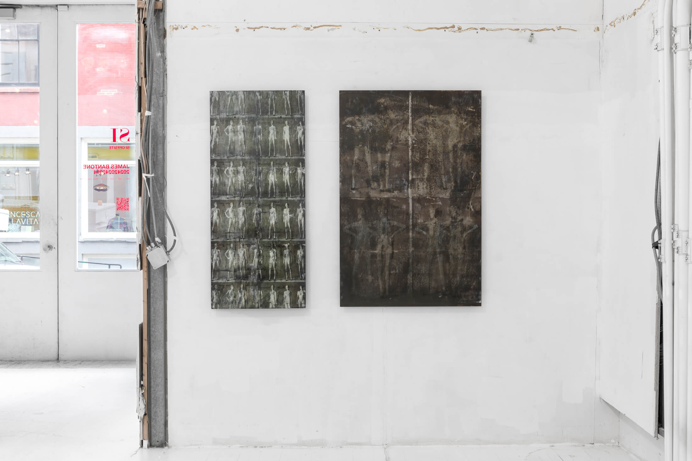 Hung on walls and mounted on standing displays, Bantone’s works have a textural residue akin to wheatpasted street advertisements. Applied with an acrylic transfer process onto steel plates, the bodies are rendered simultaneously as subjects and as objects, put on view in a Soho storefront. Men wear loafers and women wear high-heeled pumps. Information is lost, distorted and re-created through various interventions on the images.