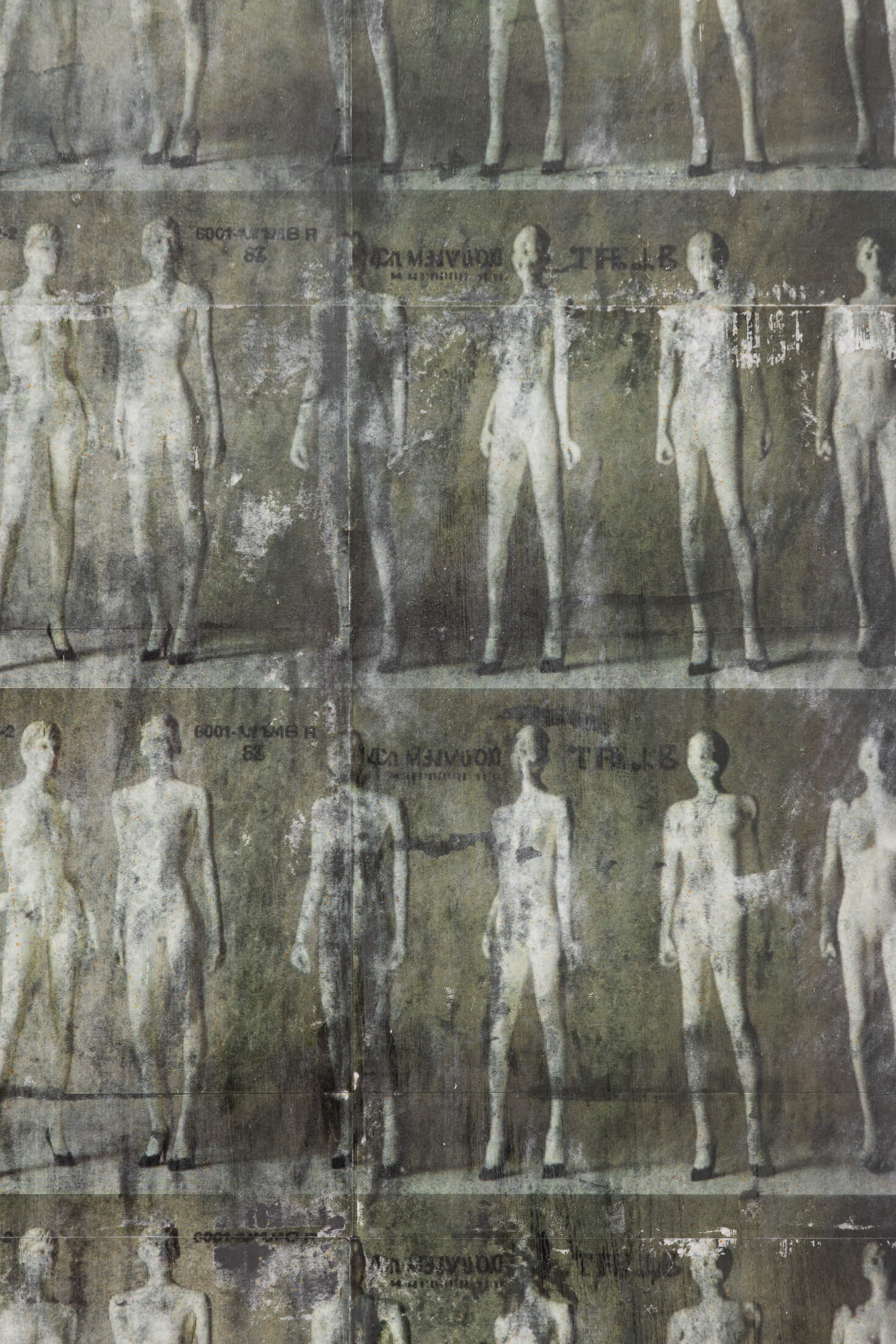 The works’ titles include each featured mannequin’s designated serial number along with an ad lib from popular music artists, recalling the lyrical accidents that occur through the repeated image transfer process. A legion of soliloquies, the figures call out again and again.