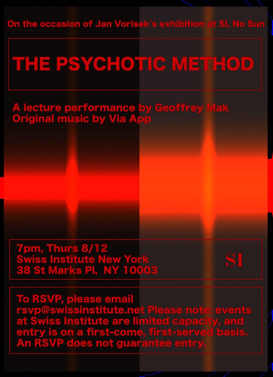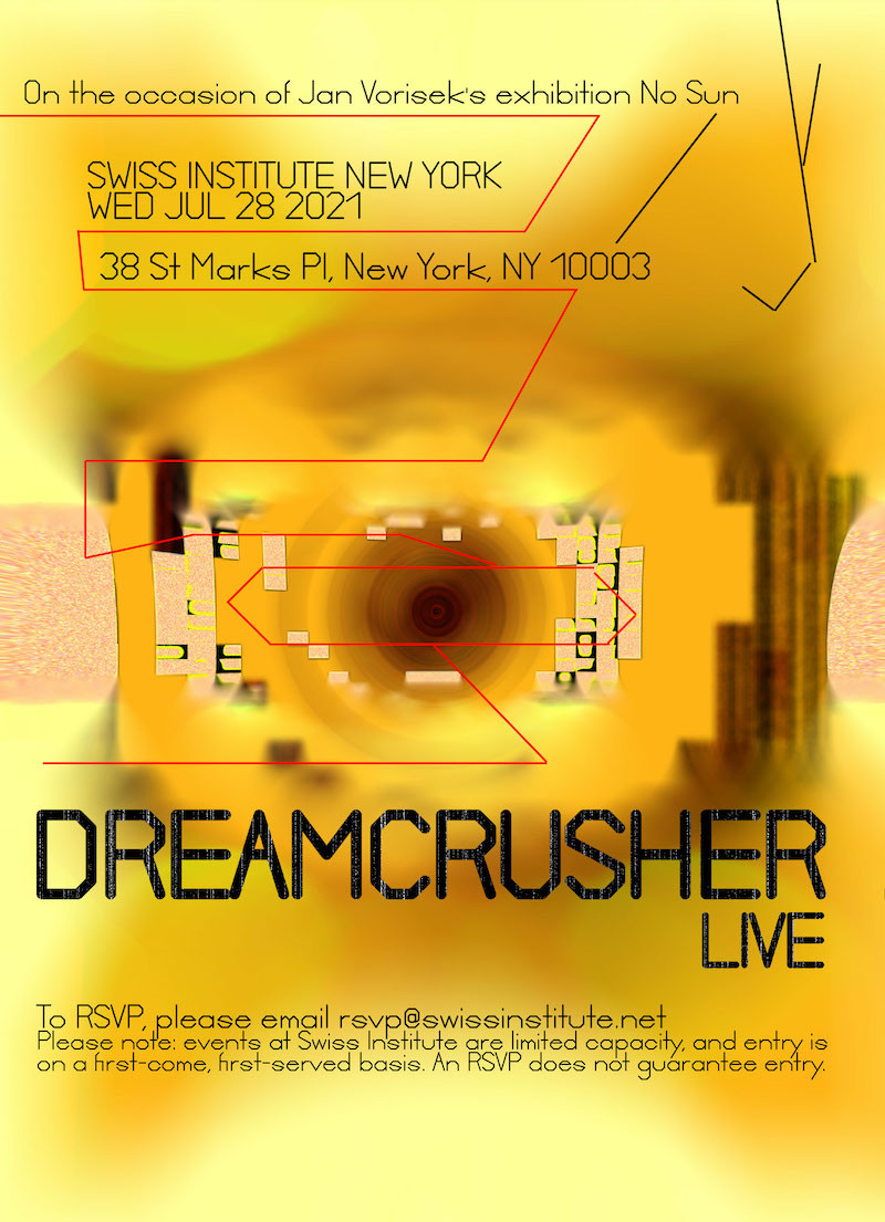 No Sun is the first institutional solo exhibition in the United States by Jan Vorisek, composed of new works commissioned by Swiss Institute. Vorisek works across sculpture, performance and sound to create autopoietic, site-specific installations that examine formal hierarchies through feedback, distortion and the delineation of space. In assemblages of accumulated found materials and sound-producing devices, he explores the fluctuation of noise as a medium for information. Split into two interrelated architectural interventions, the exhibition at SI is organized with experiences in mind that crossfade from corporeal to cerebral, increasing an awareness of the body in situ while evoking associative memories from the collective unconscious.