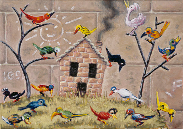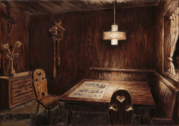 At Swiss Institute, Schnyder exhibits Landschaft (Landscape) I-XXXV (1990/91) a typical example of his vision of painting. After finding a subject, he usually examines every possibility in his imagination without doing any preparatory drawings. The common denominator of this series is the archetypal small house treated in 35 small-sized oil paintings. From the hut of Hansel and Gretel to suburban architecture with a Swastika-lit sky, the modality of a small world is investigated by painting.