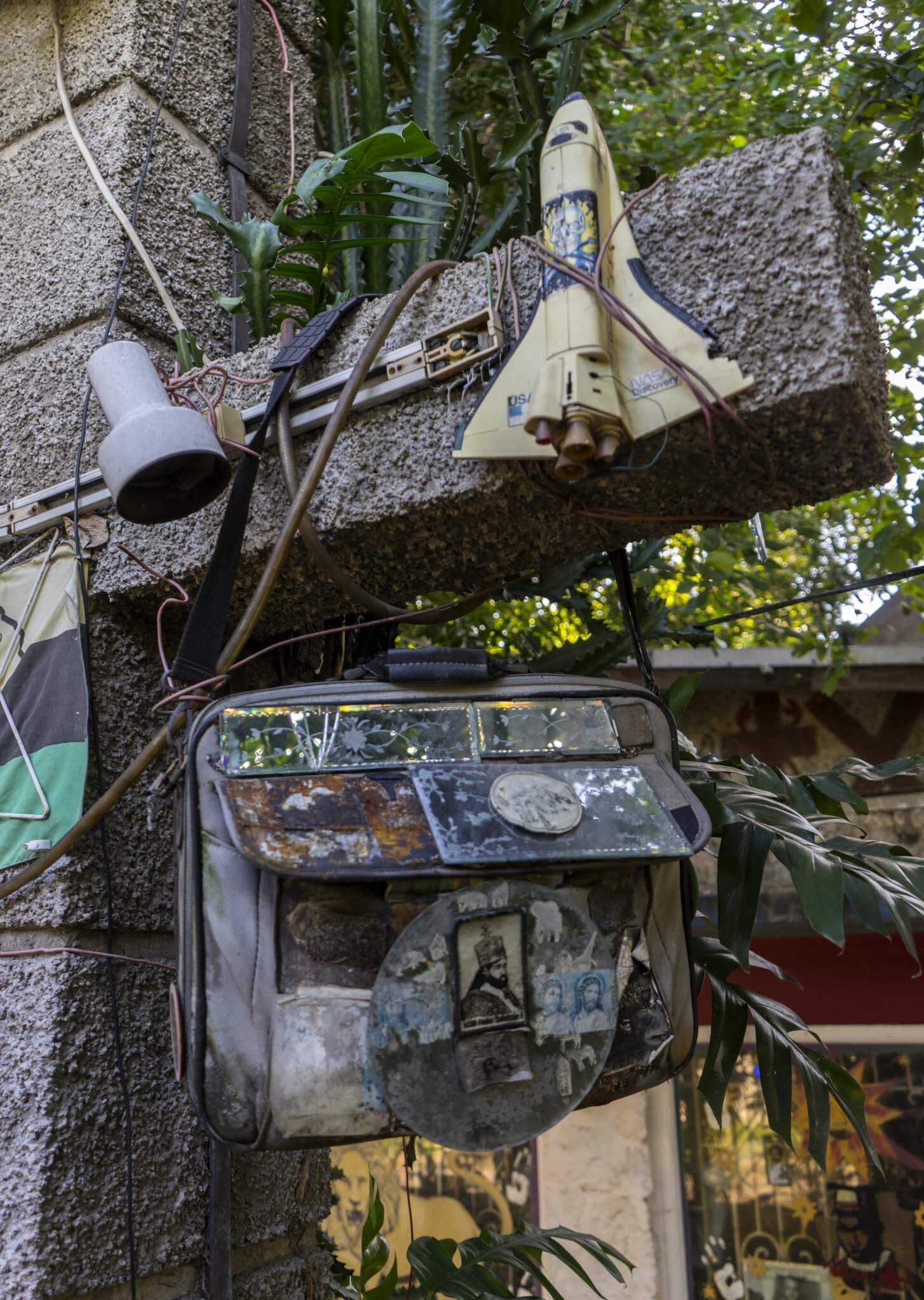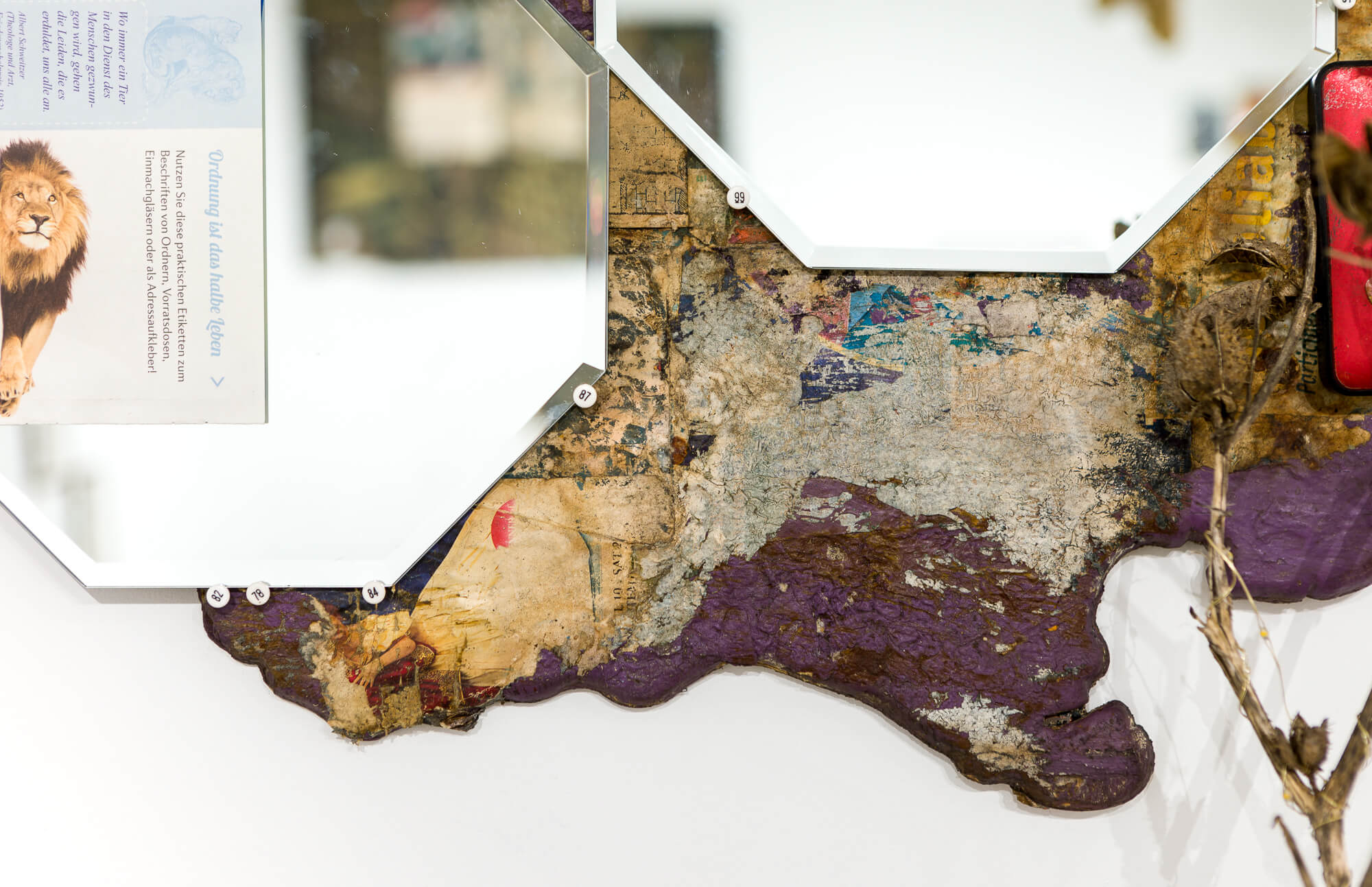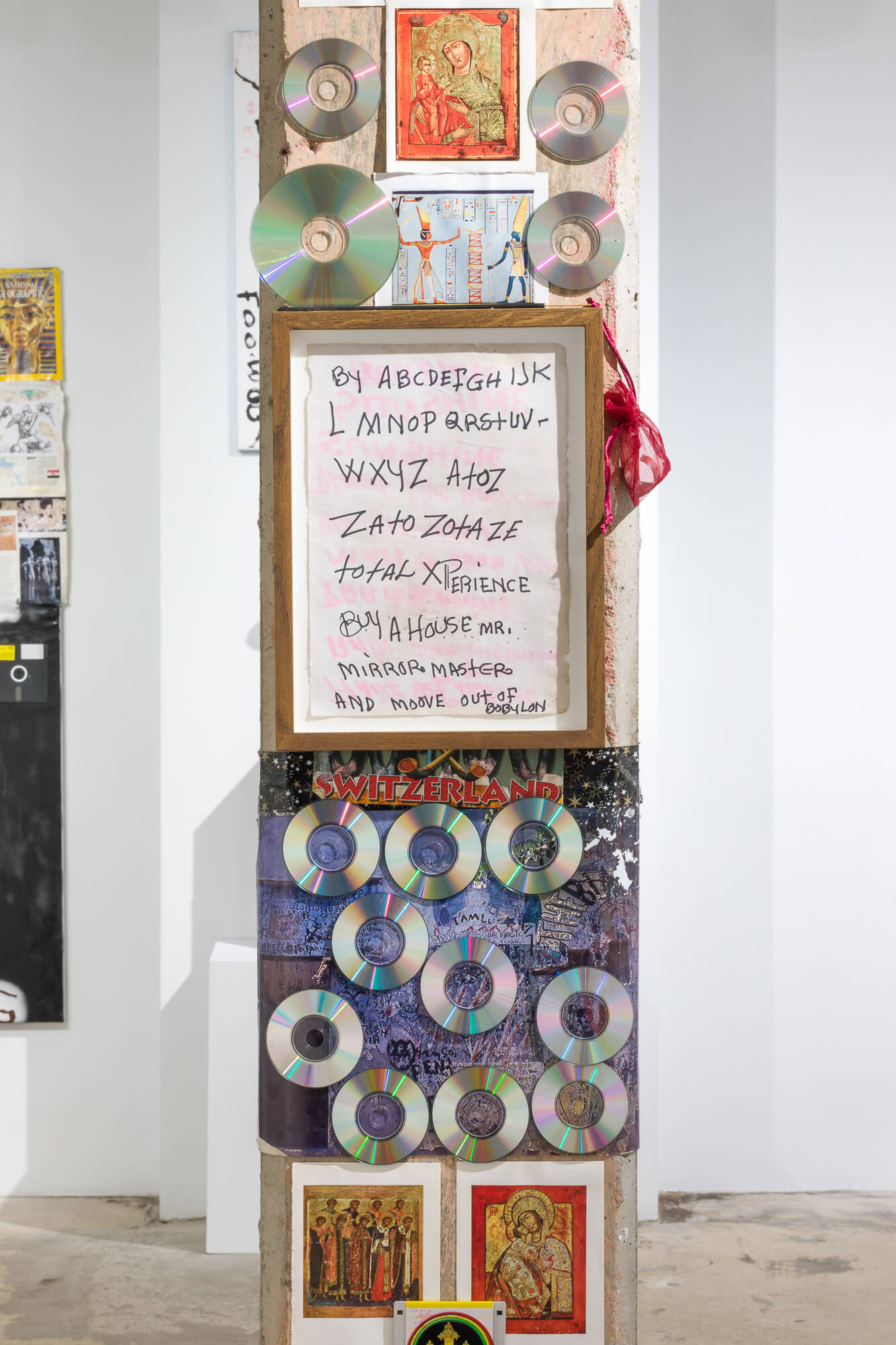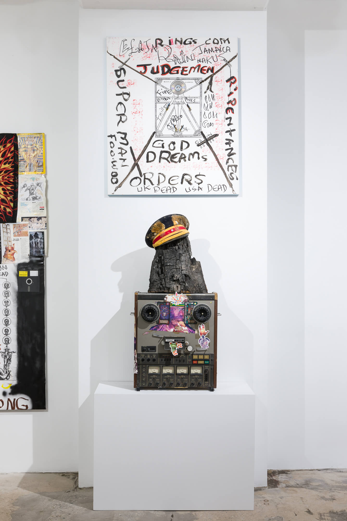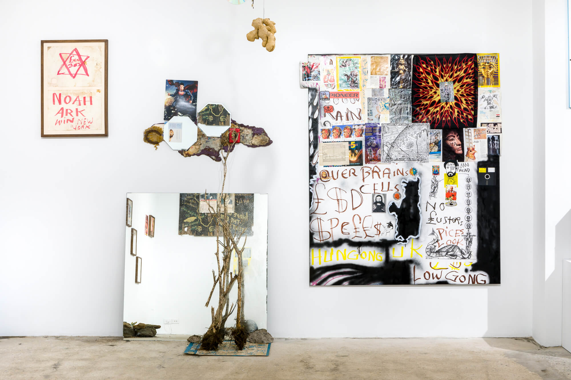 Perry’s mode of art making is process-oriented and informed by music production techniques such as re-mixing, re-versioning and modulating existing materials. At Swiss Institute, the installation includes signs that he has commissioned and painted over, collages made collaboratively, and fan art. It combines the objects that he relentlessly collects, such as microphone cables, international currency, shiny stickers with the face of Haile Selassie, stuffed animals, and octagonal mirrors, as well as video recordings of his daily life. Deeply influenced by a fusion of religious beliefs and practices, including the Yoruba tradition of Ettu, Obeah, Rastafarianism, and Christianity, Perry transforms these materials by burning, painting, layering, collaging, gluing, exposing to sun, wind and rain, and burying. In this way, Perry incorporates them into a never-complete artistic cosmos untethered from notions of linear space and time.