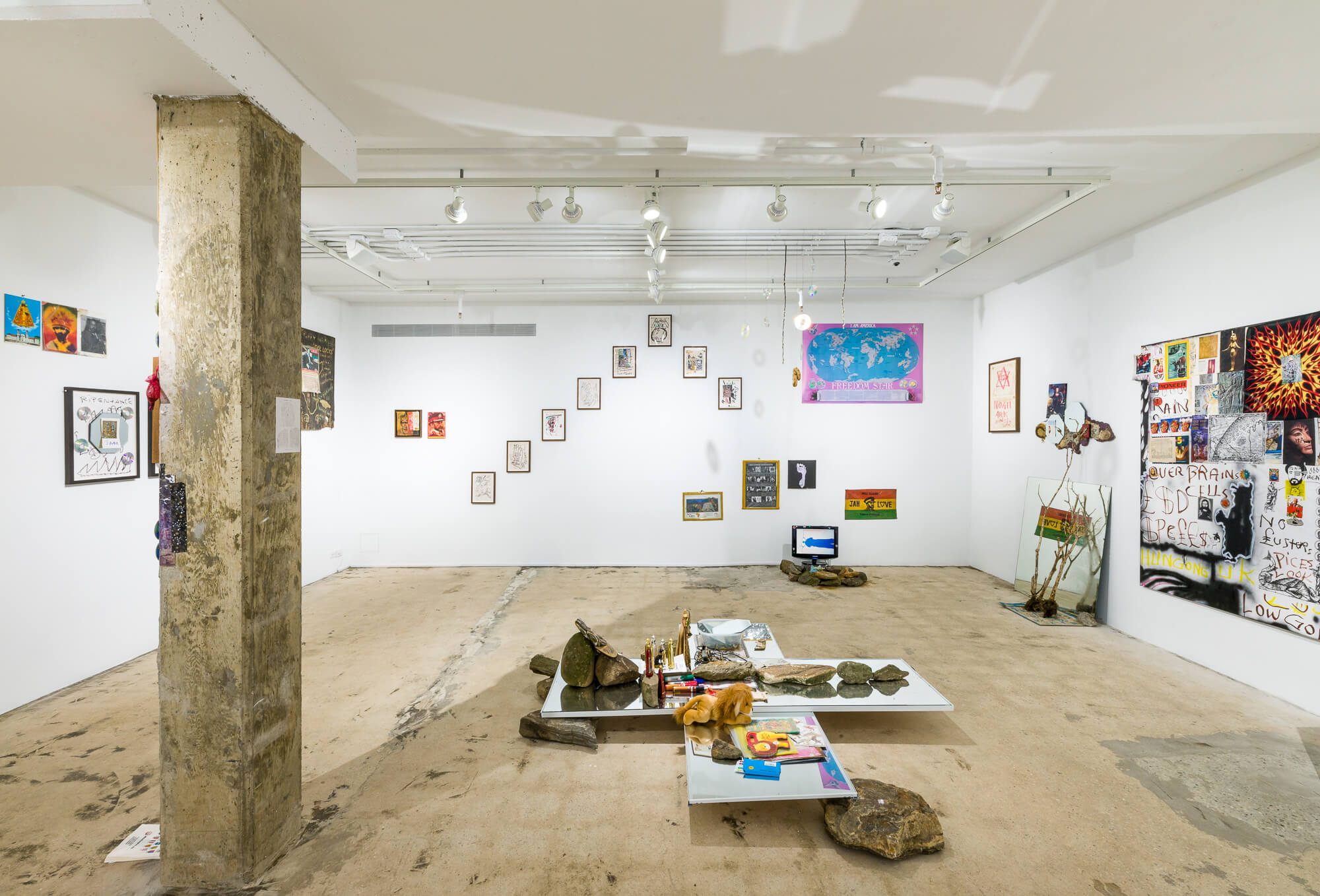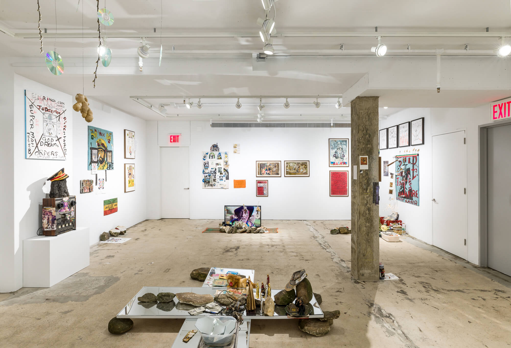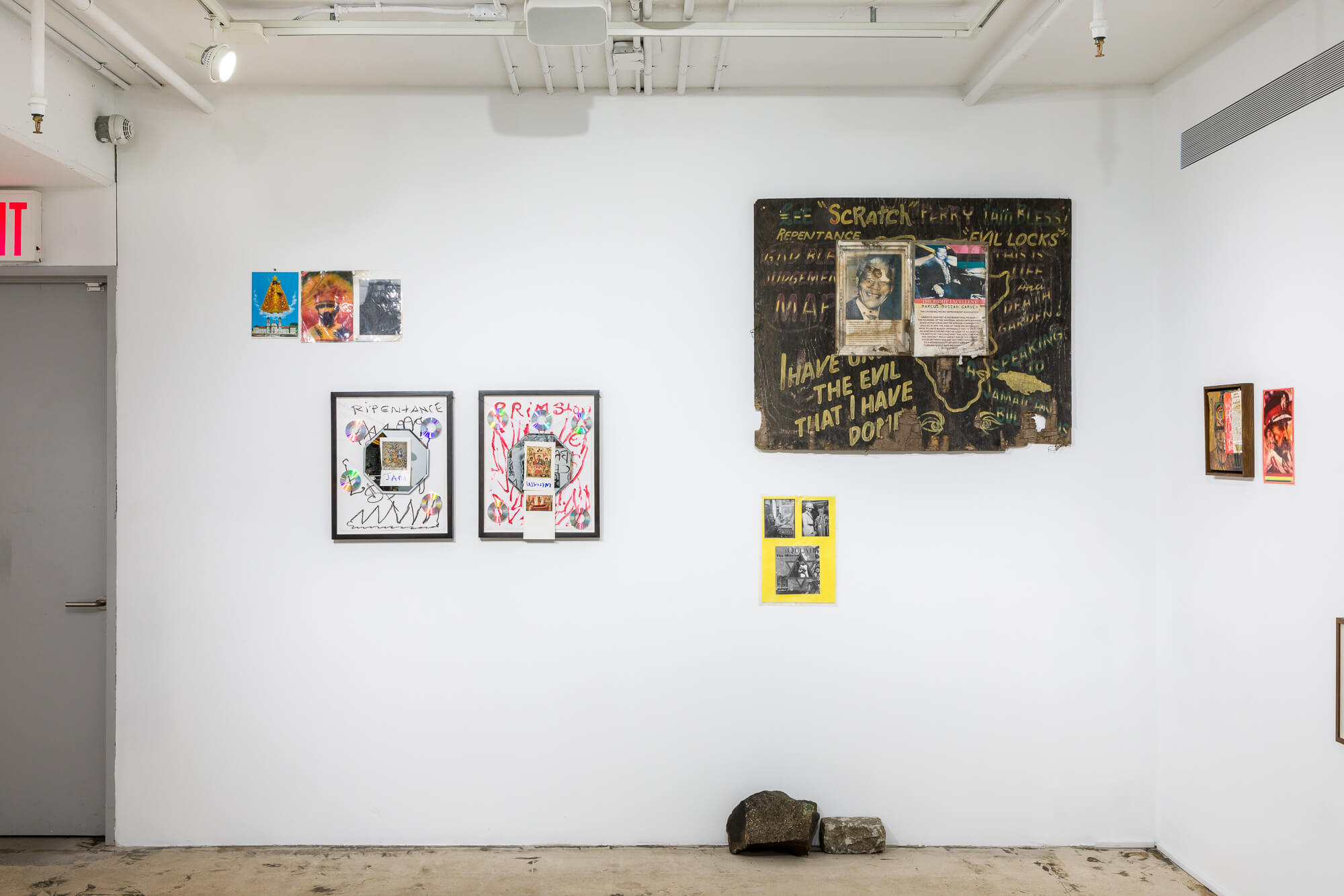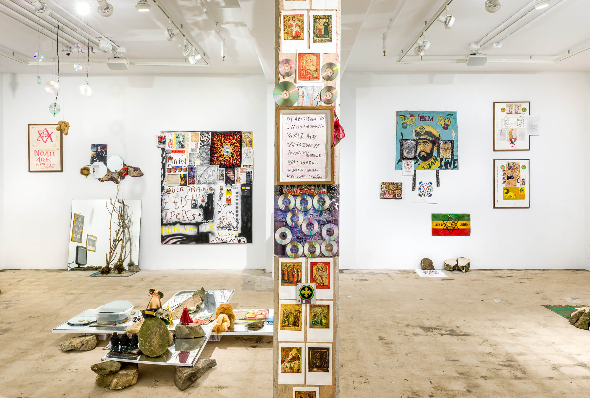 The walls of the gallery at SI feature works and pictorial material from Perry’s studios, where a collection of images has accumulated over time into a Byzantine patchwork of symbols and signs. In the Jamaican tradition of the yard show, the site-specific floor installation takes the form of a spiritual home ground that Perry has arranged ritualistically with rocks and stones gathered from the shores of the island of Manhattan and basins filled with water from the Hudson and Harlem Rivers. Characteristic of Perry’s Gesamtkunstwerk style, figurines of the Black Madonna of the rural alpine Abbey of Einsiedeln are placed among laptop computers, printed out stacks of poetry, dug-up notebooks filled with spiritual graffiti, mirror balls and CDs, along with a plethora of other materials,