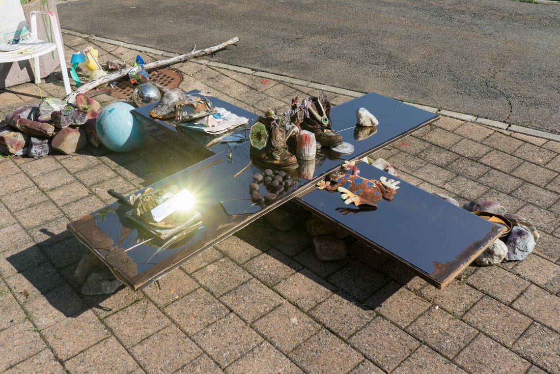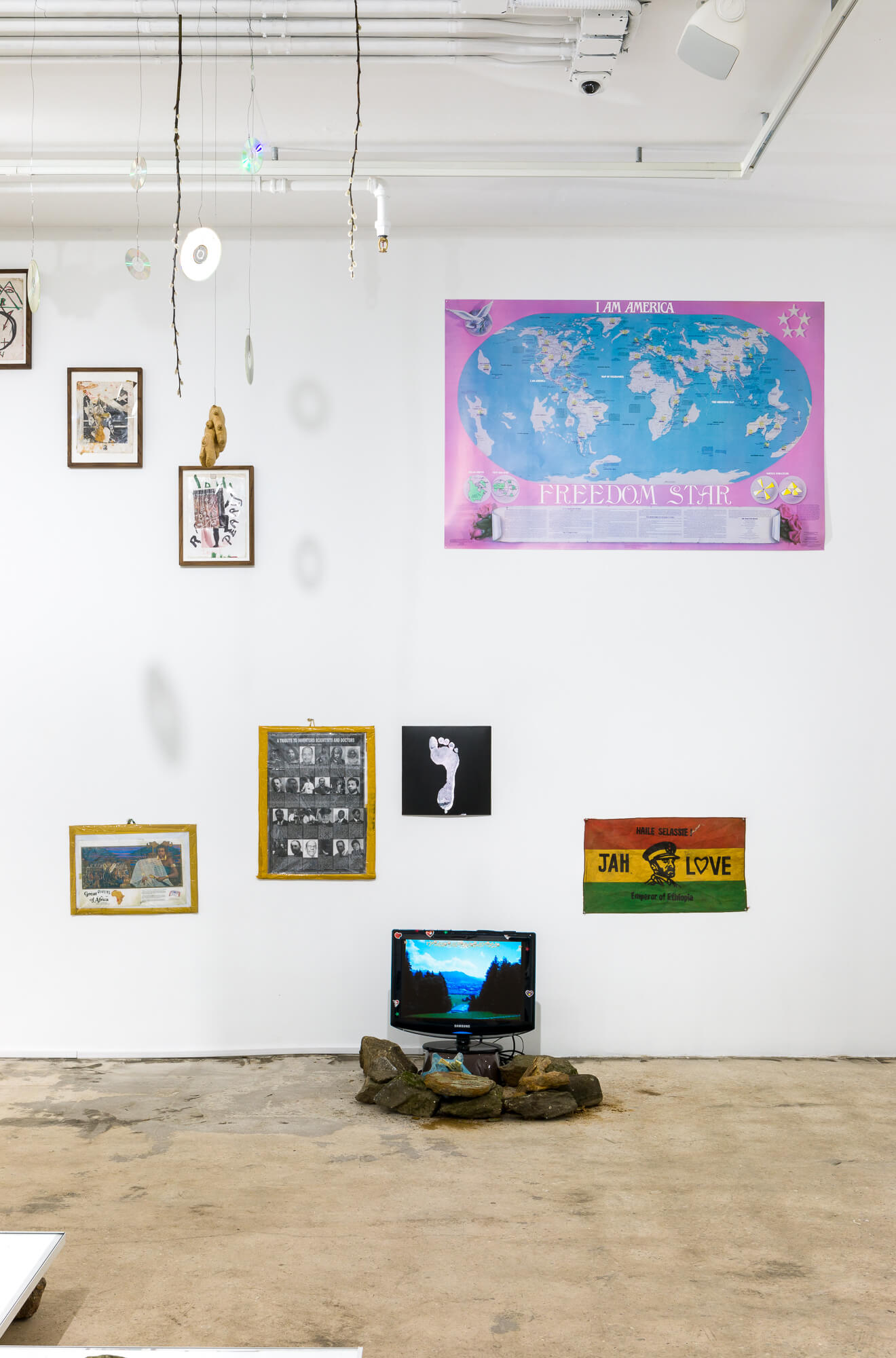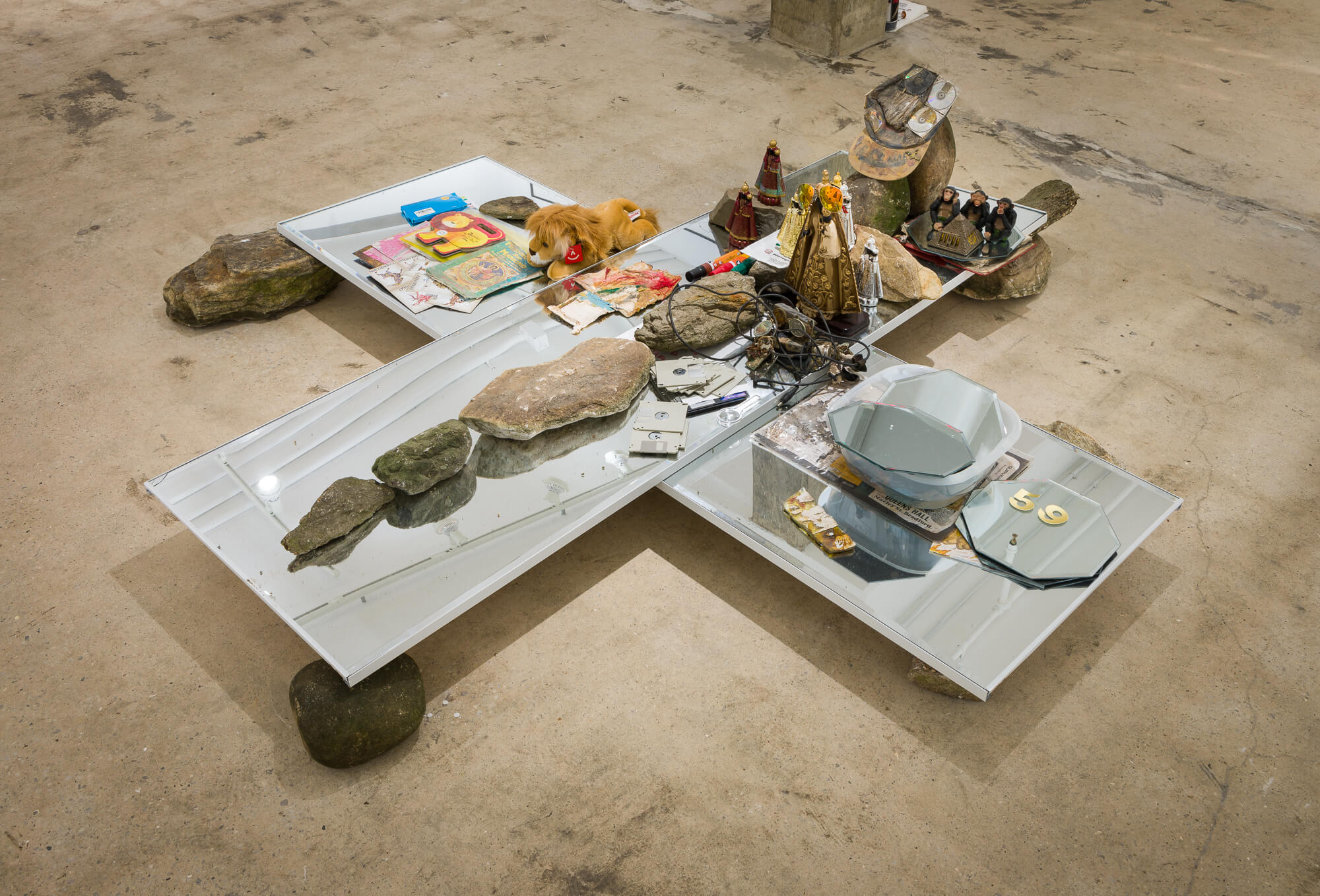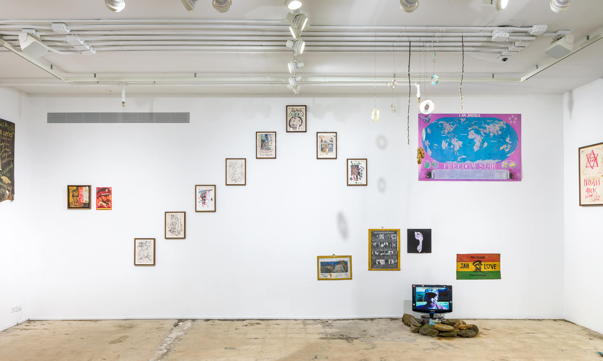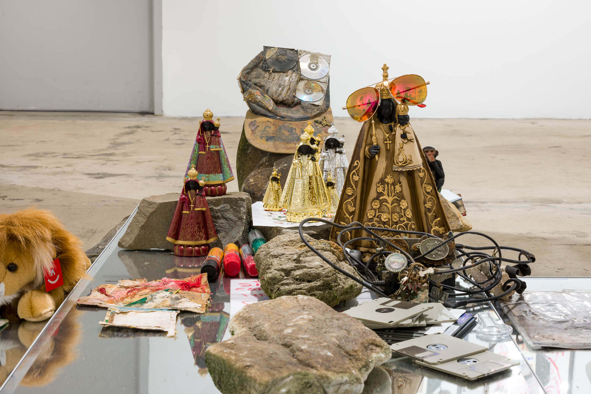 The walls of the gallery at SI feature works and pictorial material from Perry’s studios, where a collection of images has accumulated over time into a Byzantine patchwork of symbols and signs. In the Jamaican tradition of the yard show, the site-specific floor installation takes the form of a spiritual home ground that Perry has arranged ritualistically with rocks and stones gathered from the shores of the island of Manhattan and basins filled with water from the Hudson and Harlem Rivers. Characteristic of Perry’s Gesamtkunstwerk style, figurines of the Black Madonna of the rural alpine Abbey of Einsiedeln are placed among laptop computers, printed out stacks of poetry, dug-up notebooks filled with spiritual graffiti, mirror balls and CDs, along with a plethora of other materials,