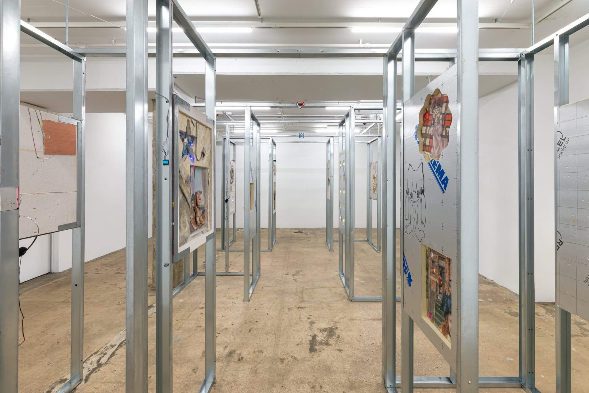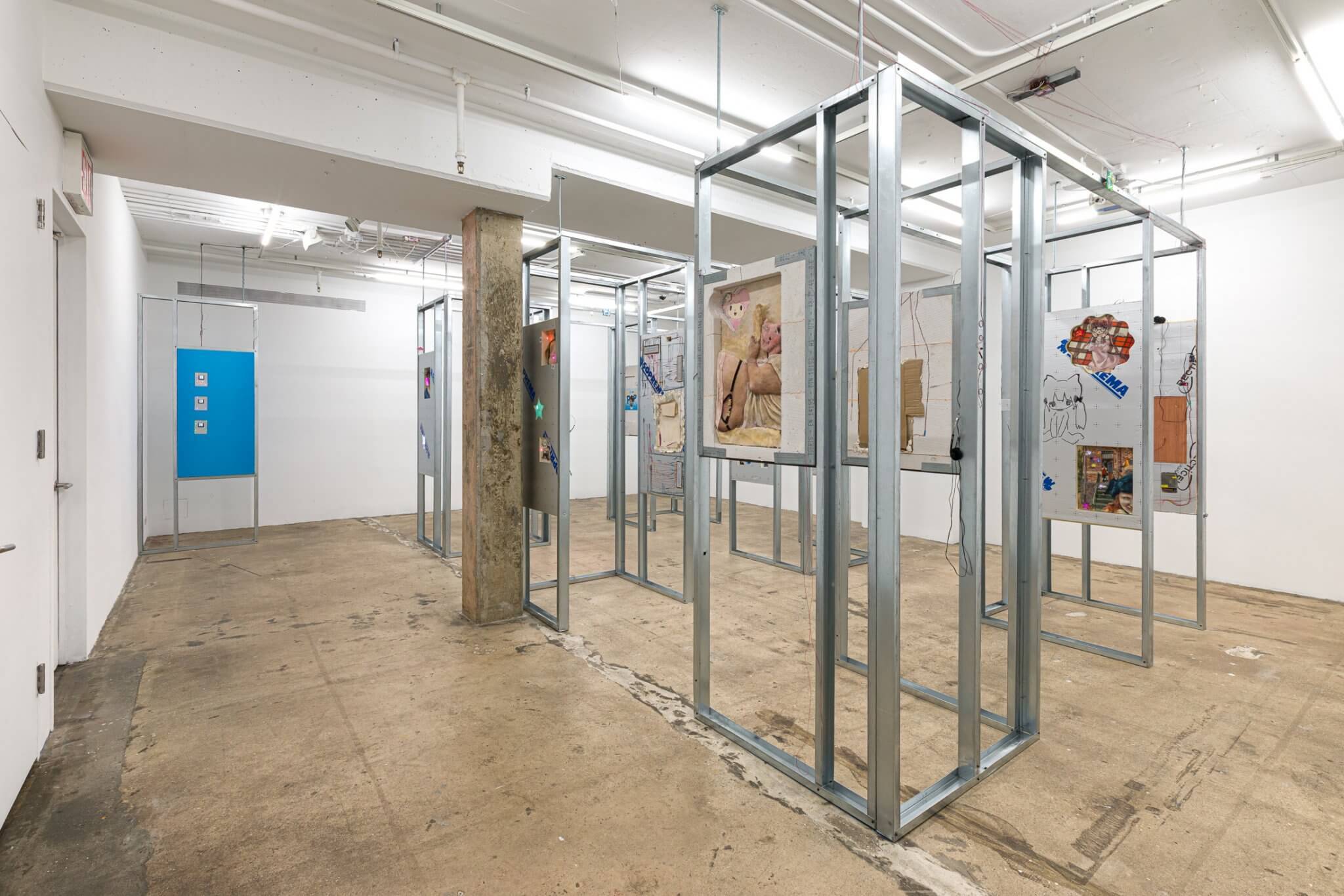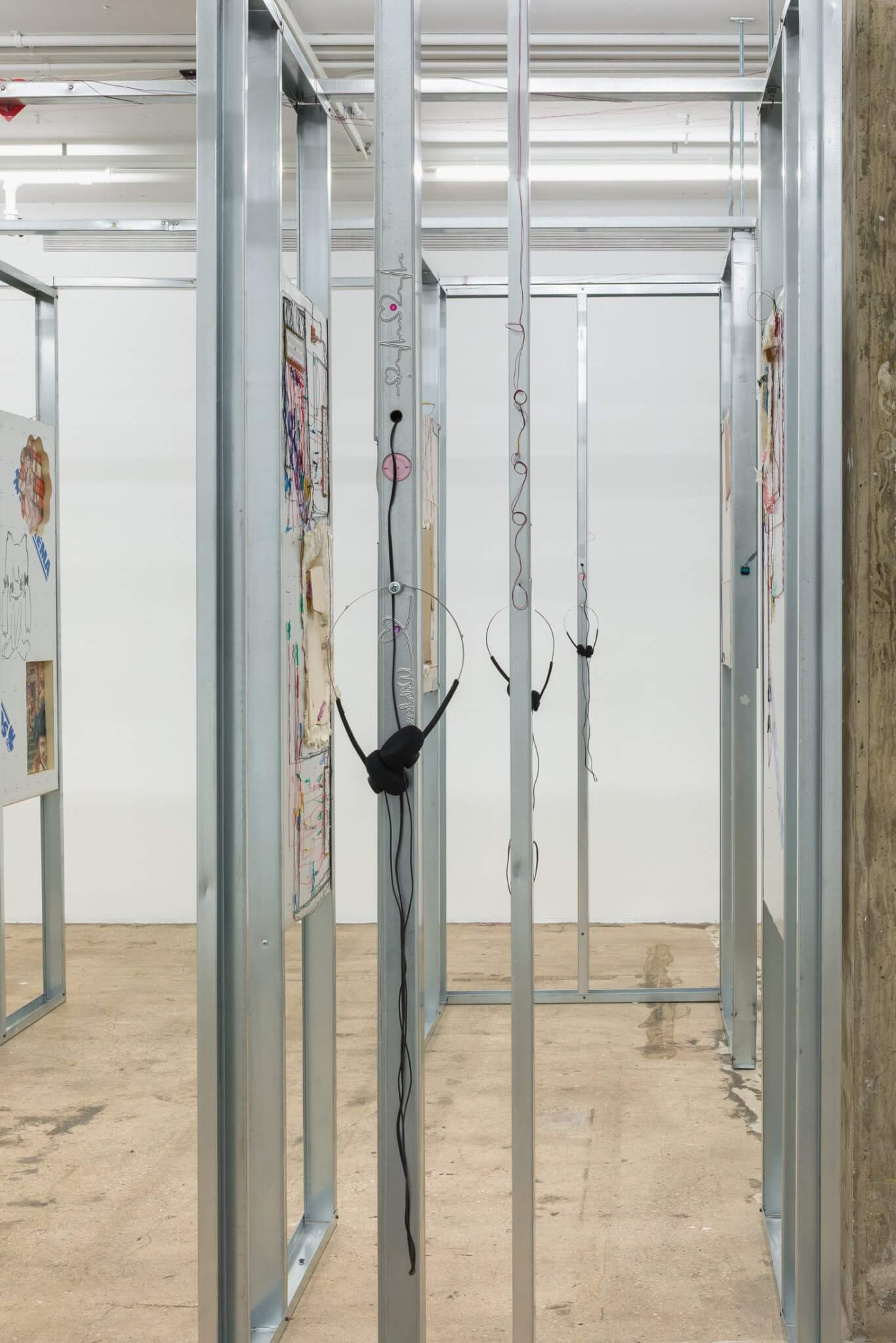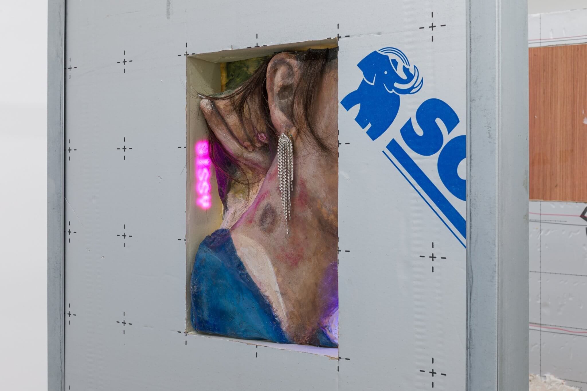 In the lower-level gallery, aluminum studs, which typically undergird walls, both guide the viewer’s navigation through the gallery space and frame the works on view. Filleul’s relief works are built from industrial objects such as insulation boards, foam panels, and concrete, onto which an eclectic variety of materials are applied, ranging from beeswax and mulberry fiber to hemp and LED lights. On the textured, illuminated surfaces of these works, which are often scaled to the proportions of an iPhone, Filleul creates constellations of images with traditional techniques such as clay molding, papier-mâché, tempera, and hot wax painting. Using the gallery’s architectural supports to stage continually shifting perspectives of the works, the sculpted and painted images — depicting anime characters, stuffed animals, and quotidian selfie shots — appear on one side of a given work, while the viewer’s spatial wandering engenders an encounter with a manipulated composition of electronic chips and wiring on the other side. In these ways, Filleul’s works challenge dematerialized conceptions of the online world, instead grounding its profound identity-producing and embodiment-altering effects through a materially attuned visual language.