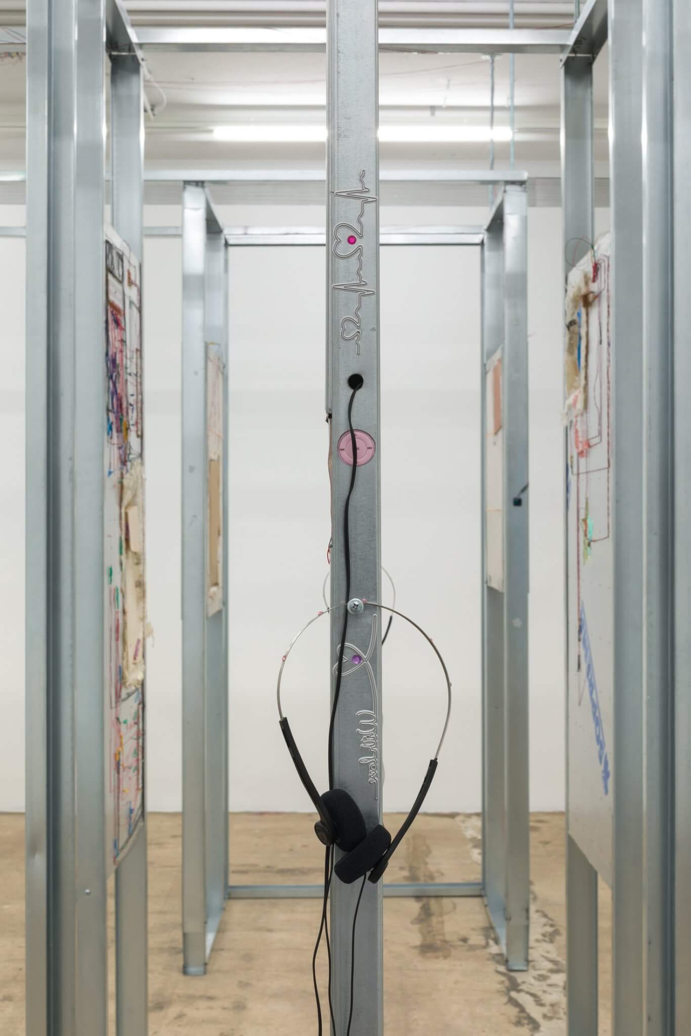 Also in the gallery are a series of listening stations, which viewers are invited to engage via headphones. Each of the stations feature audio recordings of Filleul’s collaborators. By including these recordings, which foreground the varied sonic expressions of queer and trans artists and thinkers based in New York City, ranging from acts of narration to music-making, Filleul seeks to center socially situated and collectively articulated forms of queer creative vitality.