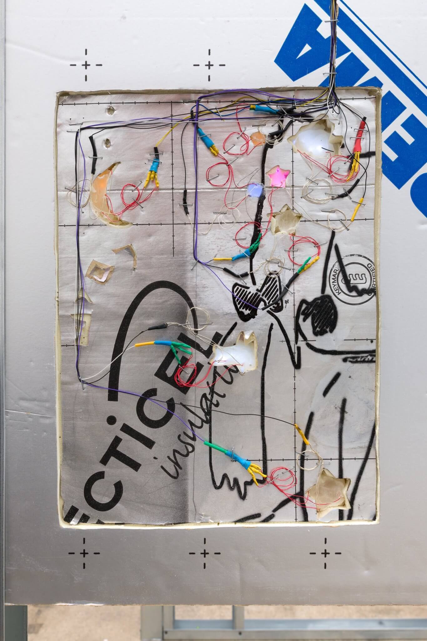 Mona Filleul, R2T4, 2025 (detail). Insulation panel, encaustic on wood, mulberry fiber, tempera, hemp, earring, LED screens, plastic, BA13 plasterboard, electronic components, LED lights.