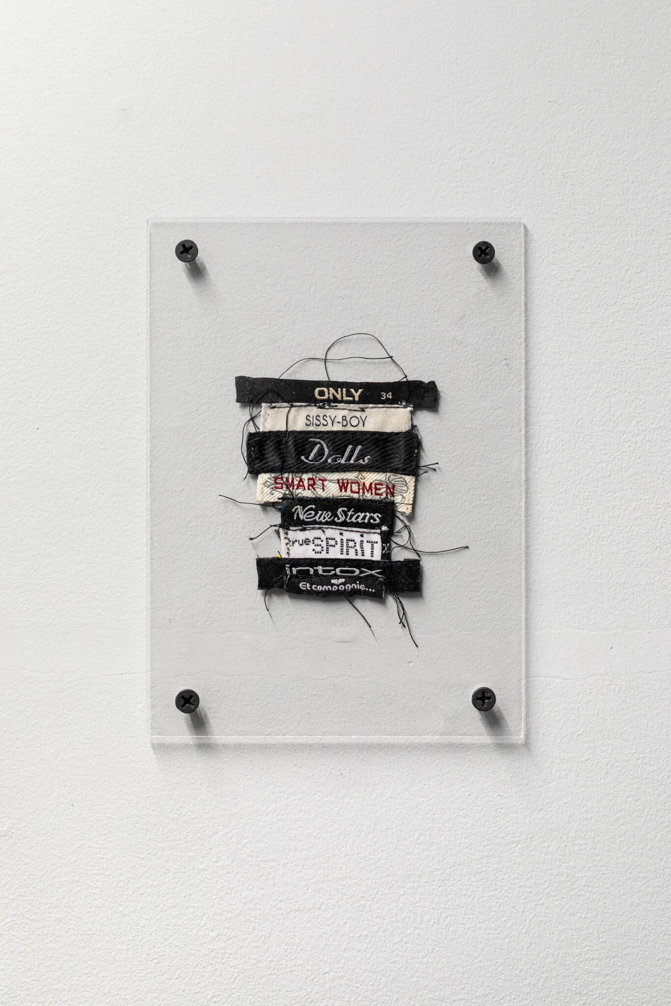 Ix Dartayre, Untitled (for Sissy Institute), 2025. Clothing labels, plexiglass.