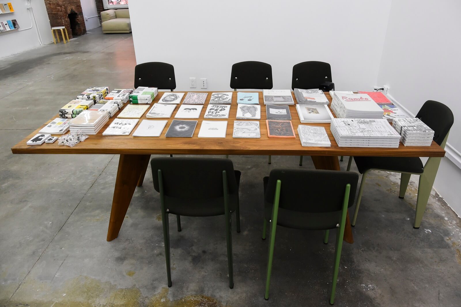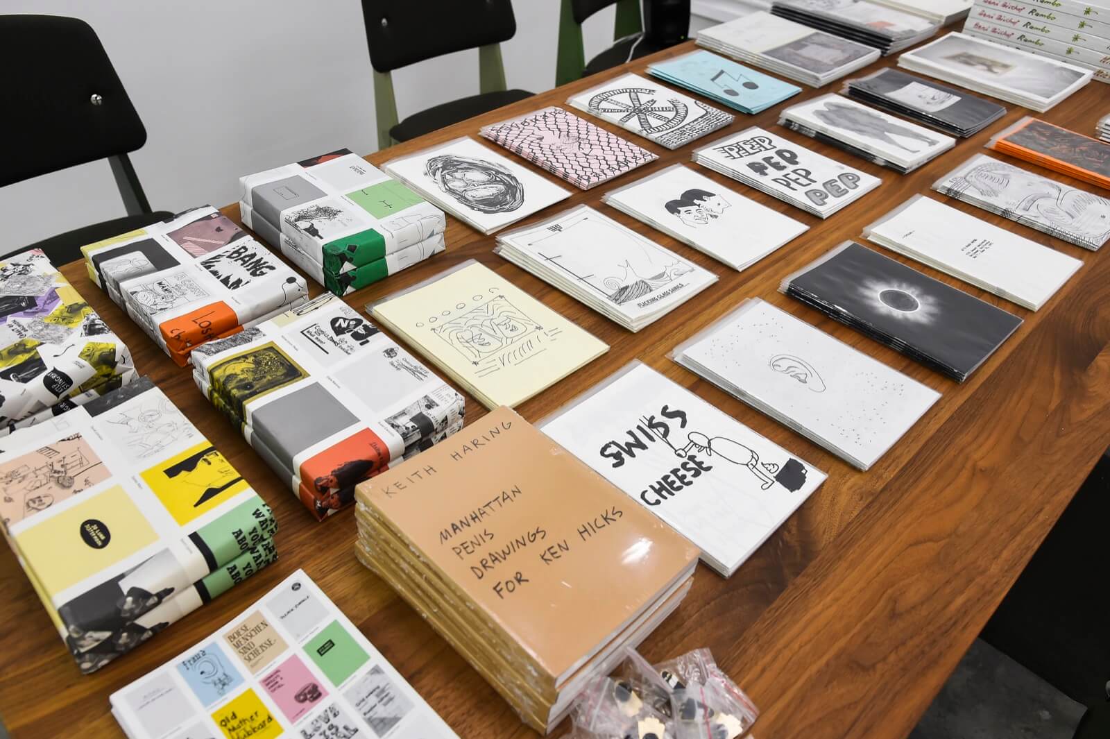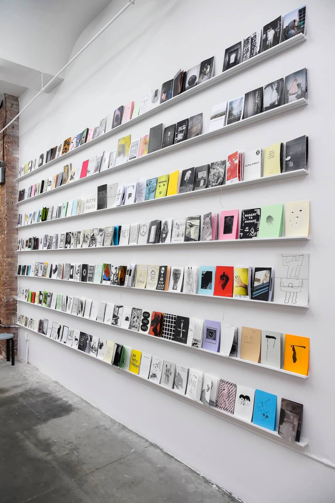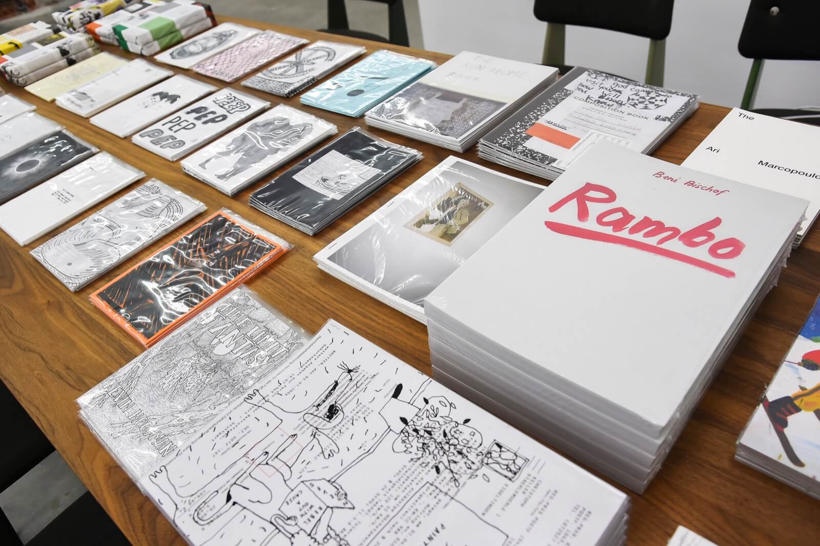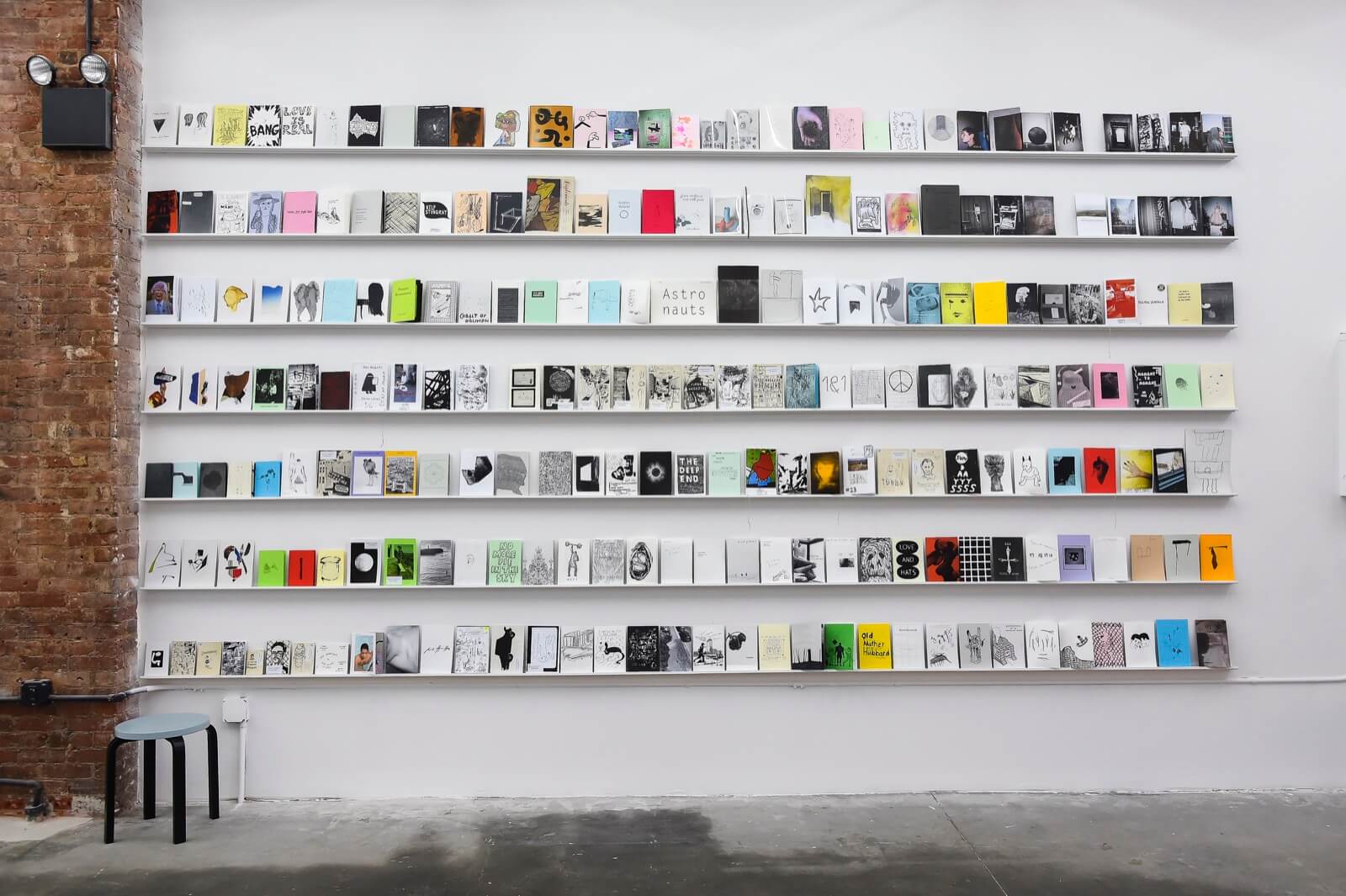 Contributors to the library include Adrien Horni (Turbo Magazine), CH; Aidan Koch, US; Andrew Jeffrey Wright, US; Anne Käthi Wehrli, CH; Ari Marcopoulos, US; Asher Penn, US; Beni Bischof (Laser Magazin & Others), CH; Chihoi Lee (nos:books), HK; Edie Fake, US; Emmanuelle Pidoux (Les Editions du 57), FR; Eunice Luk (Slow Editions), CA; Frédéric Fleury (Les Editions du 57), FR; Hayan Kam Nakache (Tobby Landei), CH; Hendrik Hegray (Nazi Knife), FR; Ingo Giezendanner (Grrrr), CH; Jason Polan, US; Jocko Weyland (Elk), US; Jonas Delaborde (Nazi Knife), FR; Josse Bailly (Tobby Landei), CH; Ken Kagami, JP; Leon Sadler (Famicon Express), UK; Lukas Zimmermann (Marsplastik), CH; Masanao Hirayama, JP; Massimiliano Bomba (Rawraw), IT; Mehdi Hercberg (Shoboshobo), FR; Misaki Kawai, US; Nicole Bachmann (Me and My Friends), CH/UK; Noah Lyon (Retard Riot), US; Panayiotis Terzis, US; Philippe Desarzens (Side Issues), CH; Rachel Domm, US; Remio (Sleepner Zine), NO; Robin Cameron, US; Son Ni (nos:books), TW; Stefan Marx, DE; Stéphanie Gygax, CH; Susan Cianciolo, US; Tauba Auerbach (Diagonal Press), US (list in formation).