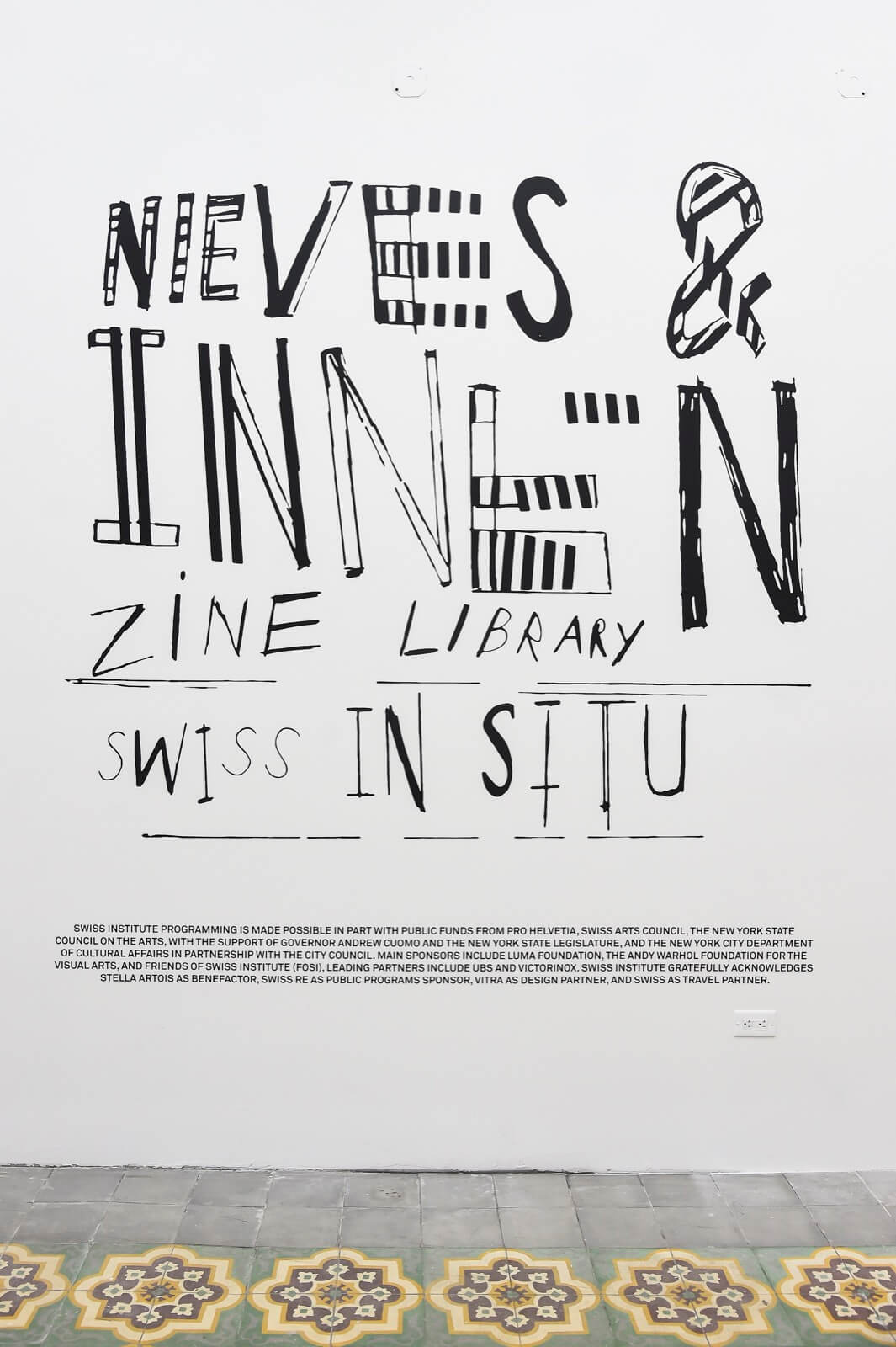 For Swiss In situ's very first installation, independent Swiss publishing houses Nieves and Innen will bring their focus on artist-made zines to NY with a presentation of the hundreds of pocket-sized, image-based publications they have commissioned over the past 15 years. In light of the social and community-oriented nature of zine productions, Nieves and Innen have also invited a group of international collaborators and like-minded producers to exhibit their work as part of the library and to speak in workshops and artist talks about their publishing practices.