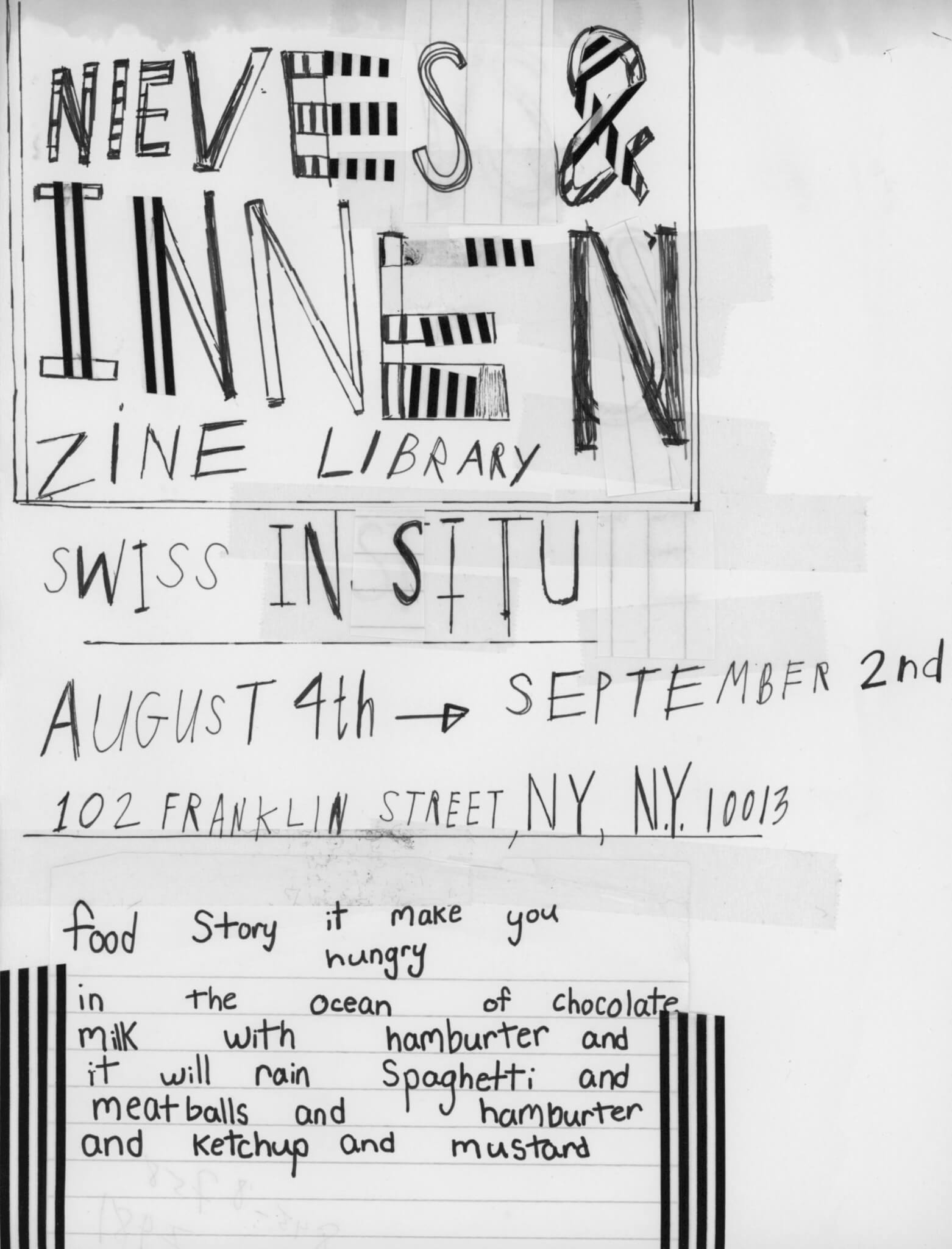 For Swiss In situ's very first installation, independent Swiss publishing houses Nieves and Innen will bring their focus on artist-made zines to NY with a presentation of the hundreds of pocket-sized, image-based publications they have commissioned over the past 15 years. In light of the social and community-oriented nature of zine productions, Nieves and Innen have also invited a group of international collaborators and like-minded producers to exhibit their work as part of the library and to speak in workshops and artist talks about their publishing practices.