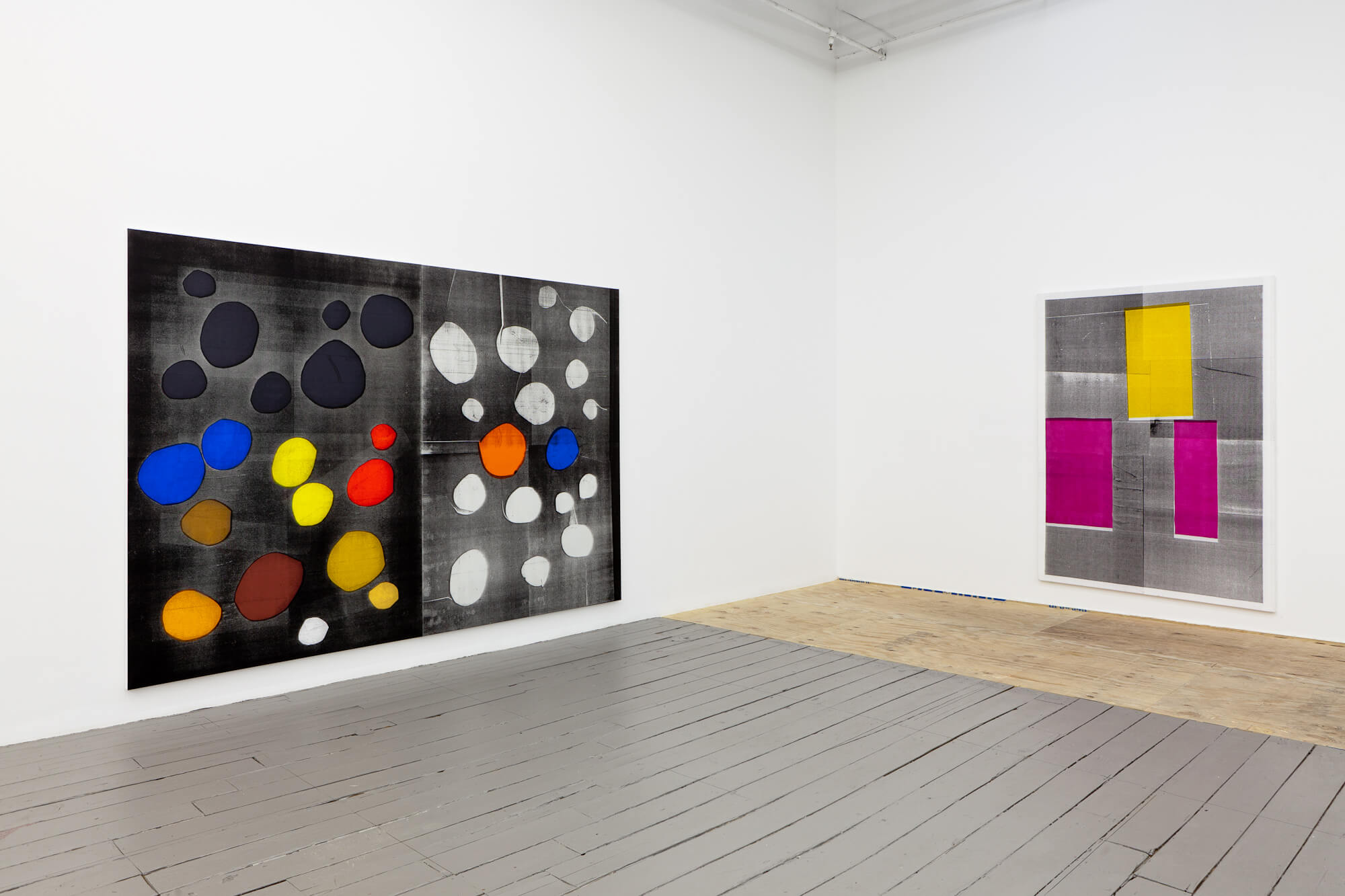 Linus Bill and Adrien Horni began working together just last year, for Horni’s irregularly published magazine, Turbo. As a result of their first effort, they were commissioned by the Swiss Advertising Commission to create a publication presenting the awardees of 2011. Limited to the palette of the original source material, the two employed strategies of collage and abstraction to create a varied, textured output. For this exhibition, the artists adapt the imagery by expanding its scale and sourcing silkscreen and painting to achieve a rhythm which is both fast and slow, one that confounds medium specificity.