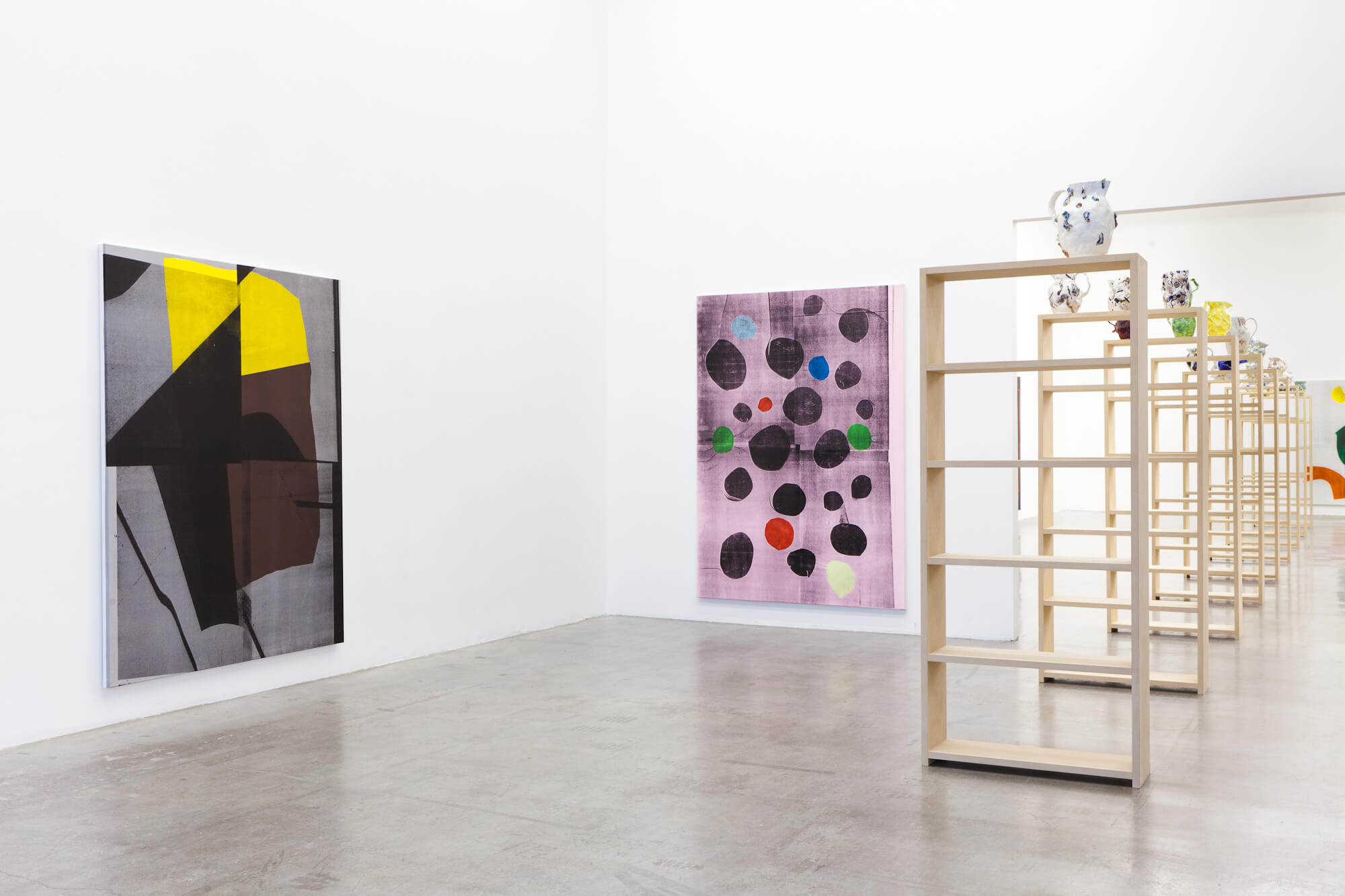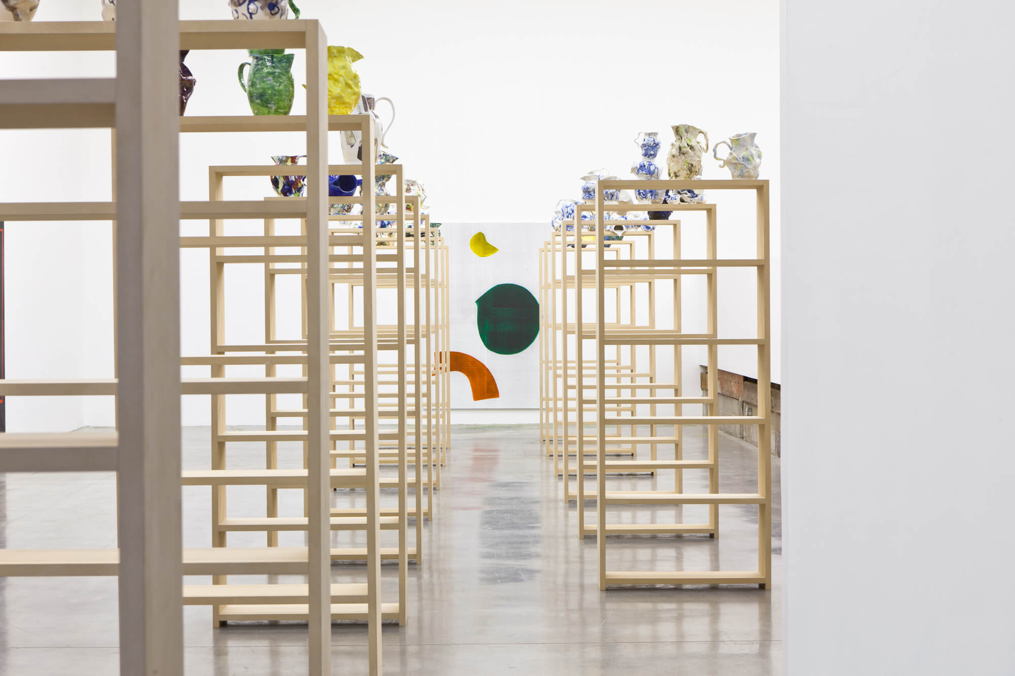 Painting and Jugs is comprised of large scale paintings and handmade ceramics, combining two adaptations of traditional media. Although presenting two divergent forms, painting and ceramics, the exhibition underscores affinity for collaborative production, a mode at the core of both bodies of work. This optimistic model generates questions about ideal working habits and examines the philosophical riddle of the individual versus the whole, or alternatively, the dissolution of ego and formation of community.