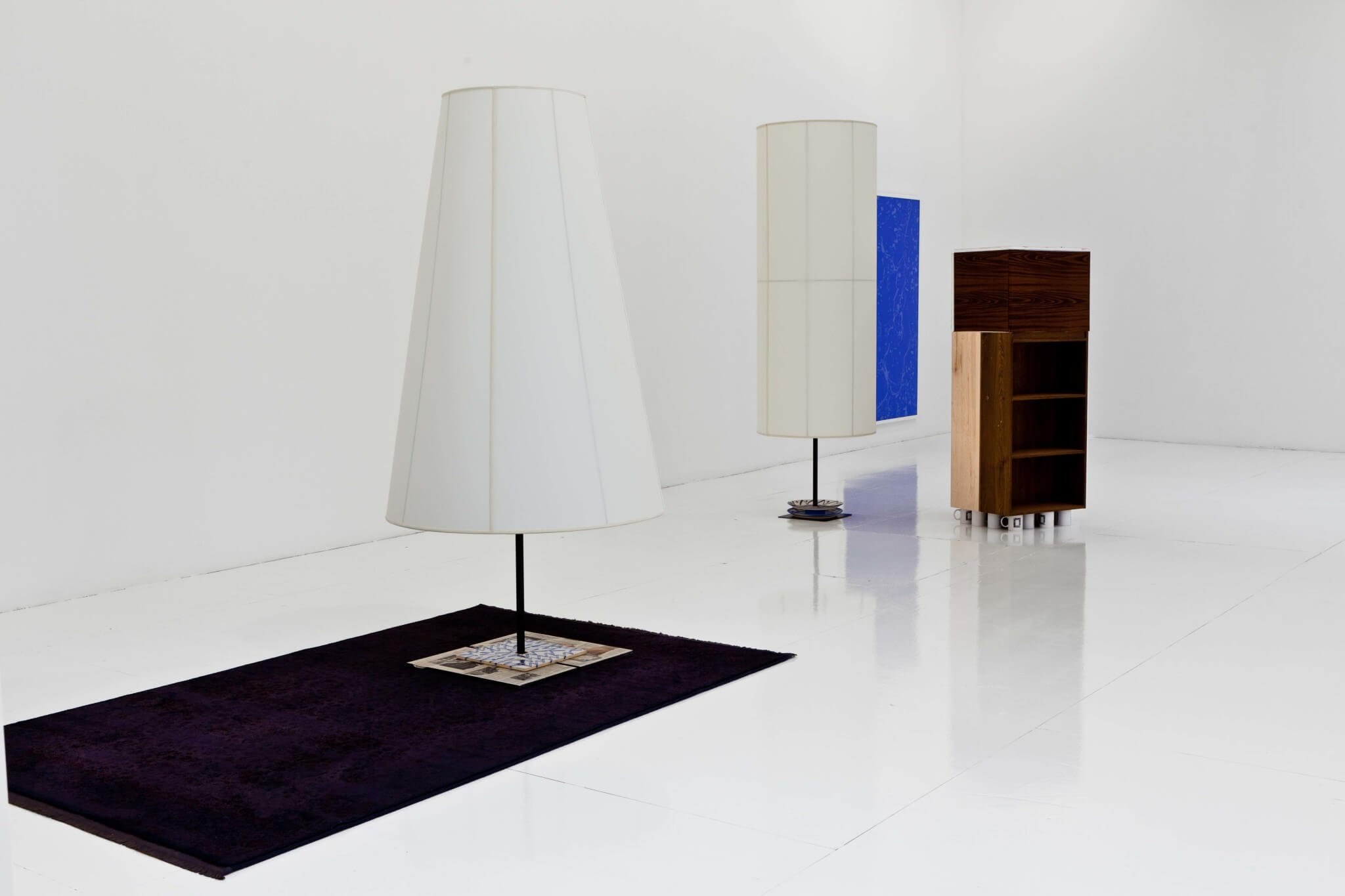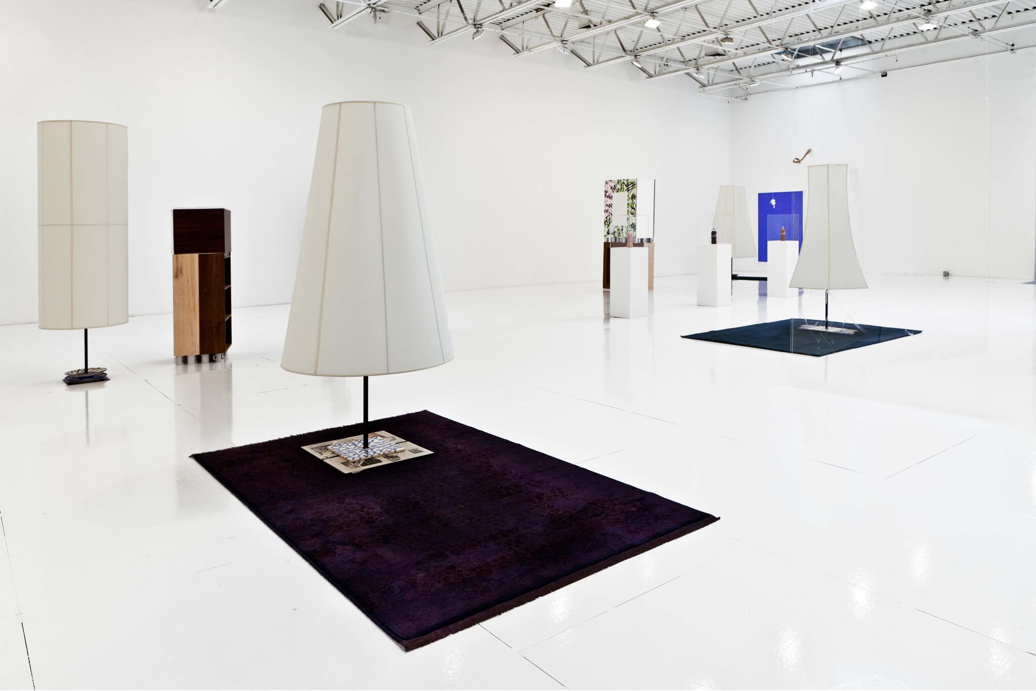 Nikolas Gambaroff (b. 1979, lives in New York) presents an updated version of the work, The Seven Habits of Highly Effective People, initially shown at Bergen Kunsthall in 2010. The title is borrowed from a highly successful self-help book. Each work is named after a chapter or “habit.” In this iteration, some of the sculptures, such as Be Proactive (2011) or Sharpen the Saw (2011), are body-sized lampshades, which are placeholders for pieces that have been sold. Comprised of linen stretched over metal frames, the lampshades reference painting on a structural level and relate to the human body in their posture and size.