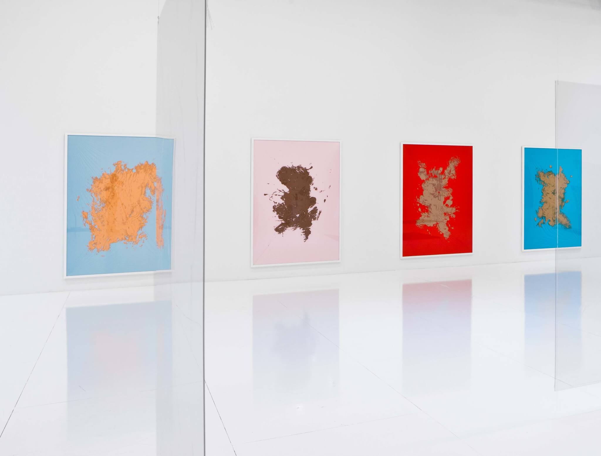 Anthropomorphic proportions are re-iterated in all rectangular work in the show, where the size of blankets—typically a layer to cover the human body—establishes a standard format. The bright background colors of the framed series The Most Important Body of Water is Yours are borrowed from Evian and translated into the gay palette of spandex, a fiber used for sports clothing where stretch is desired. The four-part work openly plays with stereotyped Abstract Expressionism. But Rosenkranz has applied color through intermediary foil using a monotype printing process, creating distance between her and the surface of the work, thus eliminating a subjective expression.