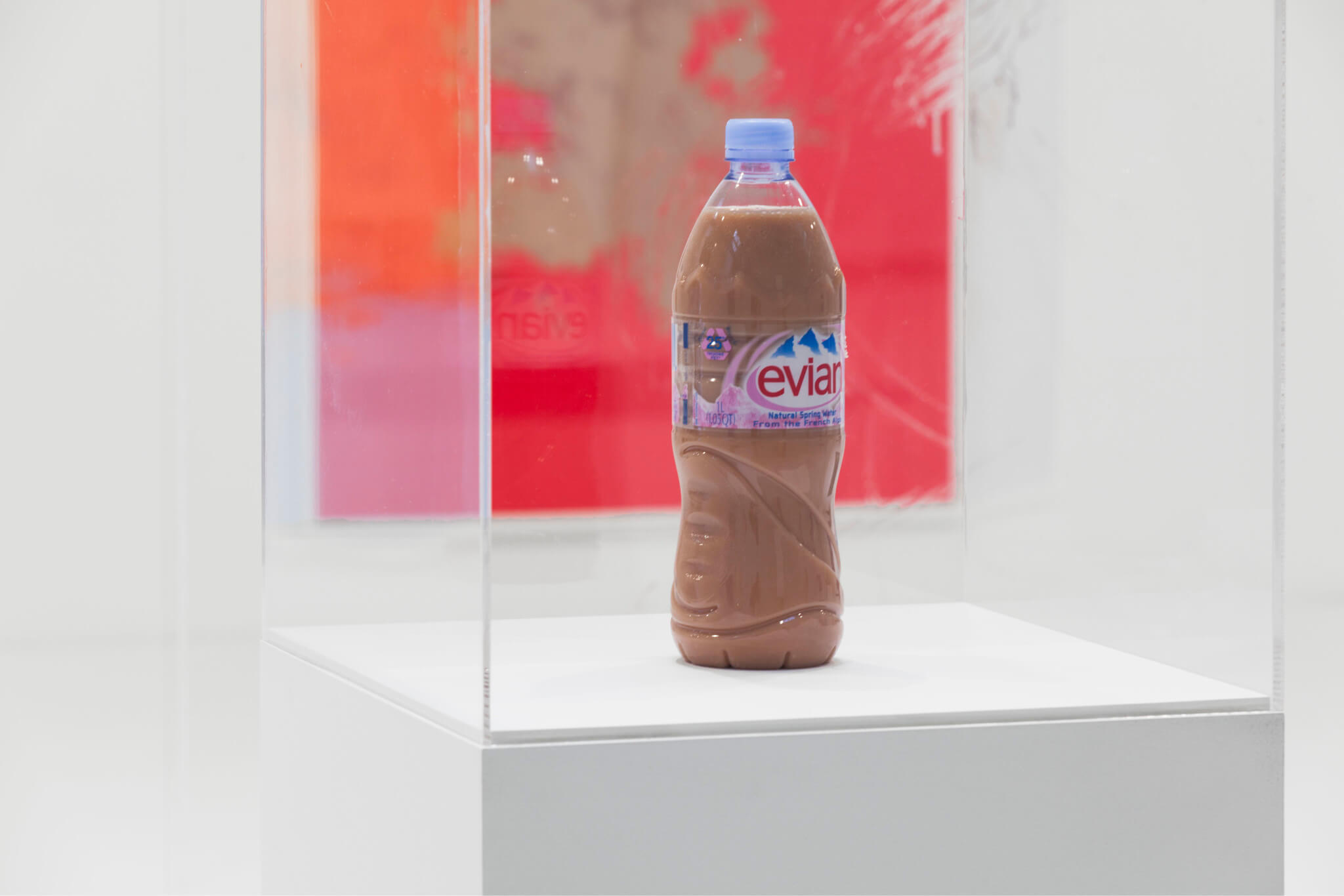Recent scientific experiments have demonstrated that our perception of color is a result of evolution. Pamela Rosenkranz investigates how such ideas undermine artistic production as such. In the series Firm Beings, plastic water bottles of Evian are filled with a product normally used to apply artificial patches on actors’ skin. The tones selected by the artist represent the flesh colors of predominant target groups for Evian. The combination of product and idea, surface and volume, skin and water, culminate in an abstract portrait of the human body in a bottle.