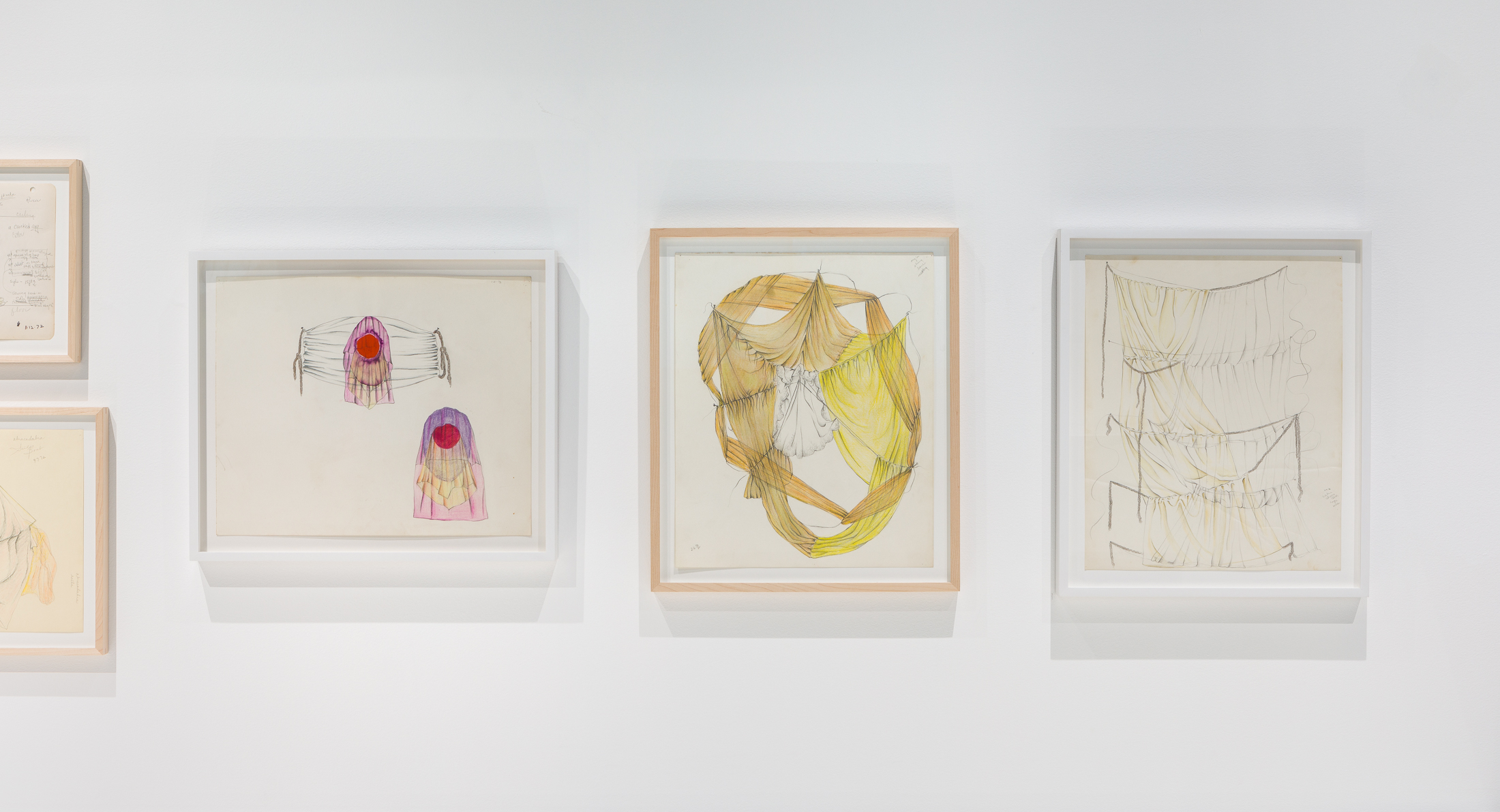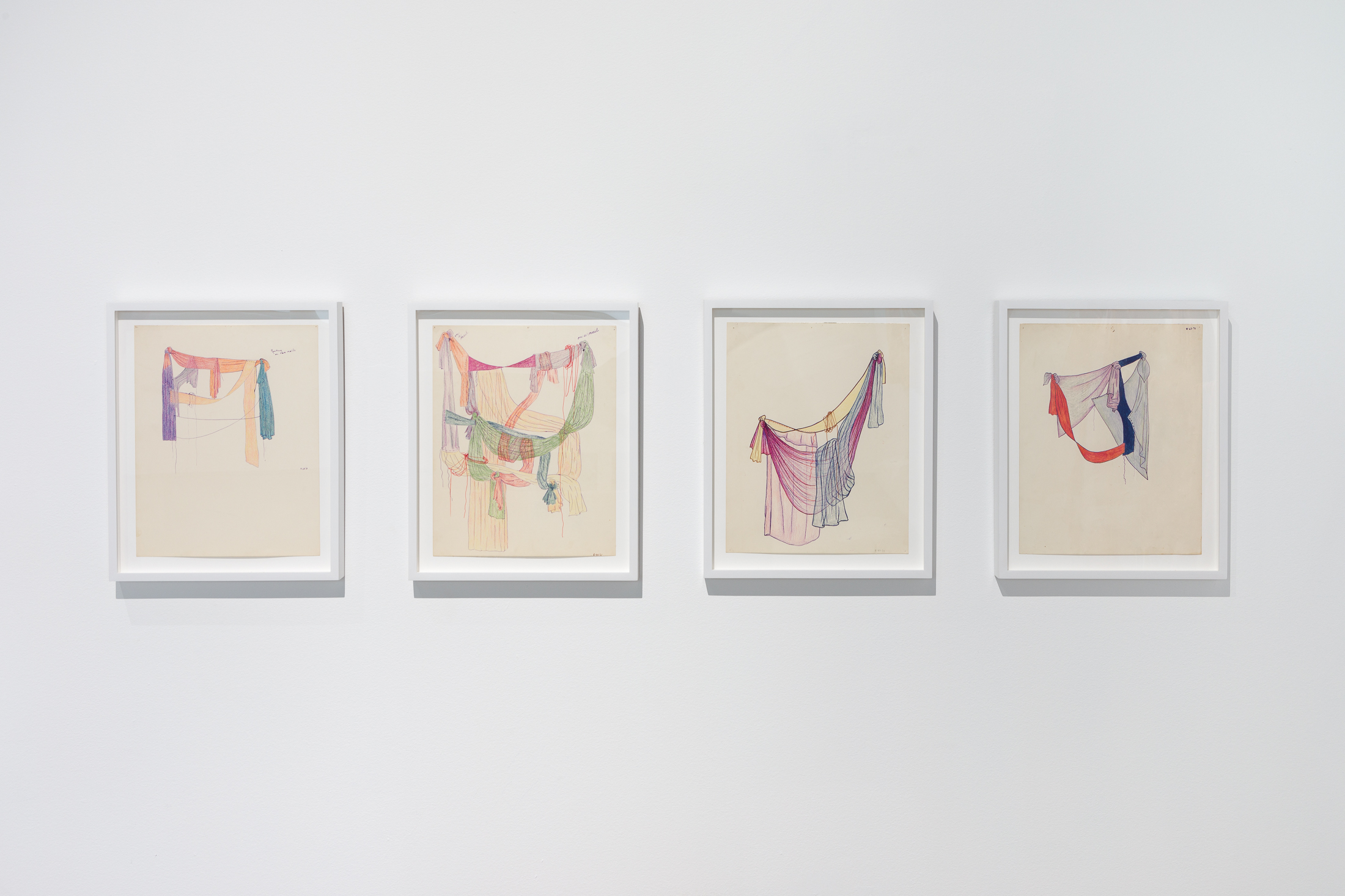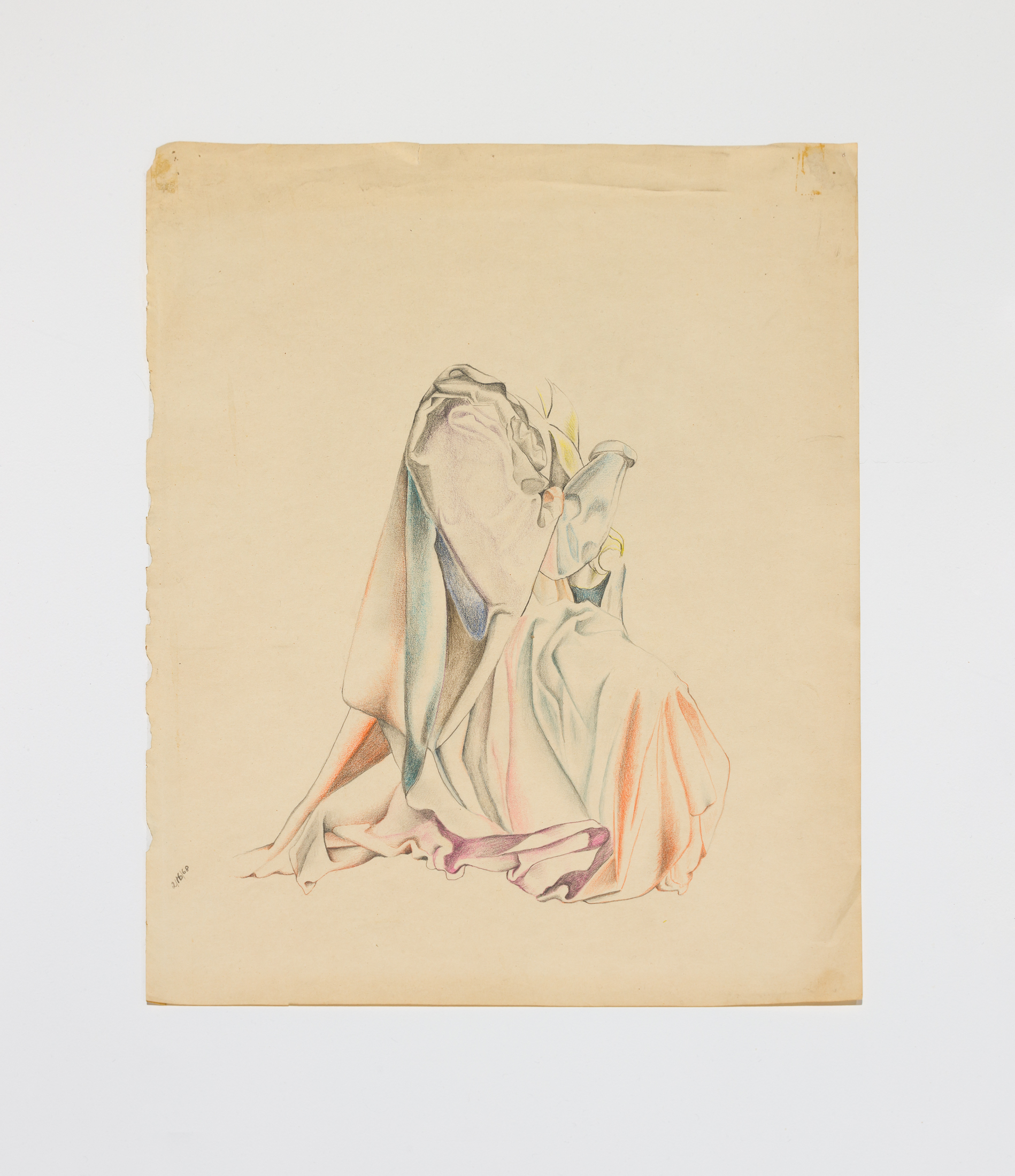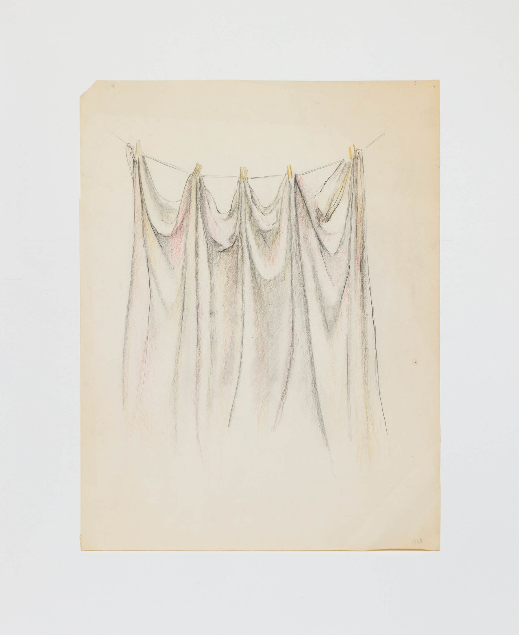 That same year, she began taking part in a small consciousness-raising group and started incorporating feminist gestures into her work, including naming her sculptures after historical female figures and employing materials and motifs that were traditionally considered feminine. In 1972, she became one of the founders of A.I.R., the women’s cooperative gallery in New York, and had a solo exhibition there in 1973, producing large textile sculptures in which layers of fabric were hung from scaffolds and frames. The exhibition at SI marks the first time that Galla Placidia (1973), named after a 5th century Roman Empress, has been shown in the US since. As the critic Lawrence Alloway wrote of this work in Artforum in 1976: “the feminine figure is absent as well as present, missing as well as given.” Several drawings in the exhibition, made after a research trip to Europe in 1975, highlight this preoccupation, depicting garments worn by invisible bodies that were inspired by figures from Baroque and Mannerist painting, or petals and leaves dissolving into formlessness.