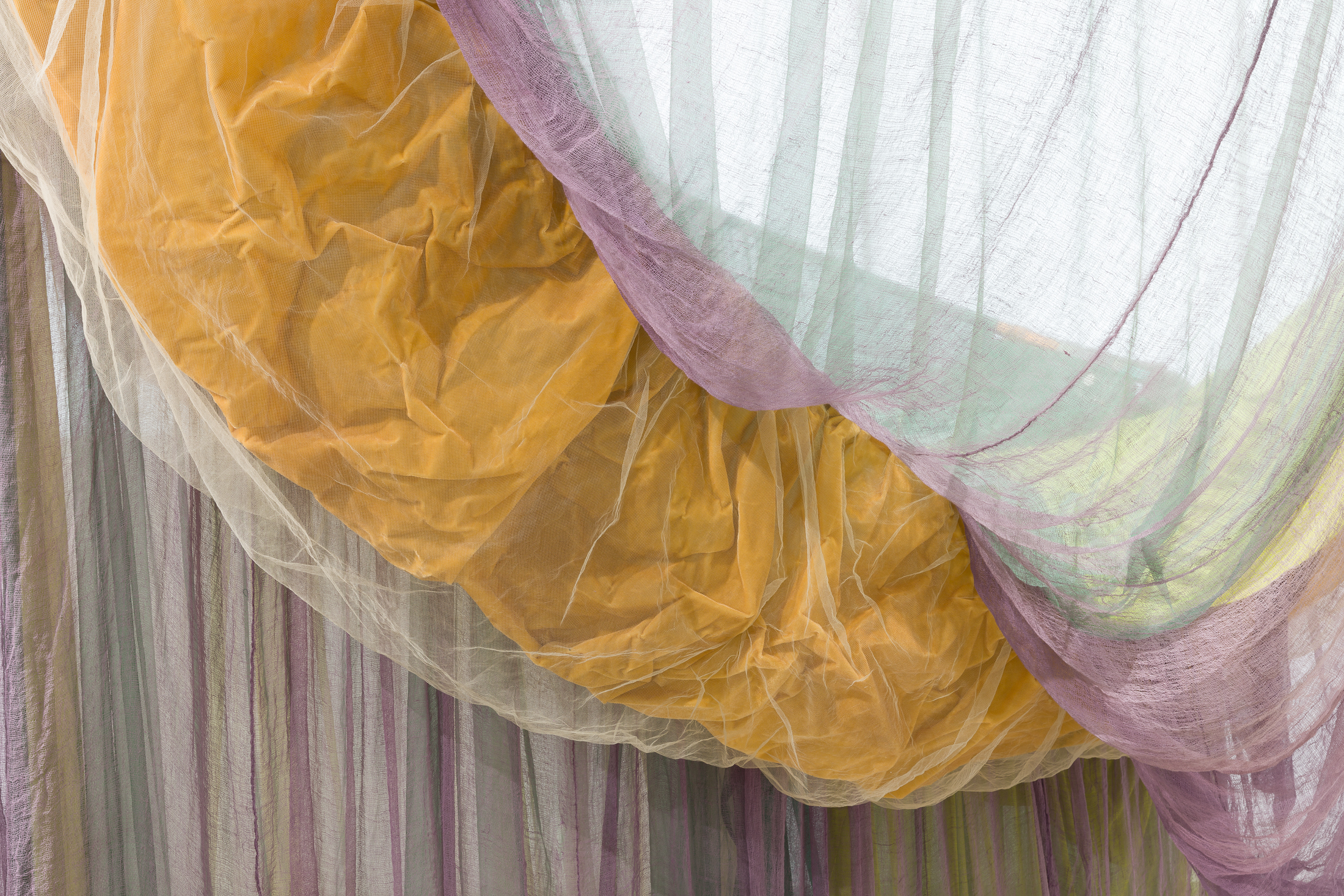 In 1971, Mayer began creating wall-based works by layering multiple fabrics, as well as working on drawings of “impossible” fabric sculptures that were connected by multitudes of knots and loops.