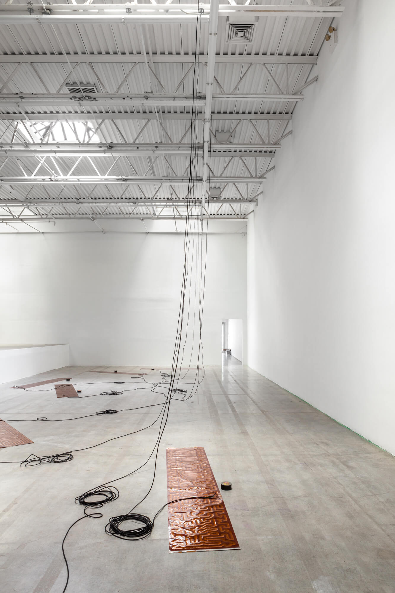 For Sam Lewitt’s first institutional solo exhibition in New York, entitled Less Light Warm Words, the artist has removed all of the fluorescent lights from the ceiling rig in Swiss Institute’s main gallery and redirected the total available electricity into custom-designed flexible copper heating circuits. These slim, sensitive micro heaters are larger versions of the kind used in precision technologies that require a regulated temperature in order to function smoothly, and are used everywhere from satellites to medical equipment. This transferal of energy – from light to heat, from ceiling to floor – reorganizes the building’s existing electrical infrastructure, delineating and redirecting usually imperceptible currents and flows.