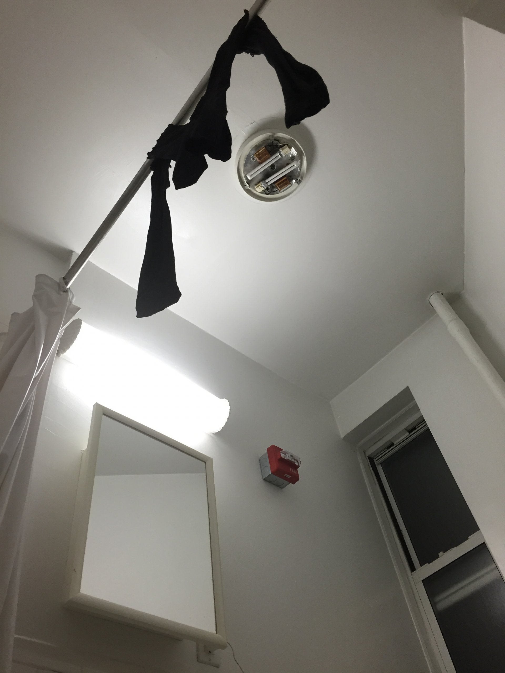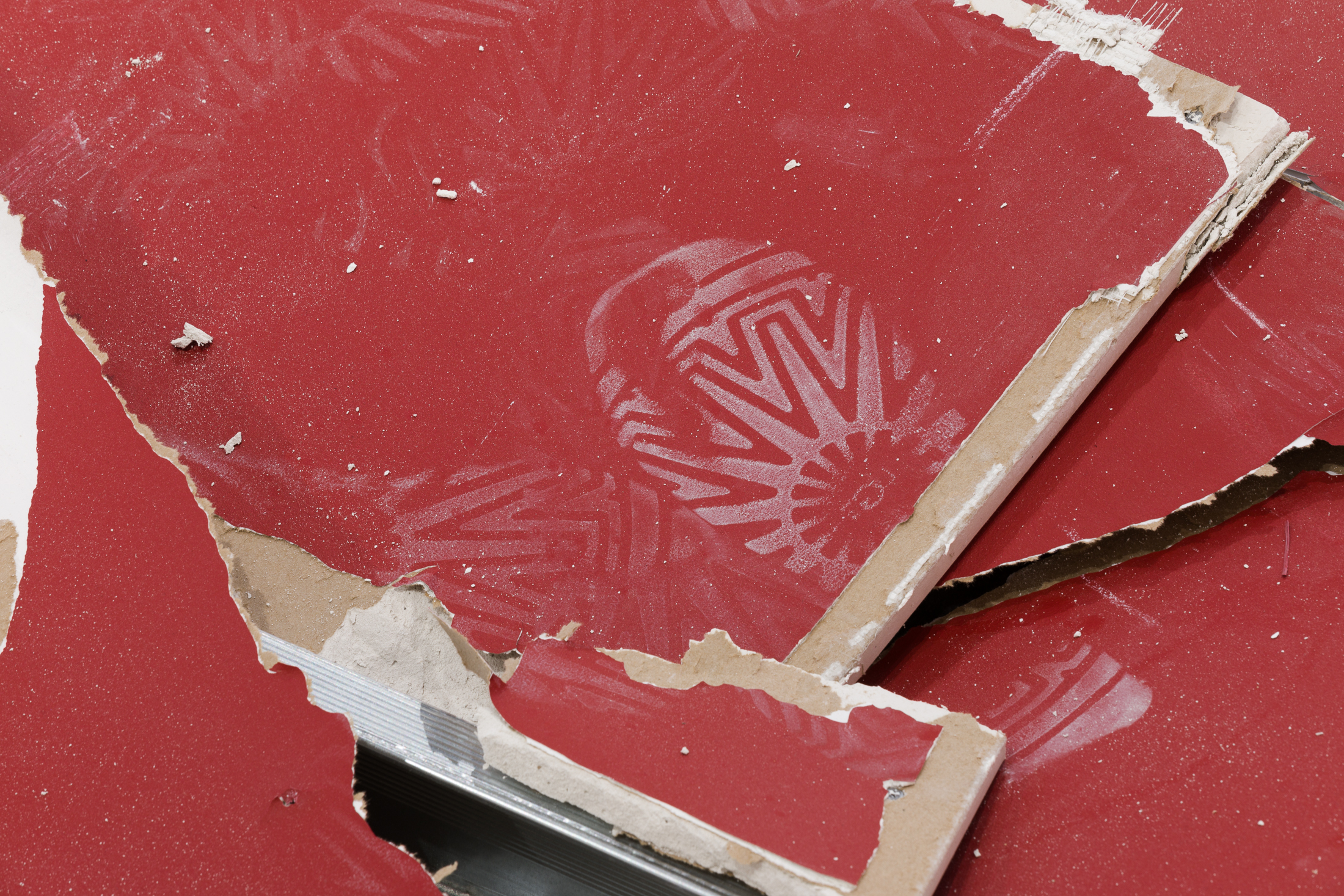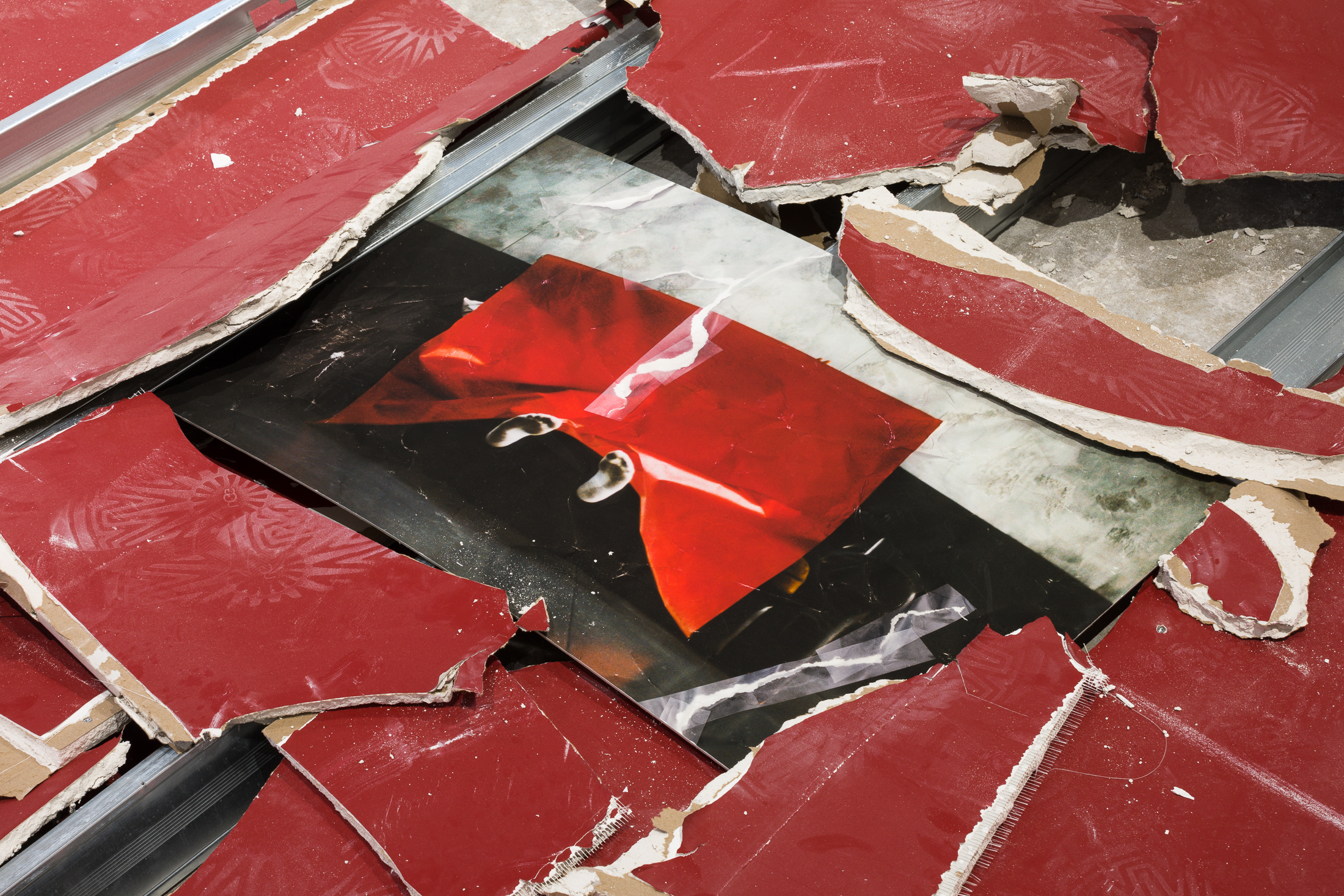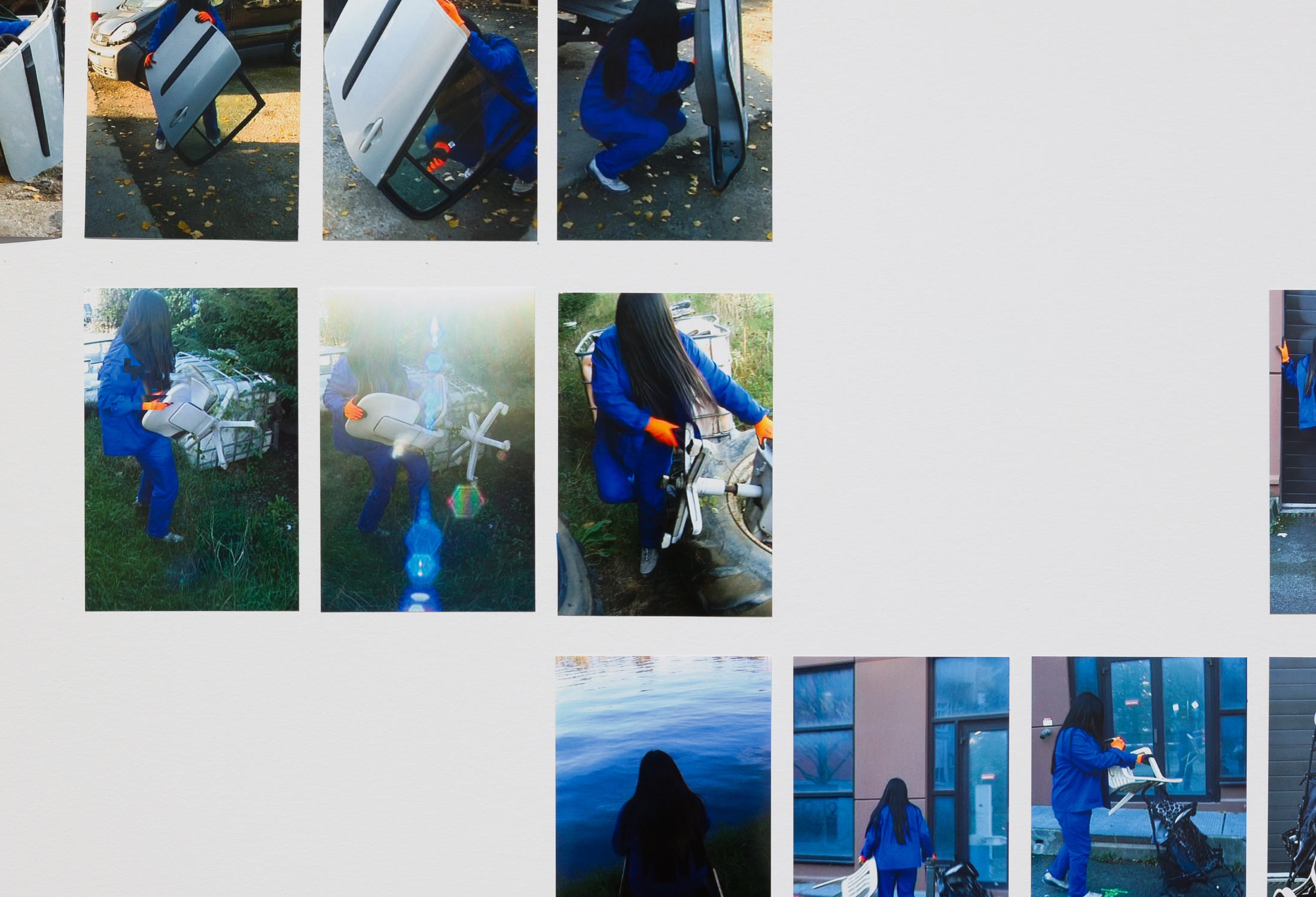 In recent years, Serpas has made numerous freestanding sculptures from discarded items found on the streets of cities where she was invited to exhibit her art. In what the artist classifies as a private performance, she athletically arranges various forms of trash in galleries, held together only by gravity and destroyed following their display. For her exhibition at SI, this practice of assembly and deconstruction is pictured in atmospheric photographs taken by artist Rafik Greiss in Paris: on the street, in the studio, in a junkyard and in a forest on the outskirts of the city. Coolly composed, with Serpas in customized jumpsuits circulating her creations, Greiss’s near-still lives merge styles of formal documentation and fashion editorials. These pictures adorn a prop wall that blocks the gallery’s street-facing windows, commanding SI’s own architectural body, ascending through the ground floor to the gallery above.