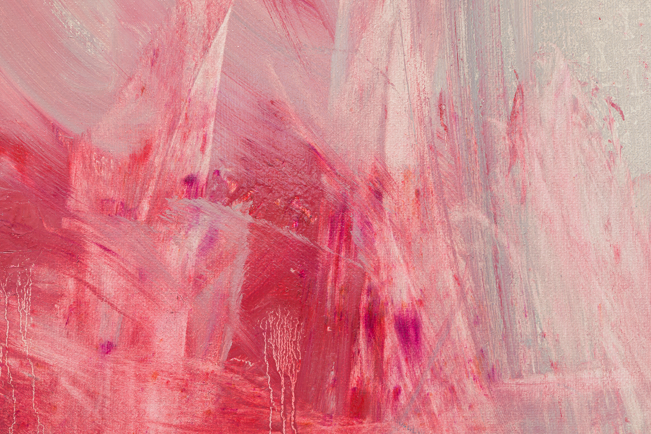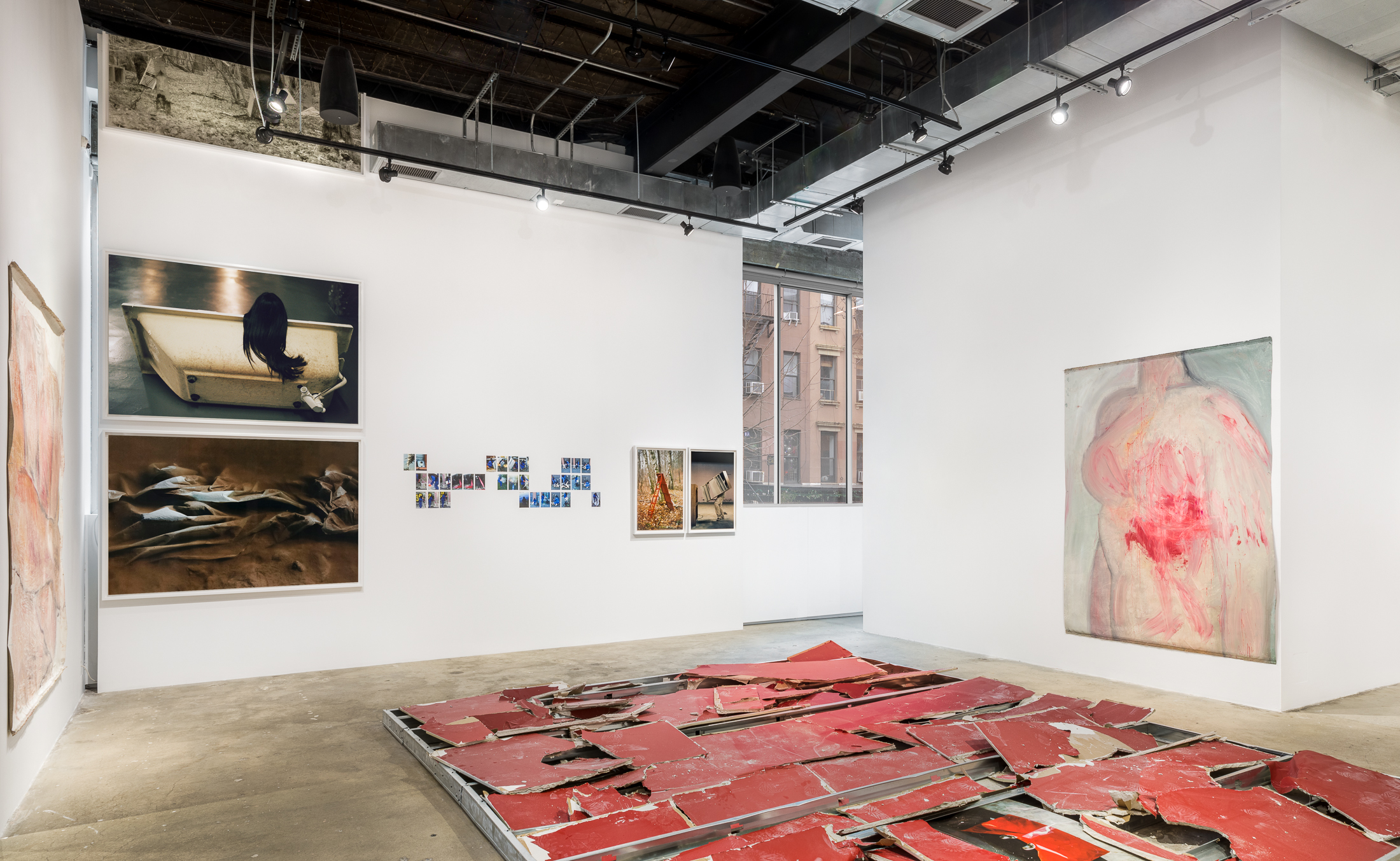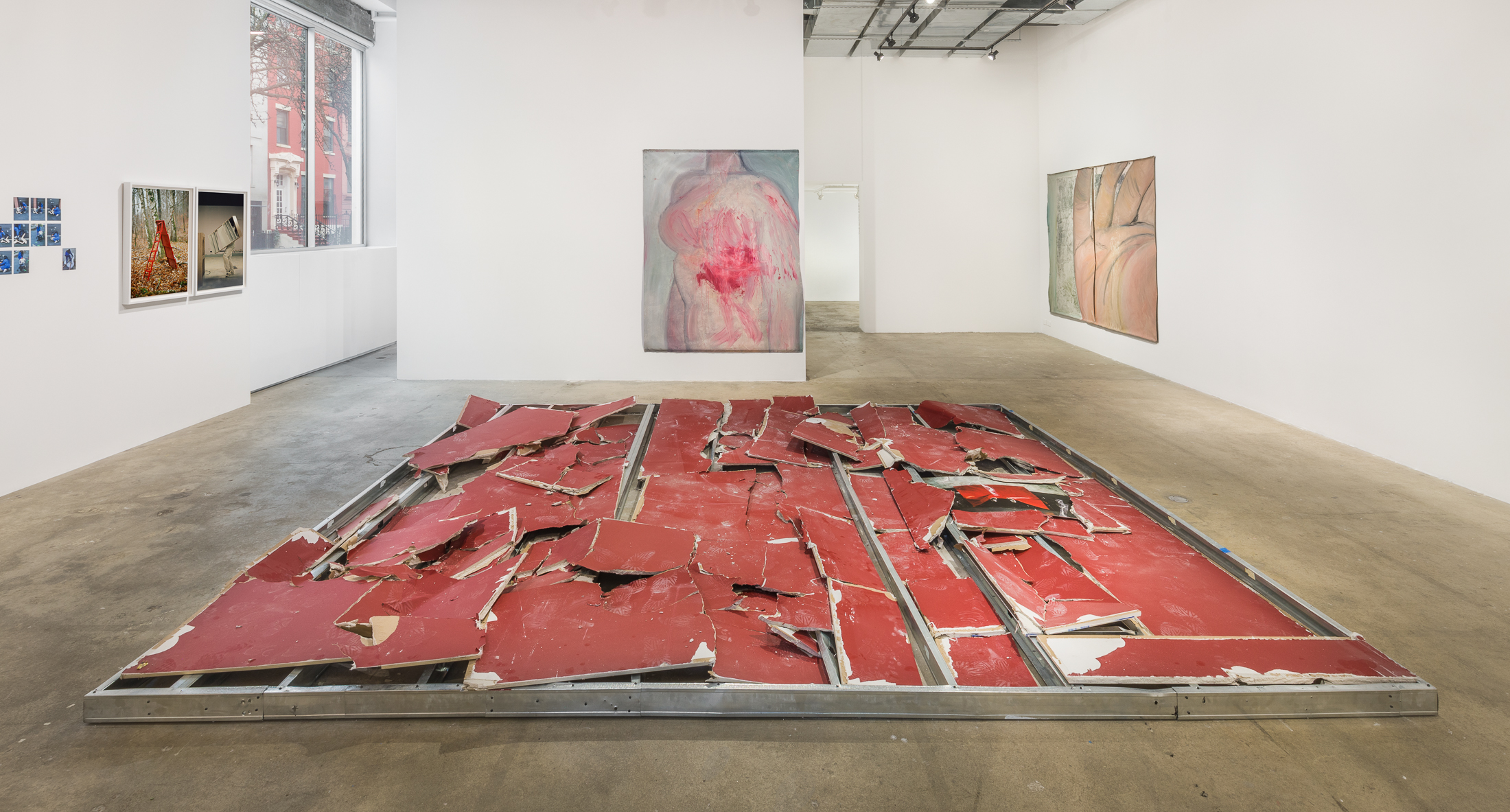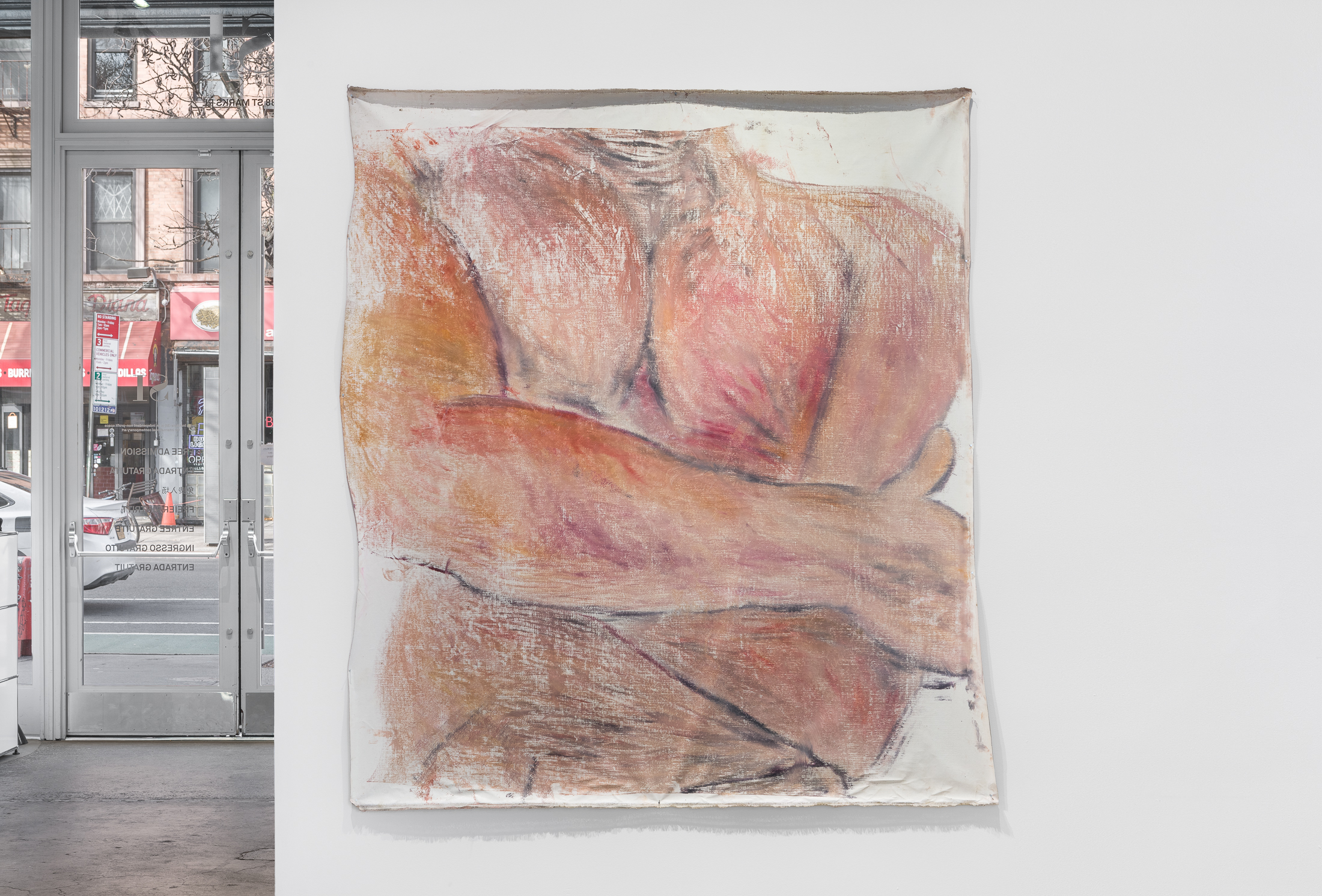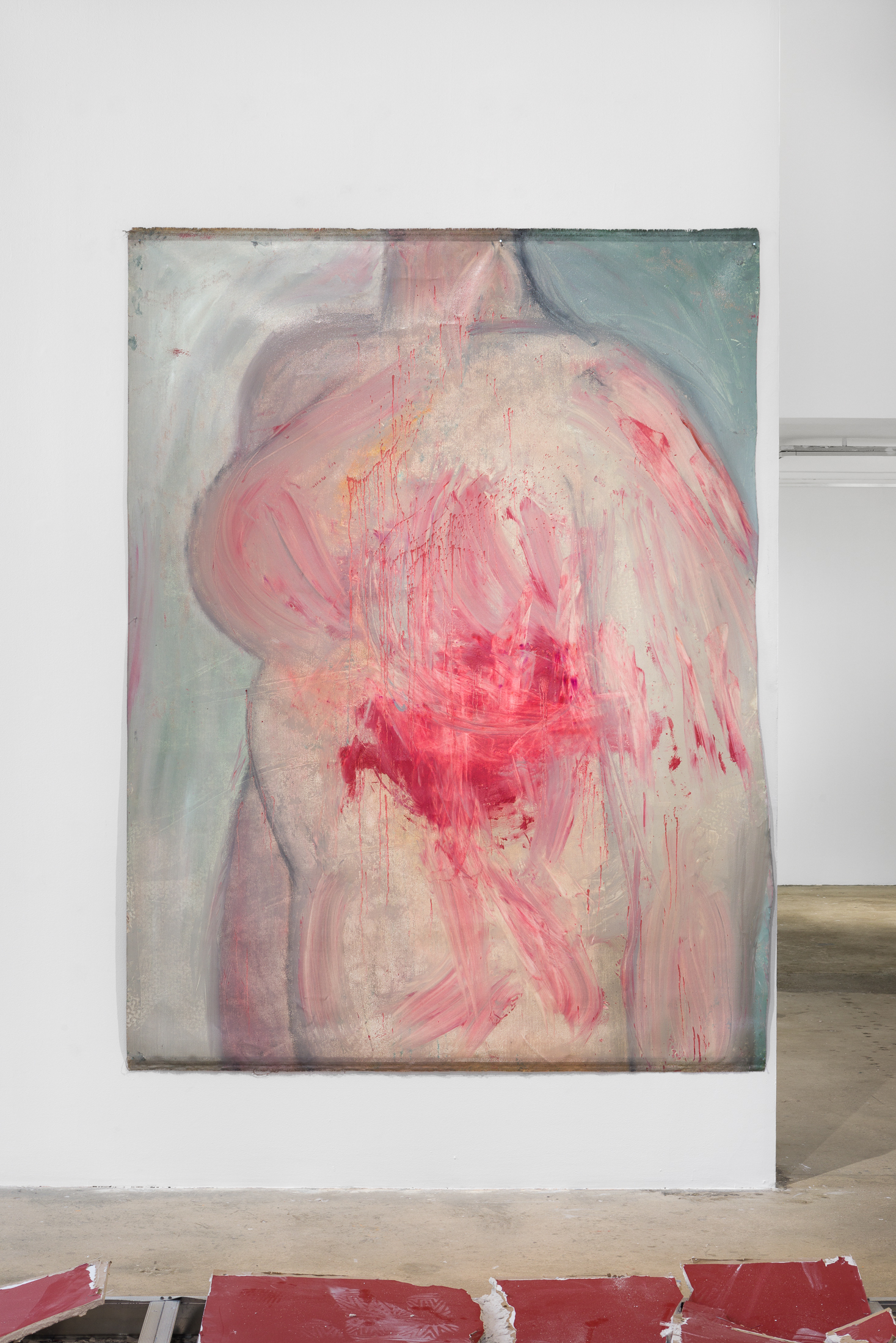A collapsed crimson wall, a remnant of the gallery’s previous exhibition, is recast on the first floor of SI as a red carpet. Large paintings of busts, torsos and appendages hang on the surrounding walls. Faceless, anonymized and set against flattened backgrounds, these figures disintegrate into melts of flesh, some of which are bloodied with splatters and pours. Paints drip, sweat-like, into one another, evincing the artist’s quick choreography. Serpas selects her subjects from snapshots saved to her phone’s camera roll as well as apps and websites in which cosmetic surgery patients post photos of their bodies to solicit advice regarding procedures.