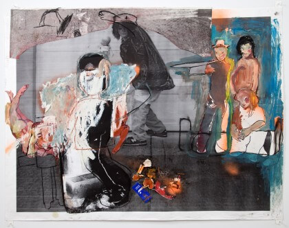 Shadow Fux, the artists’ first collaborative presentation aims to create a veritable alien, who stalks the viewer from the fringe of the exhibition space. Taking the recent film Trash Humpers (2009) as its point of departure, the exhibition features large scale works in which Ackermann and Korine have collaged, painted, and drawn over stills of the film’s beguiling young bodies with old faces. Produced in a call and response method, the collaboration illustrates the importance of cutting to both artists’ works. Editing and splicing, Ackermann and Korine insert absurdist moments into narrative tropes, subverting plotlines and ultimately defying our expectations towards story telling.
