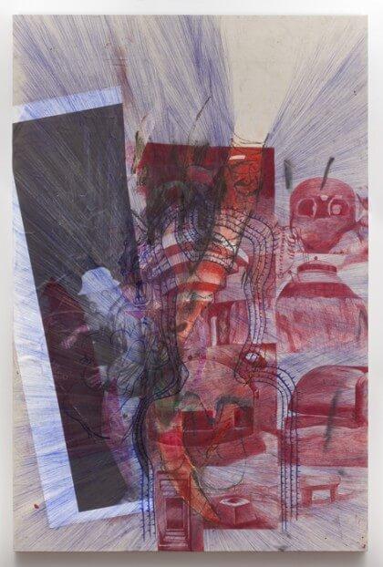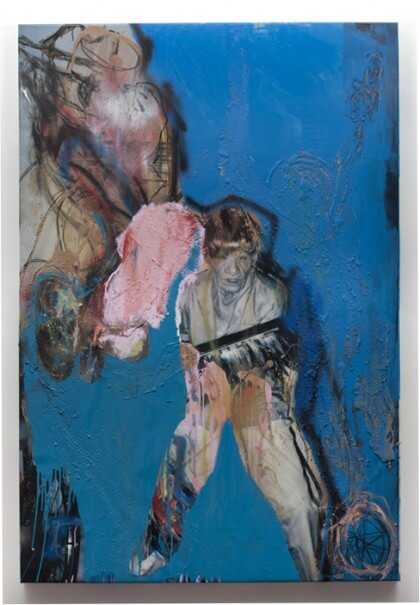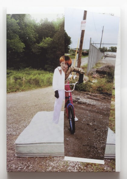 Bmxhex (2010), a towering collage, is composed of two scenes––a redheaded half-figure standing on an abandoned mattress, and, grafted onto it, a quarreler sitting on a BMX, ready to take off. The composition is a phantom for the split personality, which runs throughout the show.