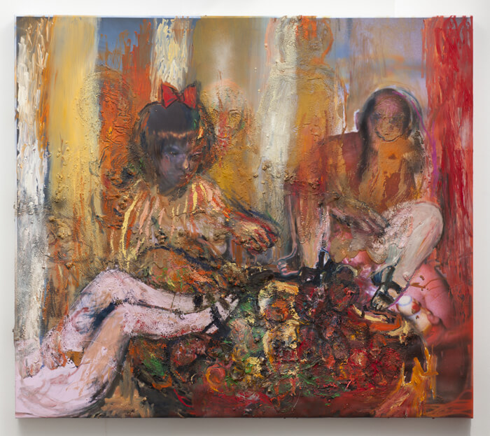 The eerie paintings and their filmic complements are an unyielding monument to the freak, the hysteric, the rake, and the eccentric. In the painting, sekret clubs (2010), a family of coquettish elders emerges from a thick coat of paint, which has been scraped down, reworked, and built up again. This rising ruin finds similarity in an adjacent film, deleted scenes from Trash Humpers (2010). Lunatic screams ricochet throughout the gallery, the din provides a voice for the otherwise silent painted figures.