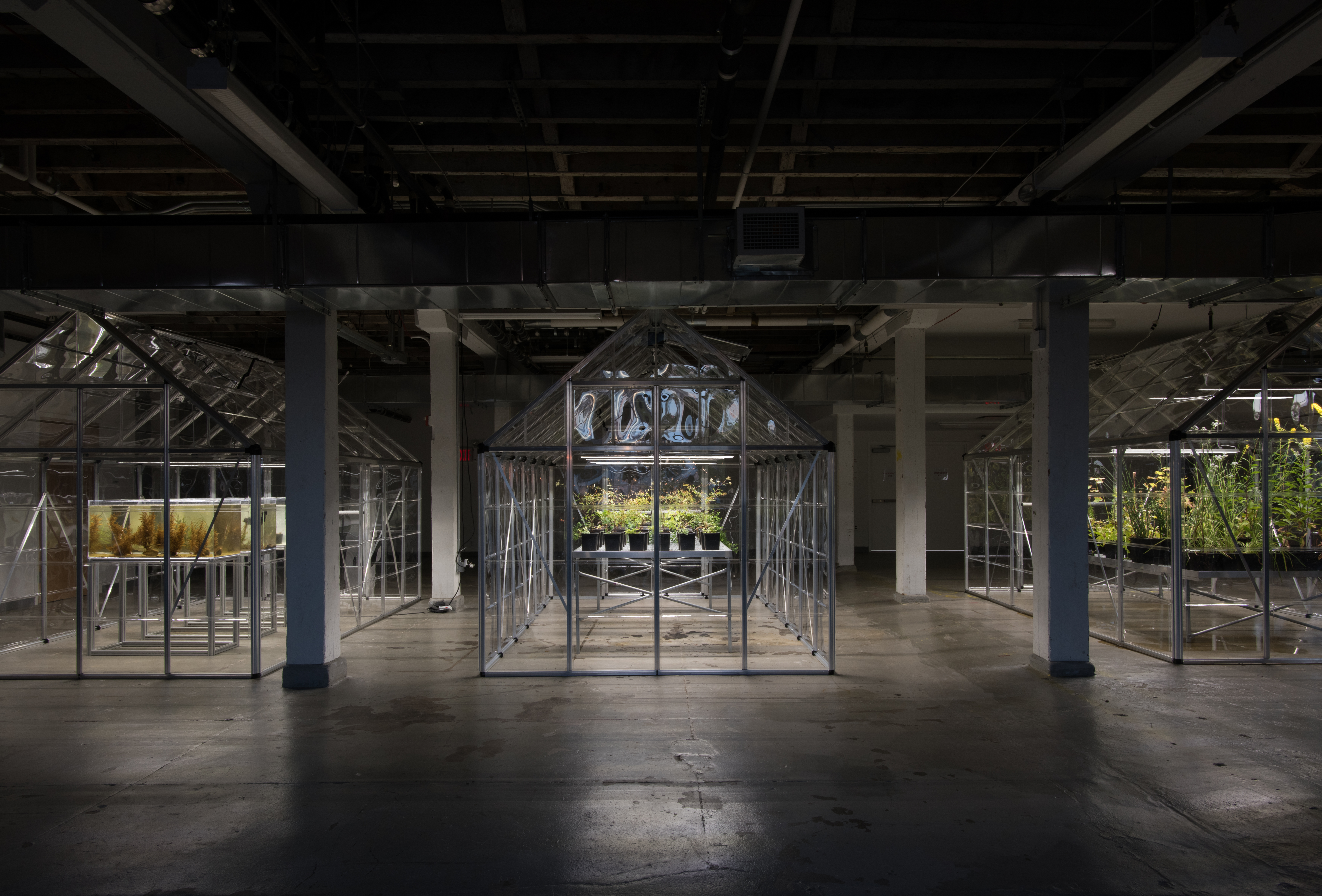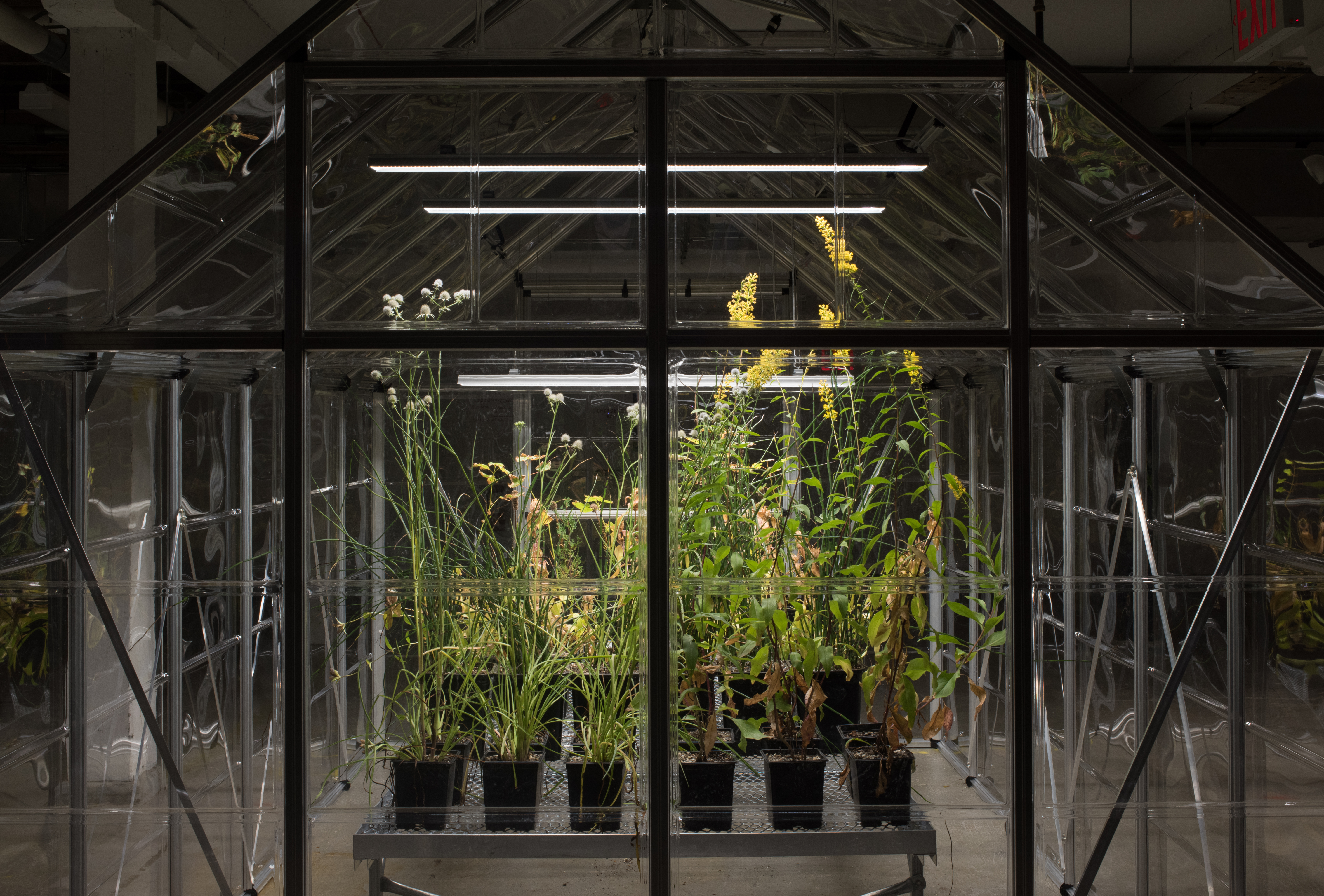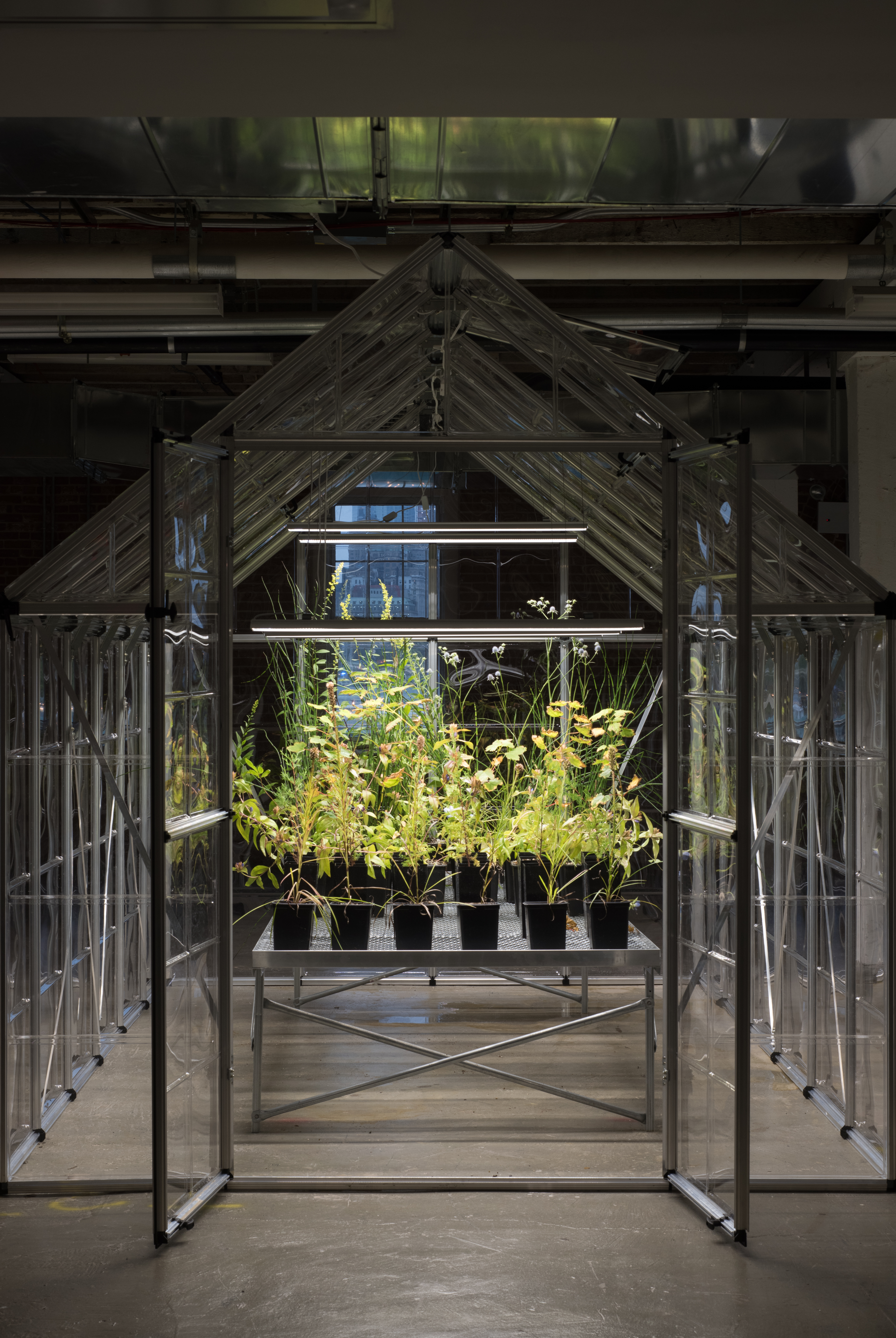 In the gallery at LMCC's Arts Center on Governors Island, four greenhouses contain a selection of plant, lichen and algae species historically documented in the natural environments of New York City, but which no longer grow wild in any of the city's five boroughs. In the months leading up to the exhibition, Wang researched, sourced, planted and tended to seeds and seedlings of these former New York City natives in his garden and studio in Upper Grandview, New York. Throughout the duration of the exhibition, these organisms are sustained within a laboratory-like installation under the care of a team of Arts Center staff, local students and volunteers. The artist intends for the plants to remain in the city after the close of the exhibition, in the managed spaces of urban gardens – re-introduced to the lands where they once grew wild, but persisting now only under human care.