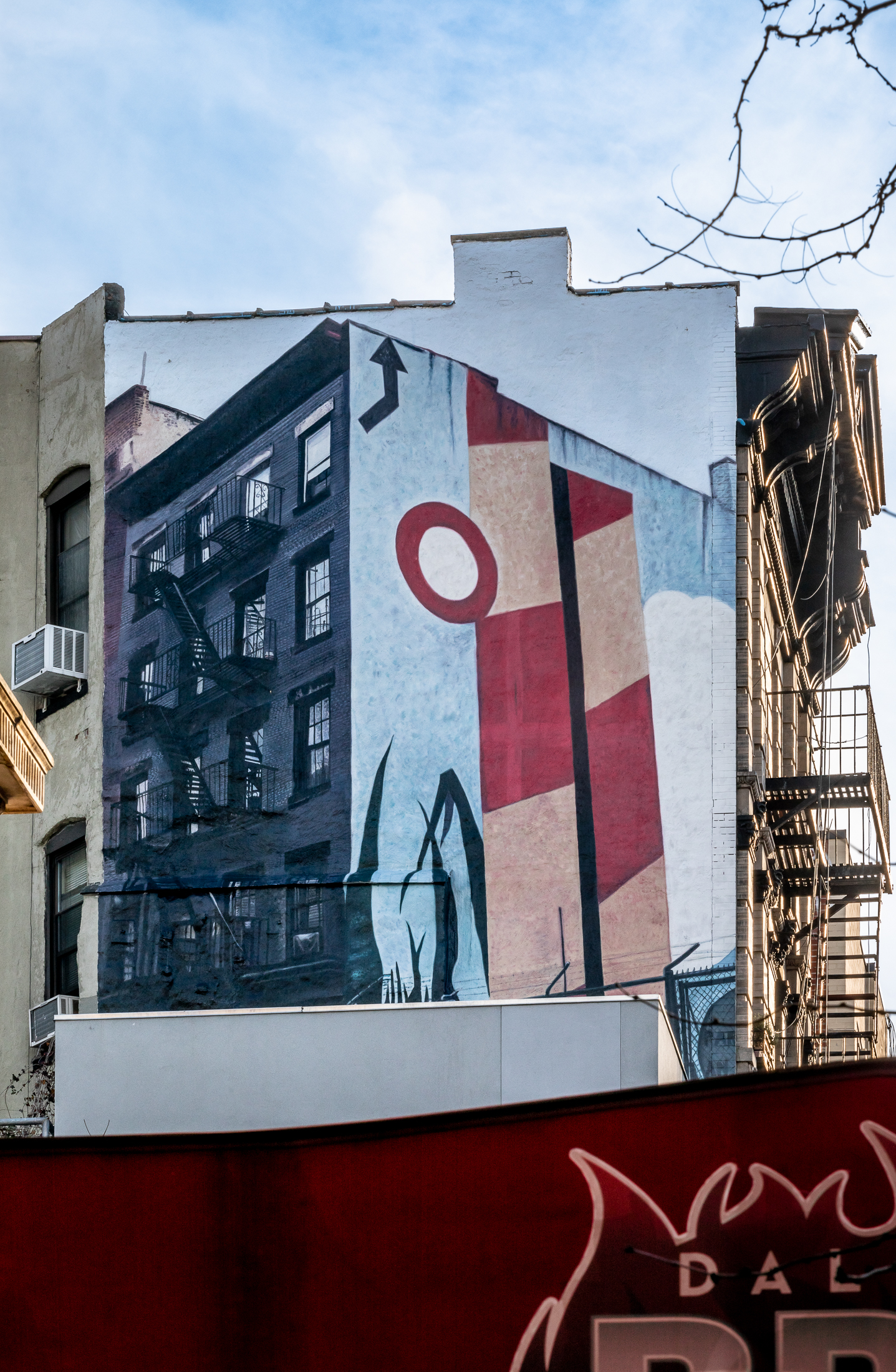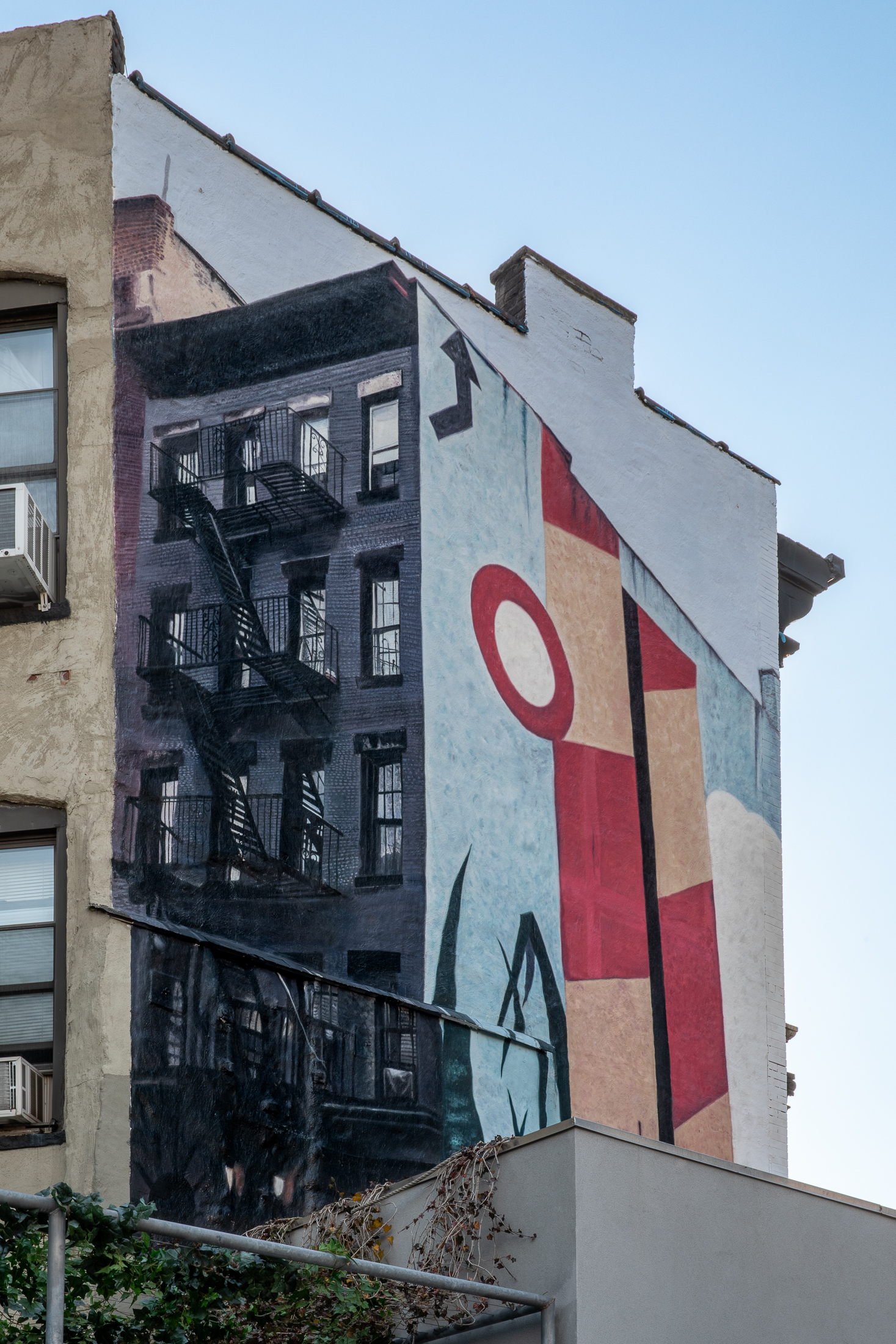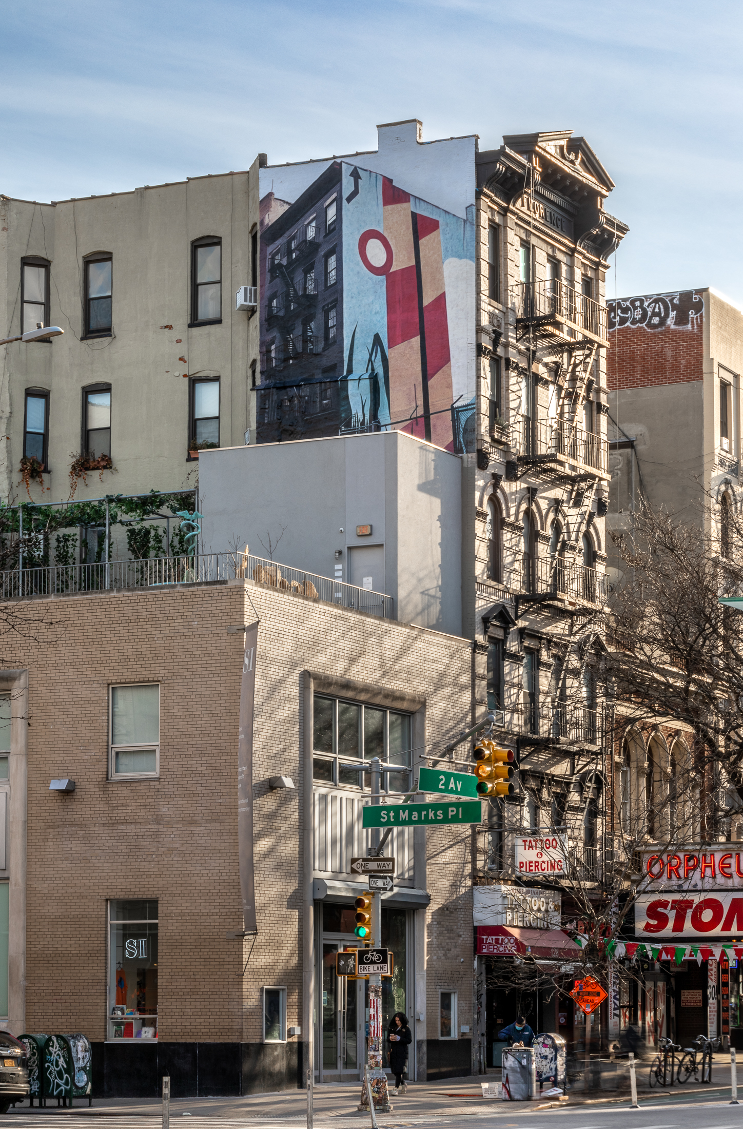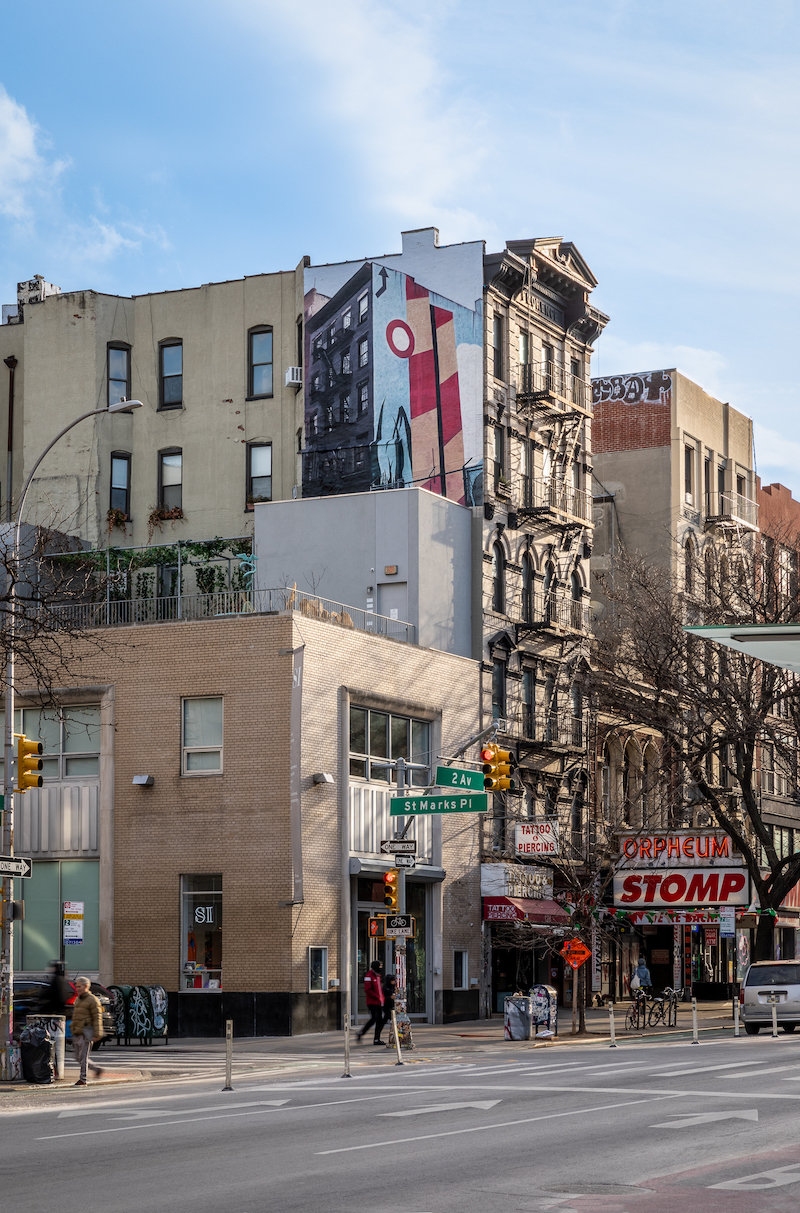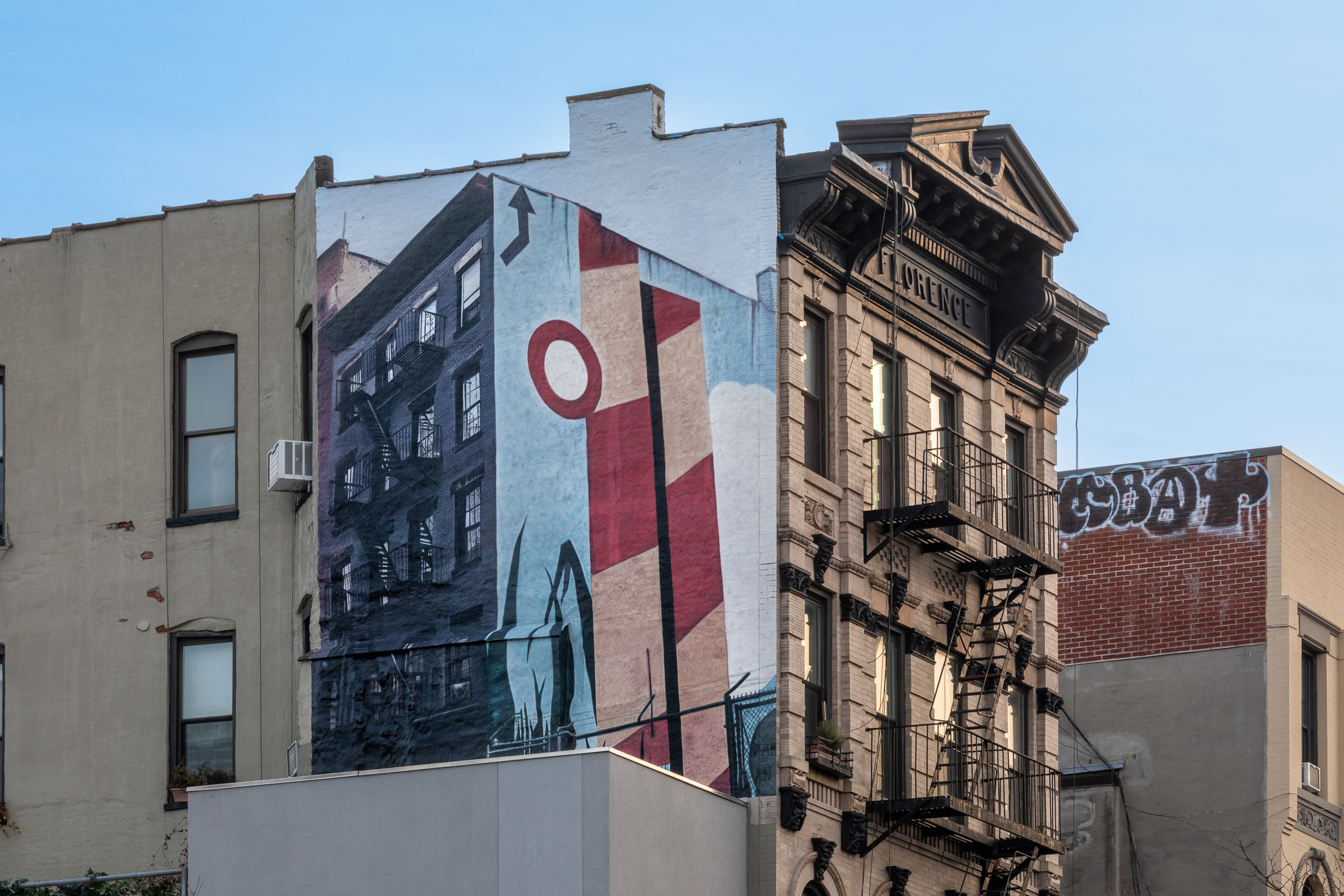 Swiss Institute is honored to present 340 E. 9th Street by East Village-based artist Megan Marrin, the first in a series of mural commissions on the uptown-facing exterior of SI’s neighboring building at 128 2nd Avenue. 340 E. 9th Street is a painting of a photograph that accompanies an article published in the April 29, 1968 issue of New York Magazine about the spread of public art across New York City. In the image, the building located at the titular address is shown in profile, adorned on its windowless side with a mural by pop-surrealist Allan D’Arcangelo (1930-1998).