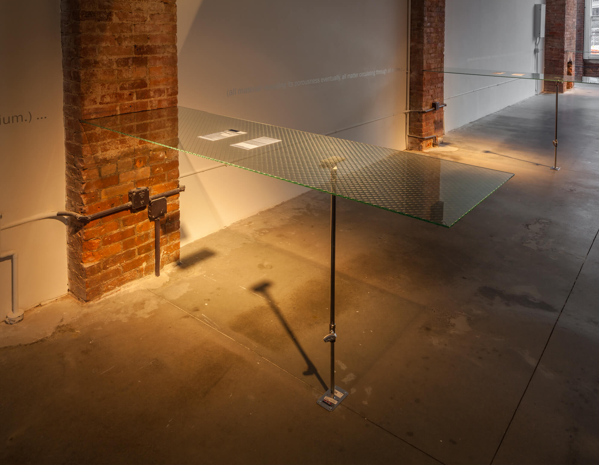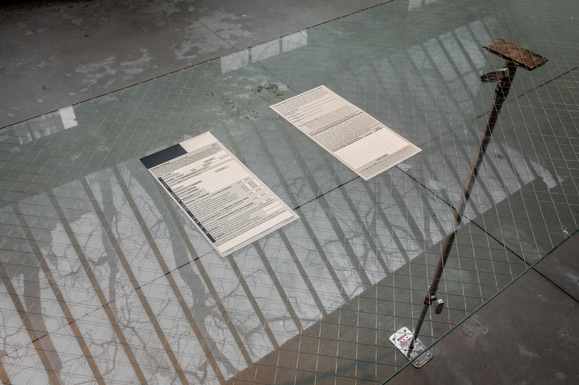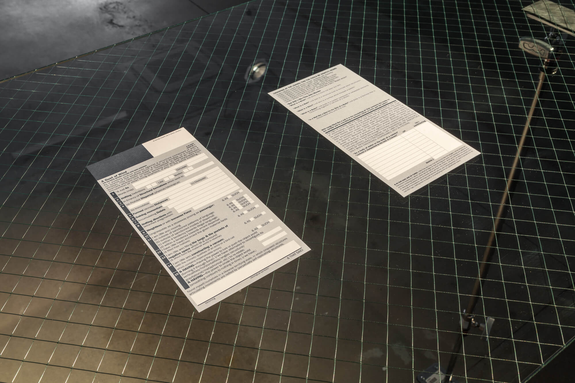 The first play, & faintly heard (as it sinks, slowly):, by Studio for Propositional Cinema, is installed in the exhibition space as a wall text, printed documents, and scenographic elements. The play is enacted by the spectator as they read and traverse the space, and contains four monologues by the play’s central characters – A BAND of RATS, A GUST of WIND, A COPPER-GLEANER, and A PANE of GLASS. Their soliloquies are printed in the style of the US Immigration Customs Declaration form, a legal document that must be filled in by all persons entering the country.