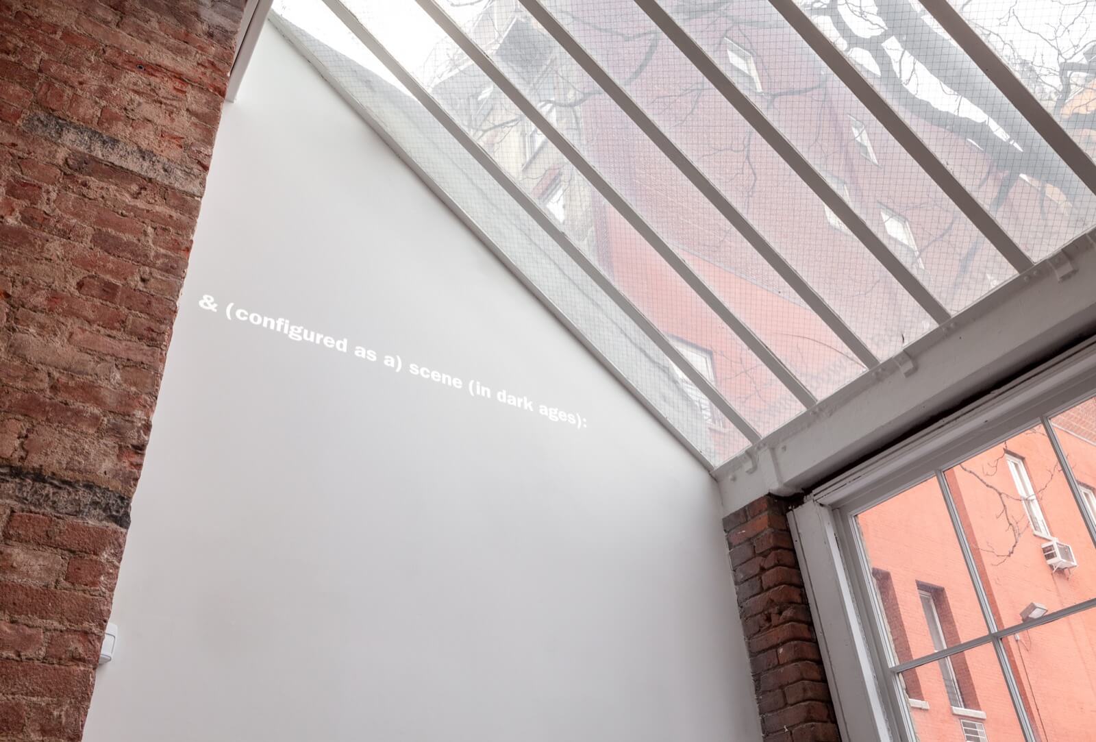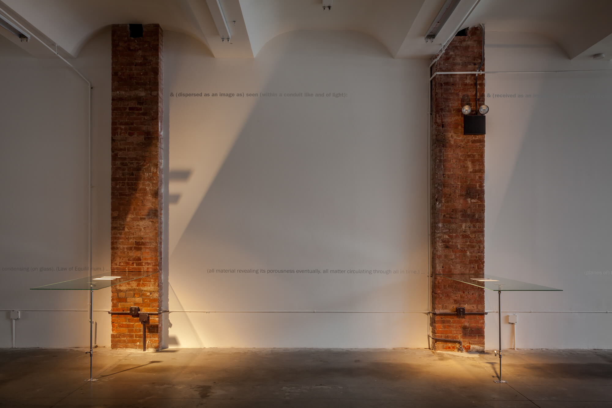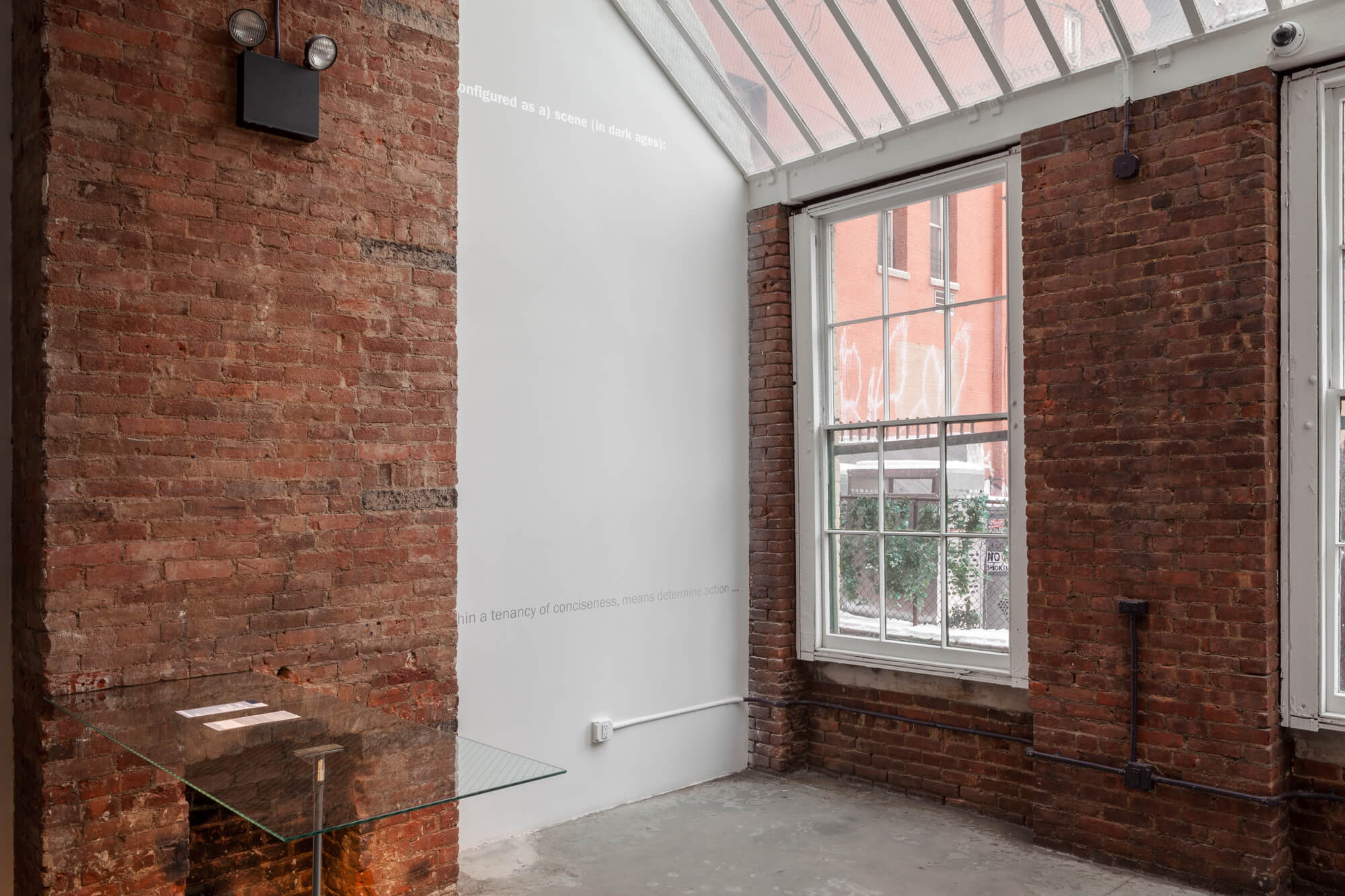 The installation concludes with The Tenderness of Maggots, a theatrical adaptation of Comte de Lautréamont’s (1846-1870) brutal, proto-Surrealist novel Les Chants de Maldoror, re-edited and re-configured for the stage by Studio for Propositional Cinema. Beginning with a short speech during the opening reception, and performed each Saturday during the duration of the exhibition, the narrator of the text gleefully confesses his gruesome and evil acts on a glass stage behind a "curtain" of text asking: AS WE ENTER UNWANTED FUTURES: ARE VIRUSES NOT ALSO SEEKING CONNECTIONS?: DO MAGGOTS NOT ALSO HAVE MOMENTS OF TENDERNESS?: &: WHAT CAN WE BUILD IN AN AGE OF WALLS?: WHAT CAN WE DISMANTLE IN AN AGE OF EROSION?…