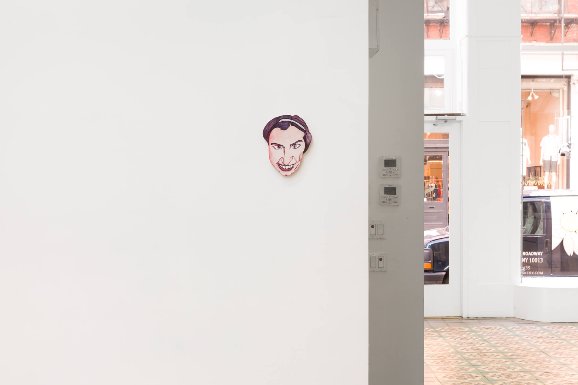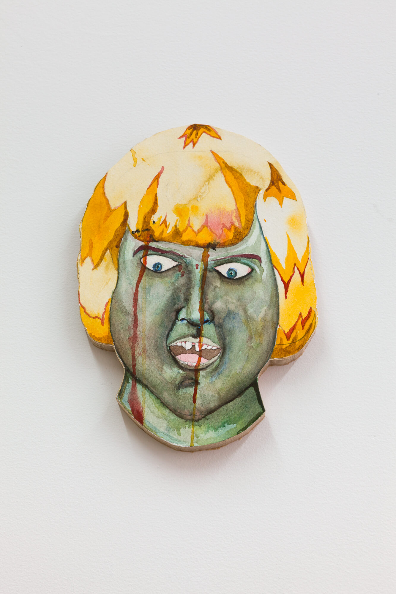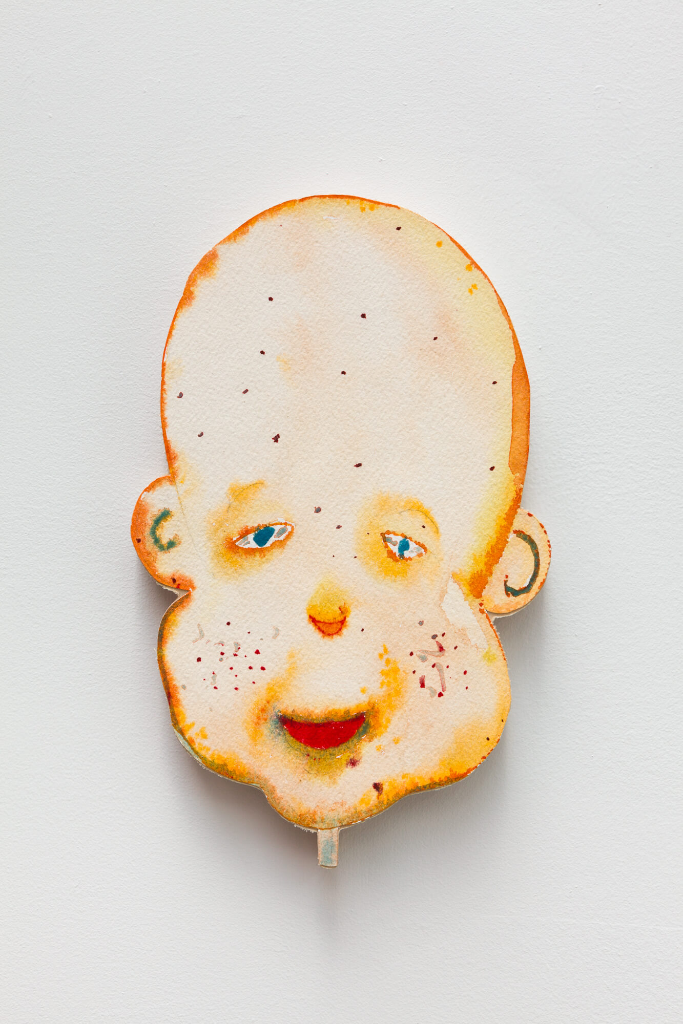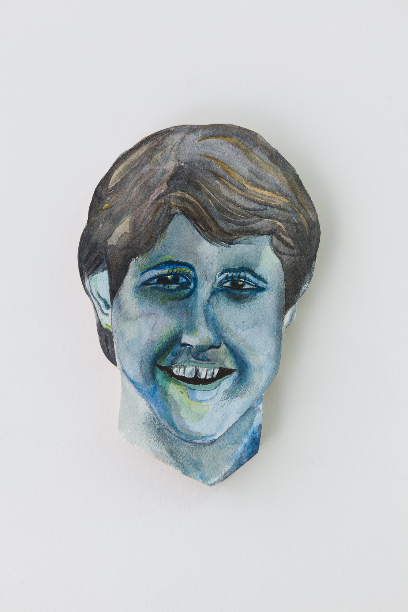 Populating the gallery, there are also a number of masklike watercolor paintings of real and imagined faces by Calame, which are paired with contributions by artists Hugo Baud and Alan Schmalz. These are accompanied by the latest of Calame’s motorized sculptures, an authoritative figure who surveys the space, wildly jerking its head – conveying a looming sense of political horror.